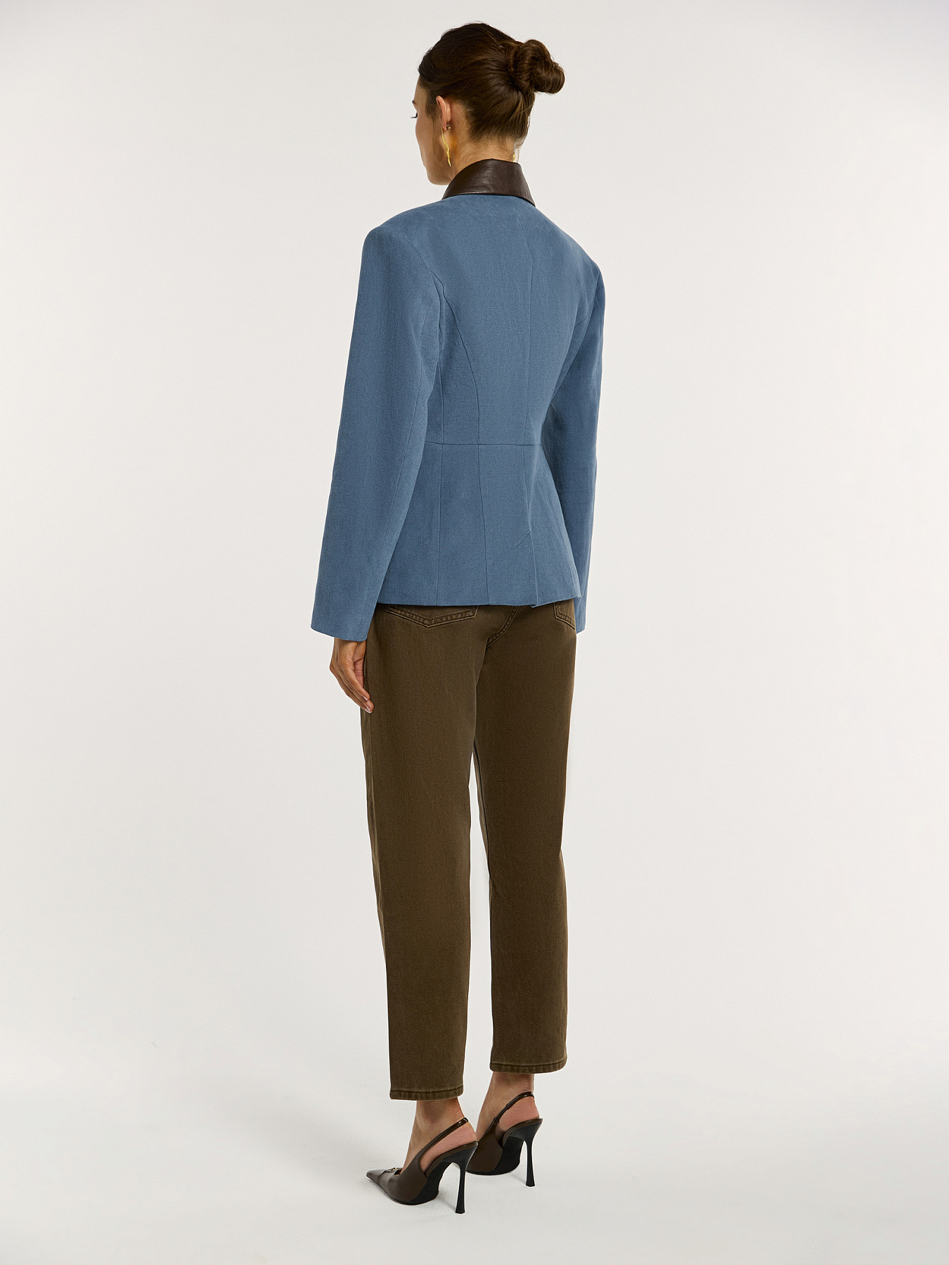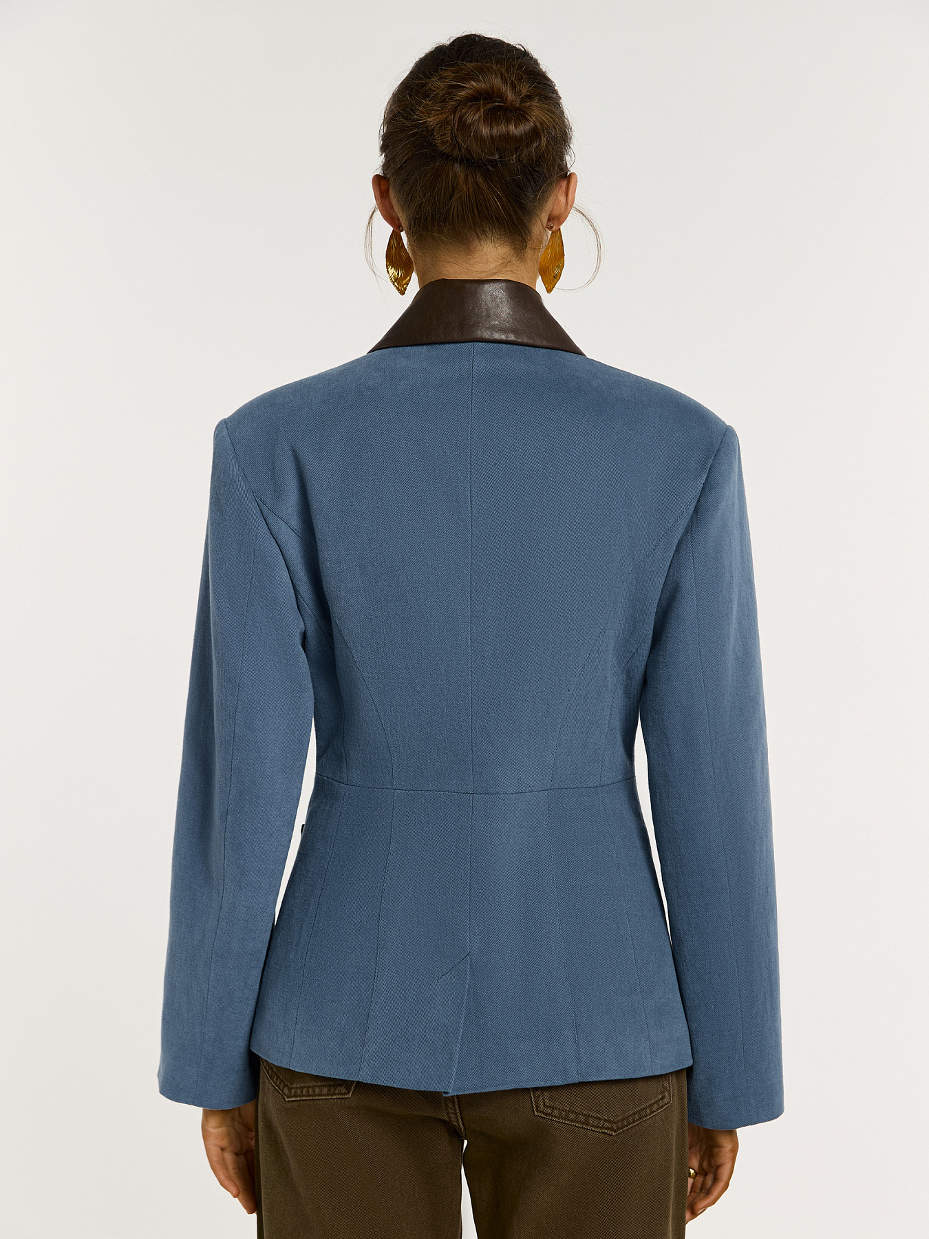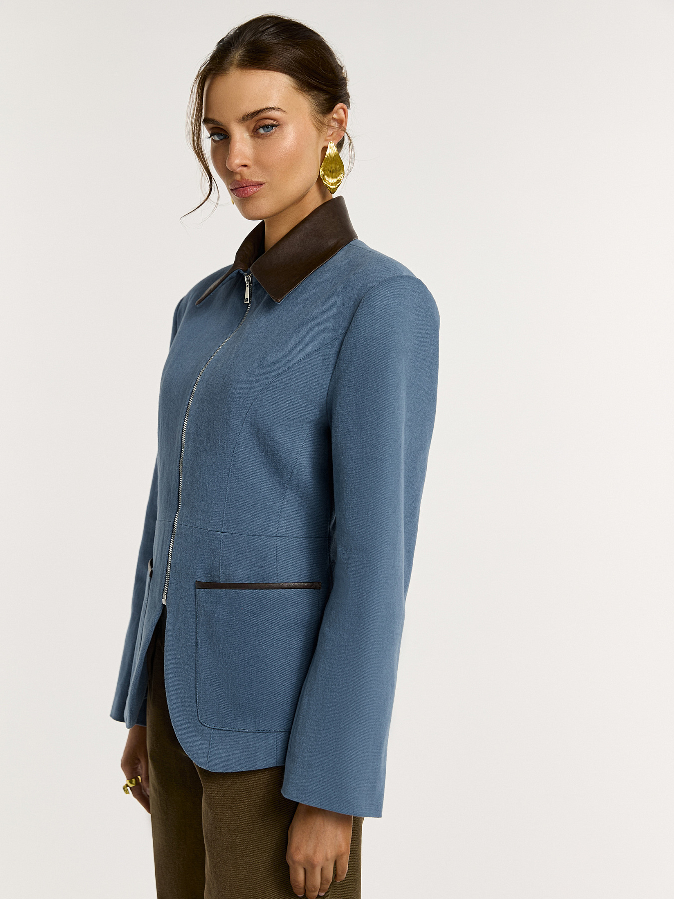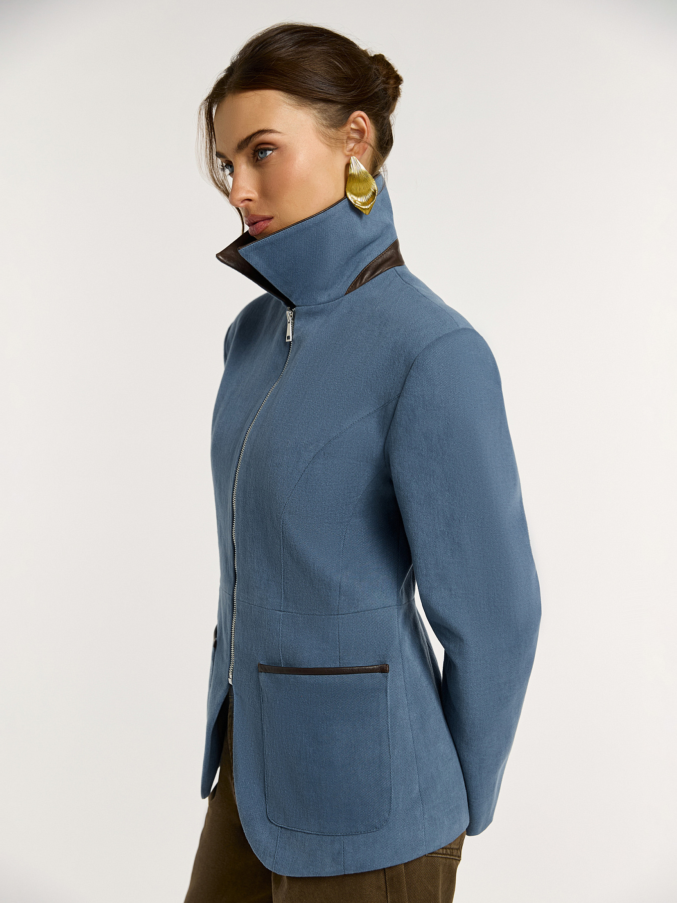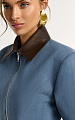 Выполнена из плотного хлопкового денима с мягким велюровым эффектом. Бархатистая фактура красиво держит форму и подчеркивает четкость линий. Отложной воротник на стойке дополнен отделкой из натуральной кожи в шоколадном оттенке: внешняя часть и стойка создают выразительный контраст. Линия плеч акцентирована подплечниками, формируя структурный силуэт.