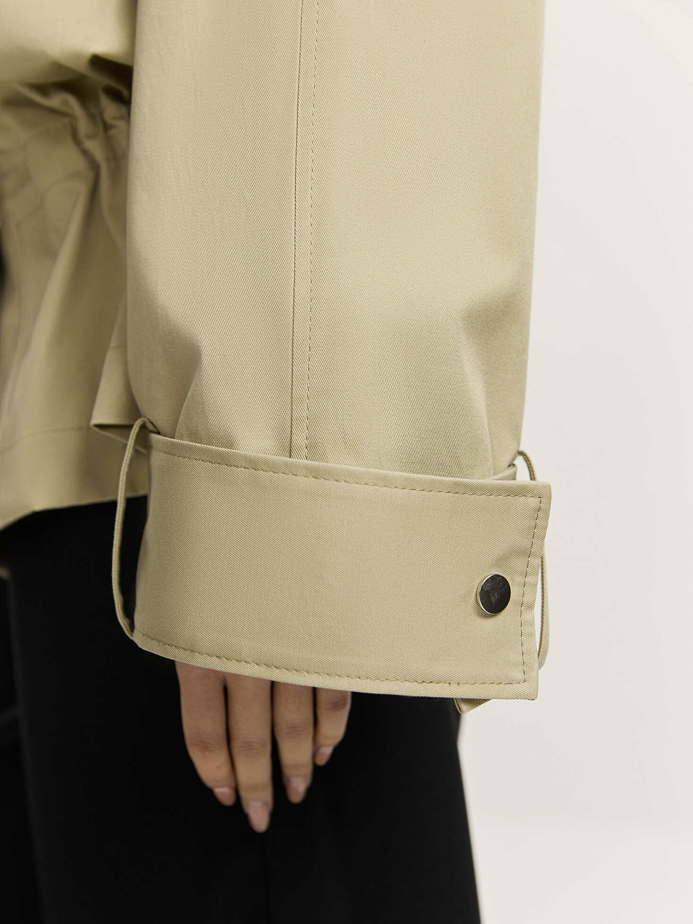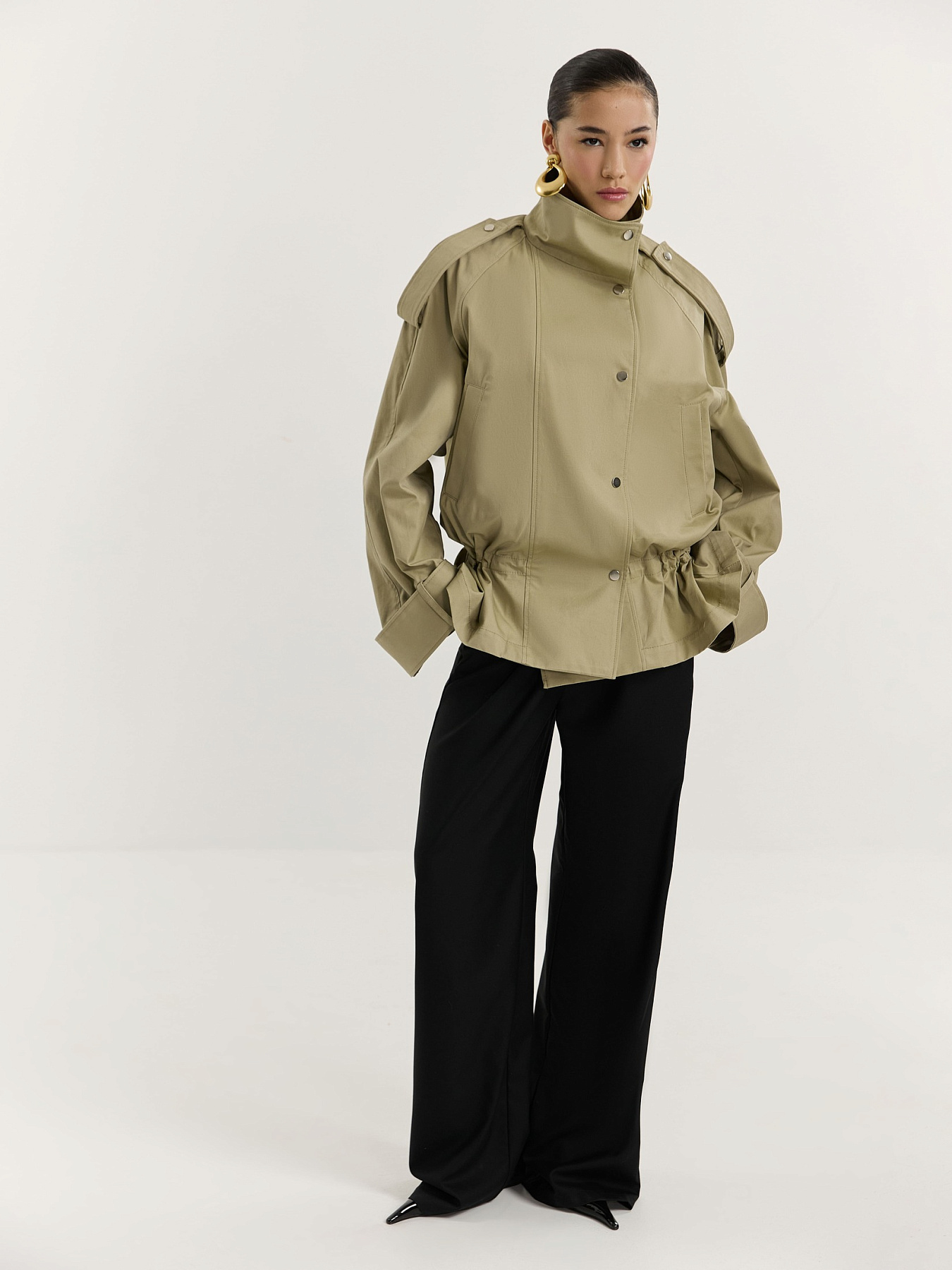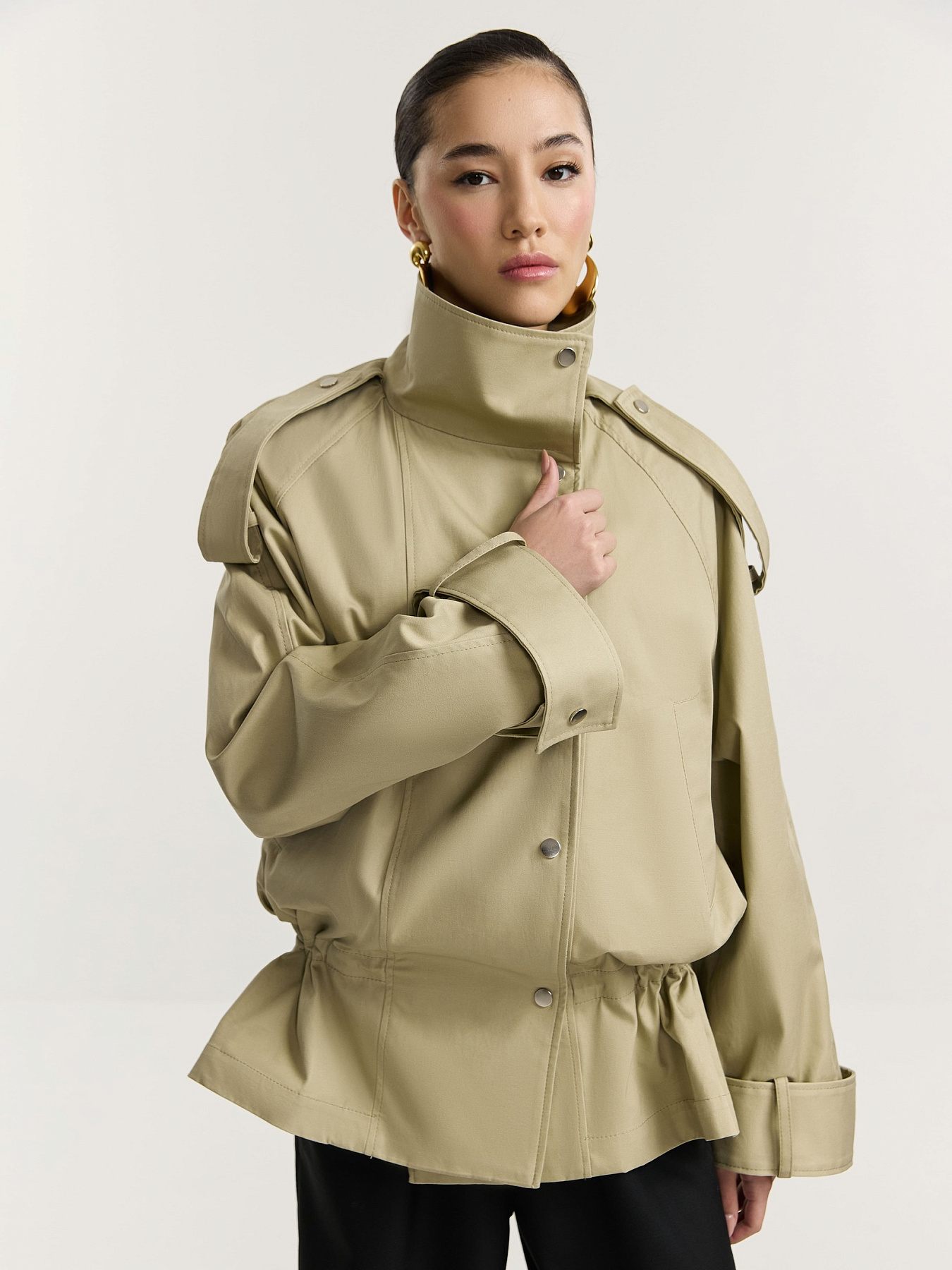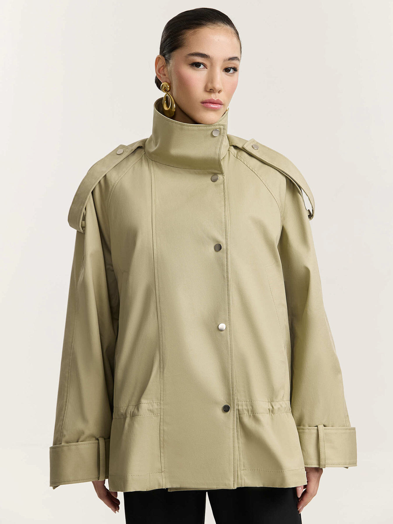 По рукавам, плечевым швам и стойке проходят широкие паты на металлических кнопках, добавляющие изделию графичности.