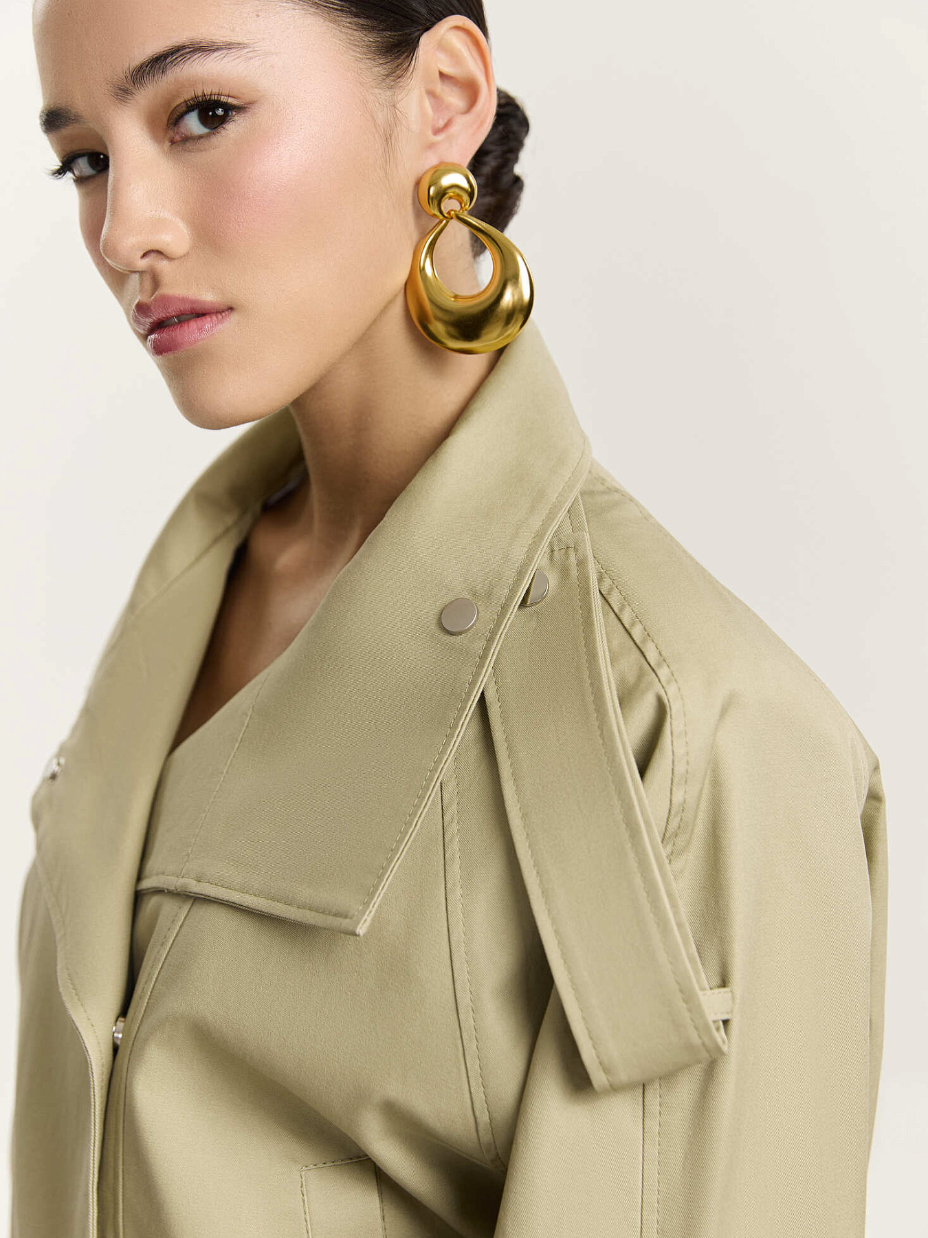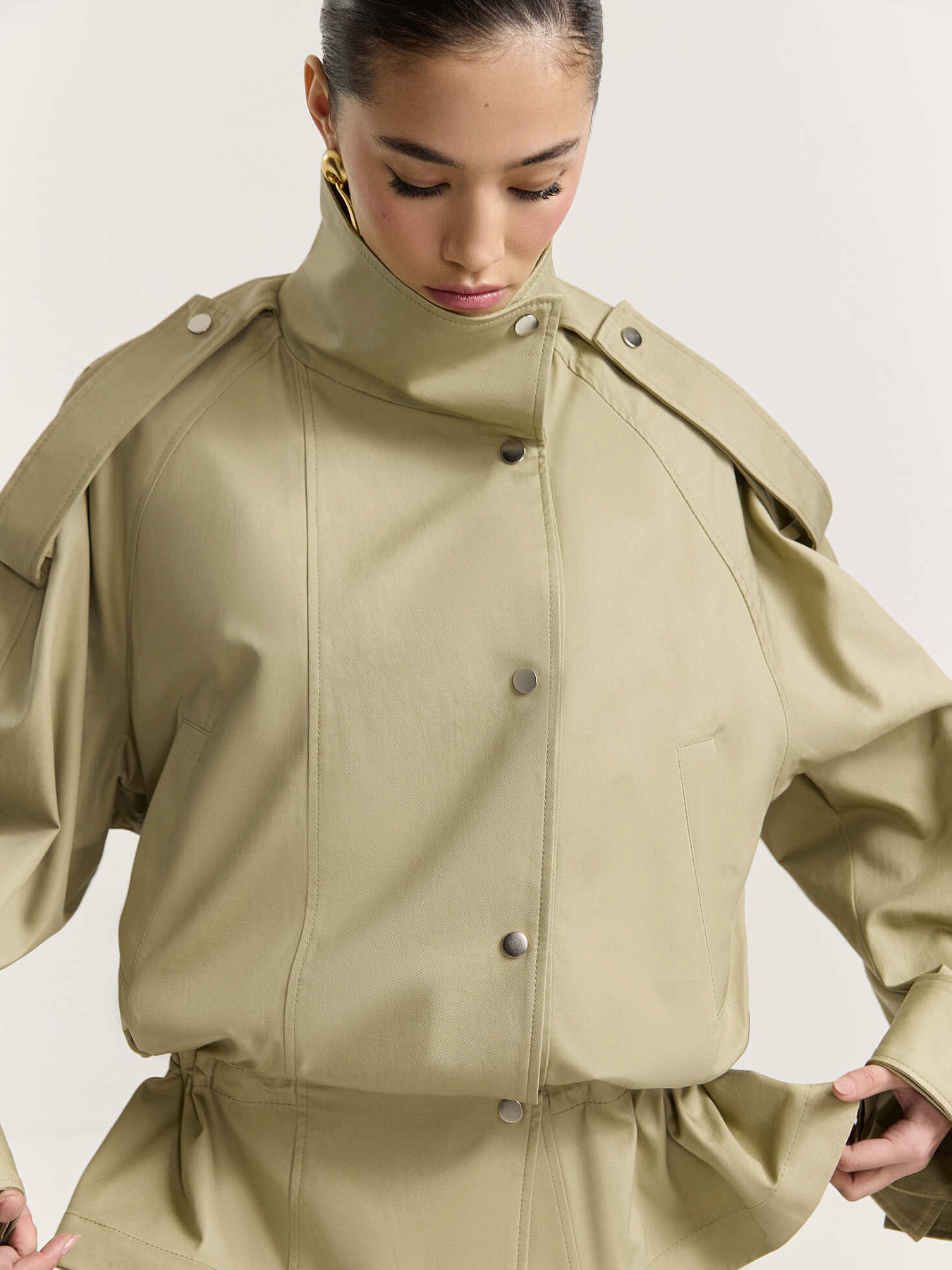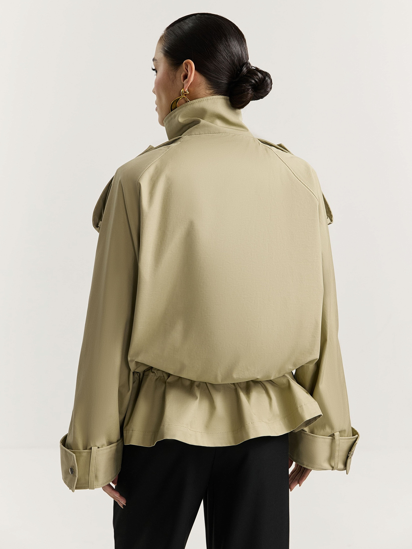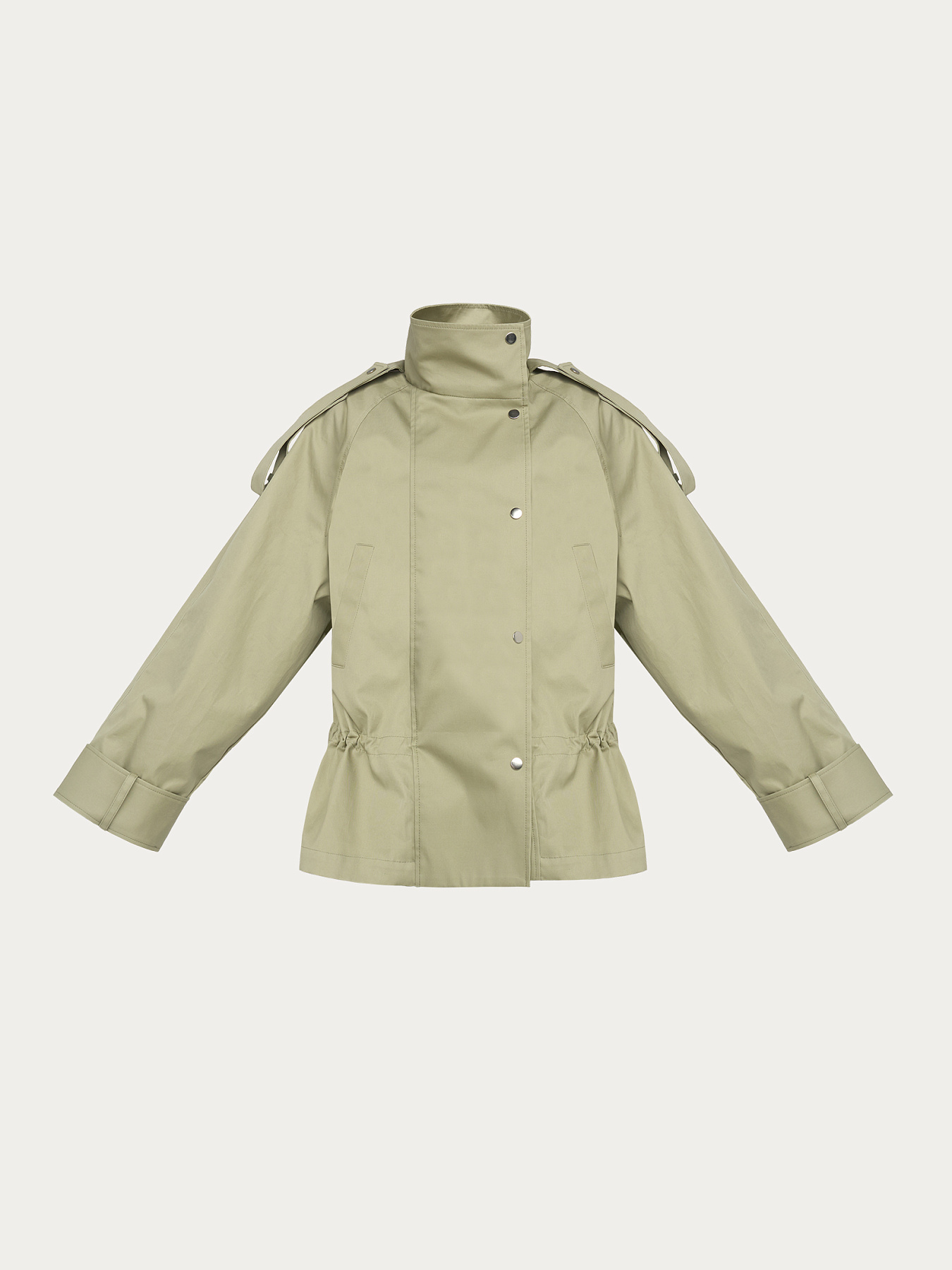 По рукавам, плечевым швам и стойке проходят широкие паты на металлических кнопках, добавляющие изделию графичности.