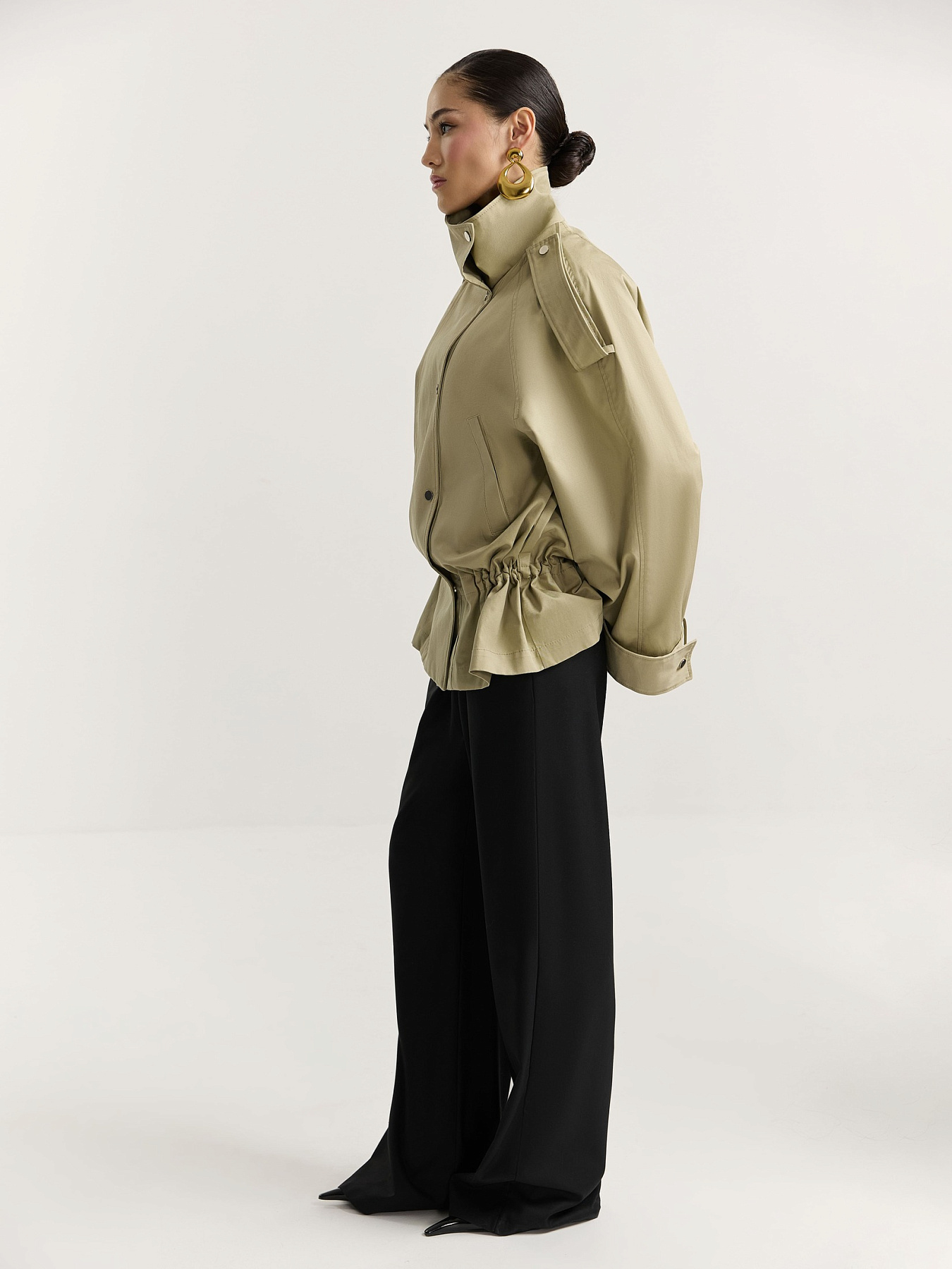 На уровне бедер расположена кулиса с резинкой и регулятором, который фиксируется с изнаночной стороны, позволяя менять посадку и собирать объем.