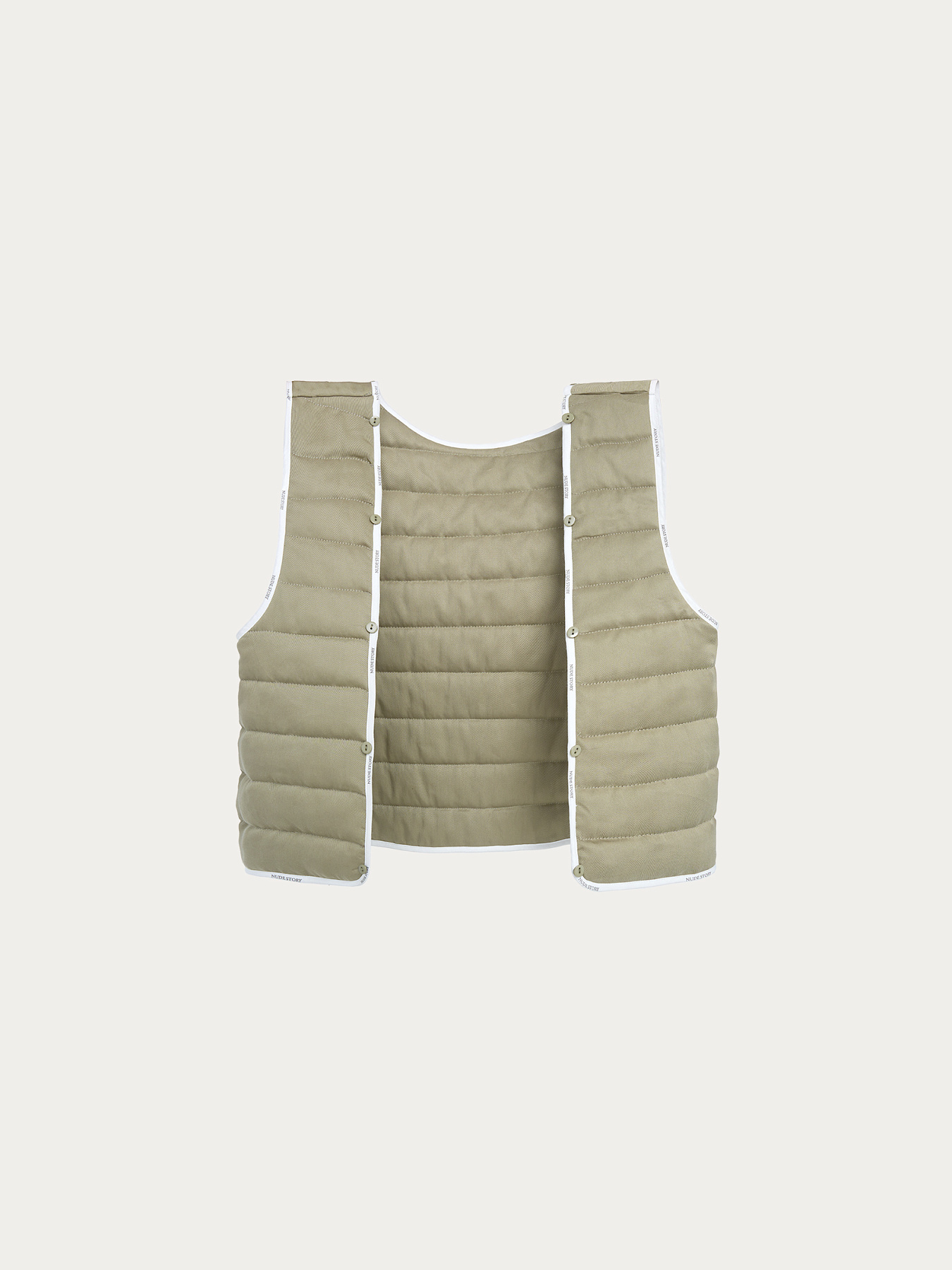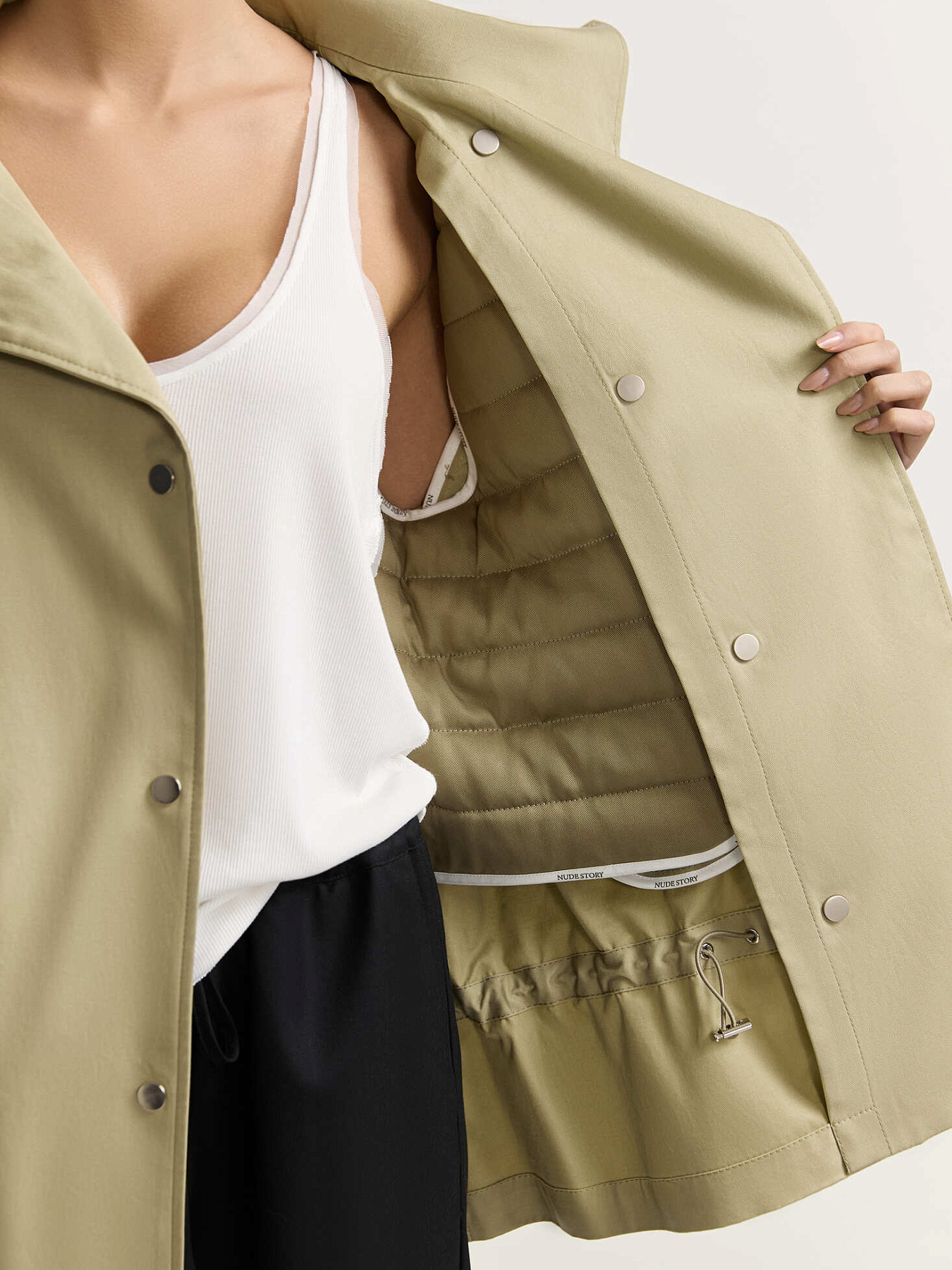 Парка без подклада: швы аккуратно закрыты брендированной косой бейкой. Внутри предусмотрен стеганый жилет из шелковистой вискозы, который крепится с изнаночной стороны на пуговицы и петли.