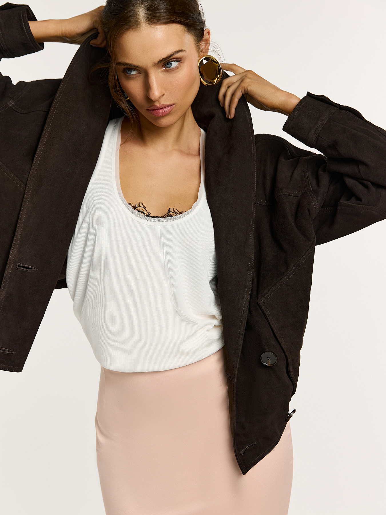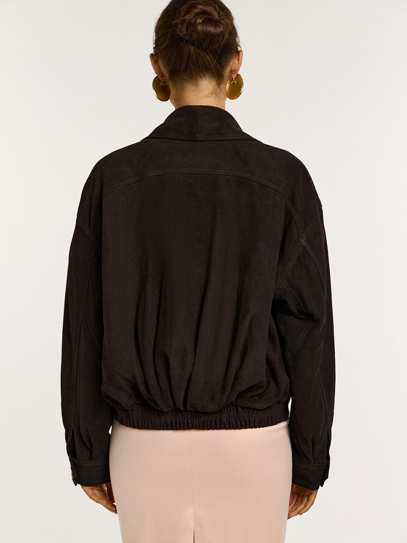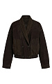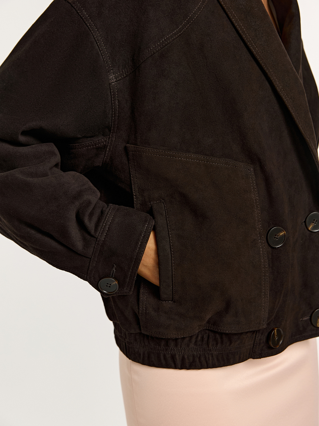 Утепленная куртка из натуральной овчинной замши в насыщенном коричневом оттенке. Шалевый воротник можно поднять и зафиксировать у горловины — внутри предусмотрена скрытая магнитная кнопка, которая защищает область шеи и груди в холодную погоду.