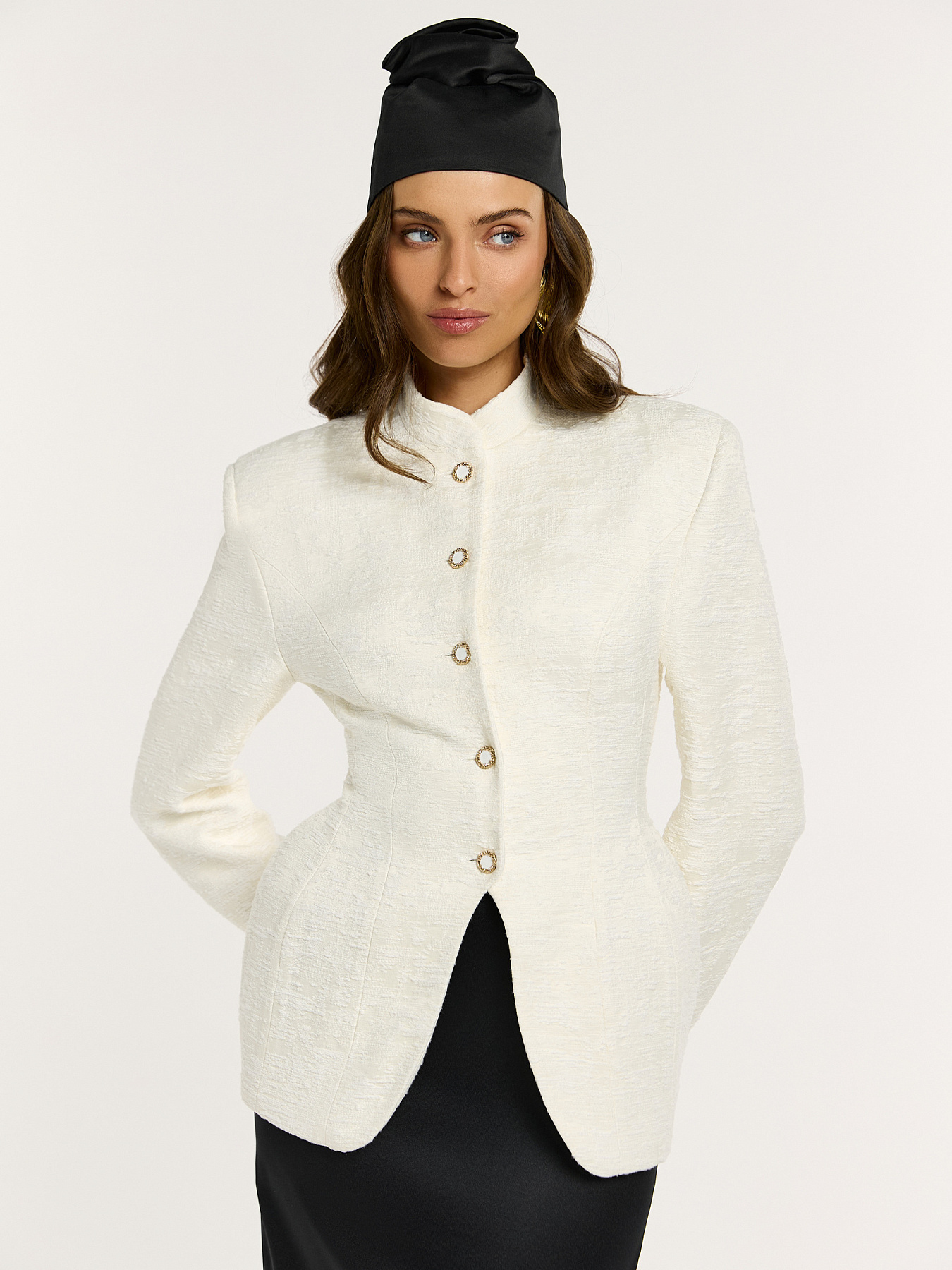 Чалма ручной работы Noche из итальянского кади в глубоком черном цвете с дизайнерской деталью в виде бутона.