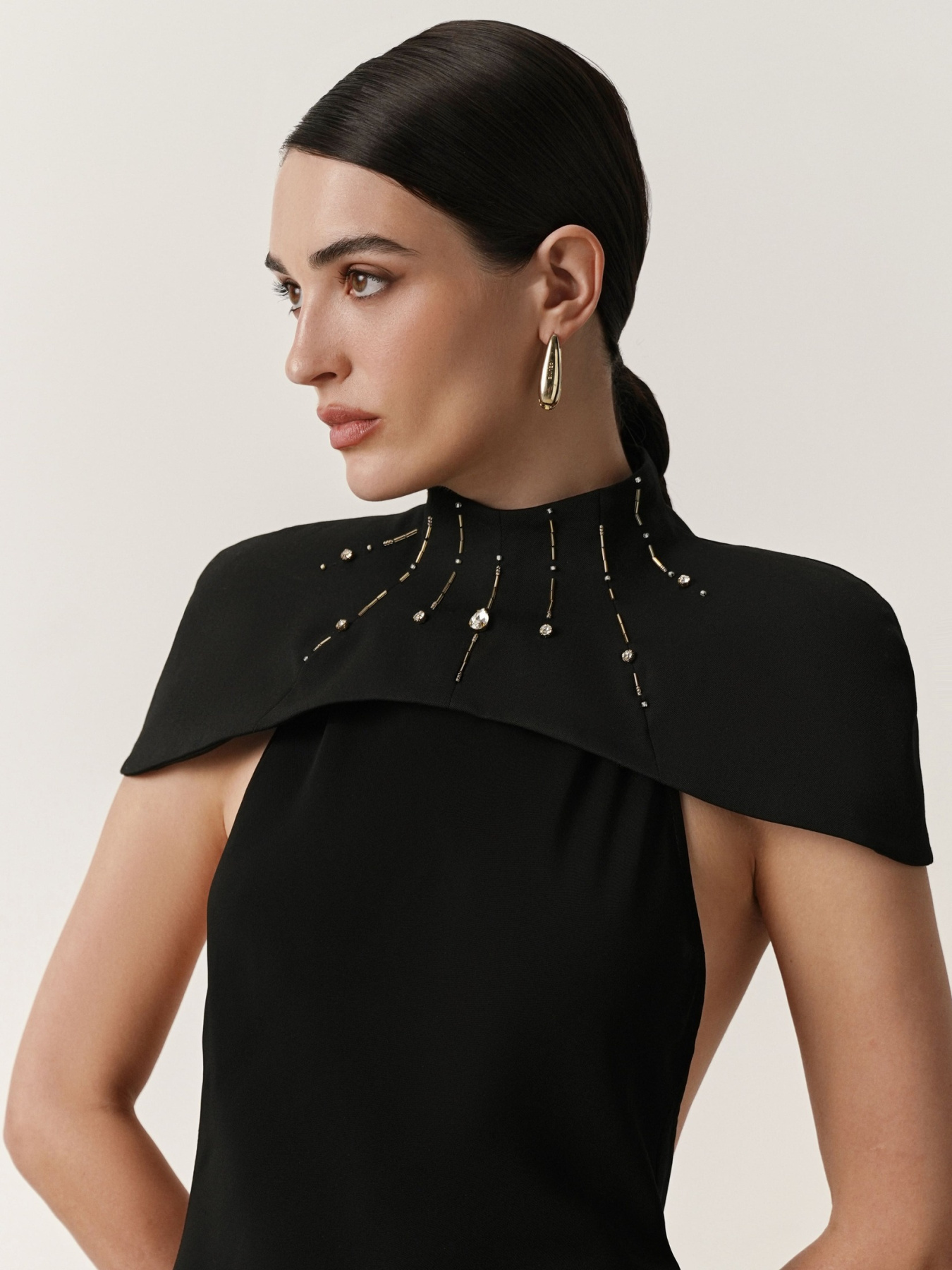 От верхнего среза горловины расходится ручная вышивка из бисера и камней в золотистом оттенке — рисунок создан индивидуально под каждое изделие и выполнен вручную нашими мастерами. Внутренняя часть оформлена подкладкой из основной ткани.