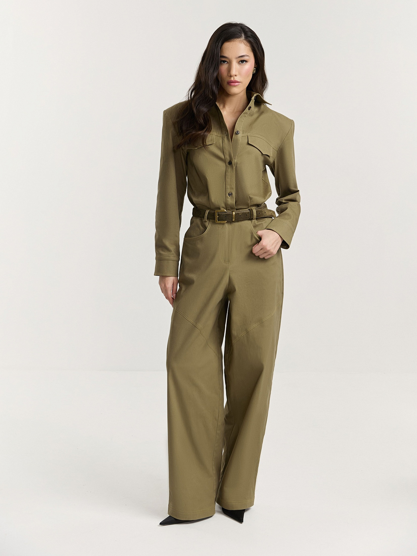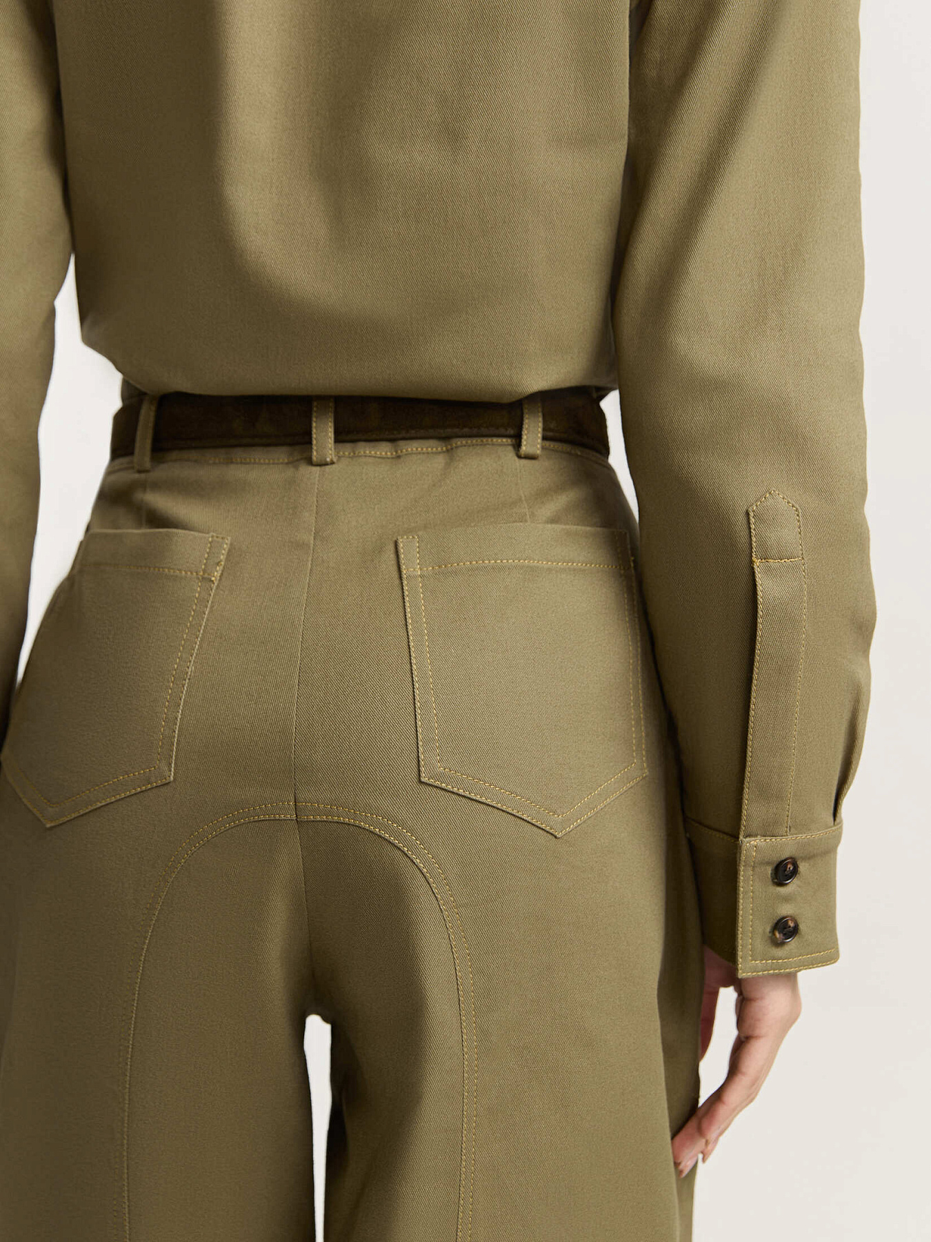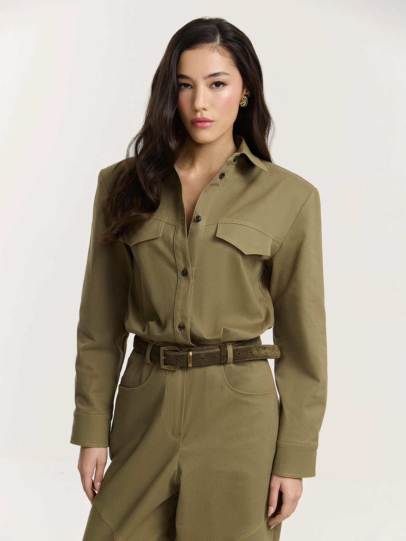 Ремень из премиальной натуральной замши в оттенке хаки. Металлическая пряжка античного цвета дополнена шлевкой в едином стиле.