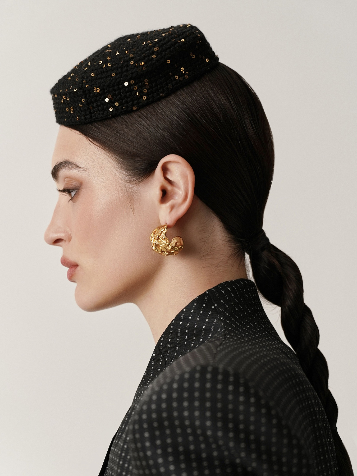 Тюбетейка ручной работы — переосмысление национального головного убора в современном контексте. Связана вручную из сочетания двух видов натуральной пряжи с добавлением деликатной золотистой пайетки, создающей мягкое свечение при движении.