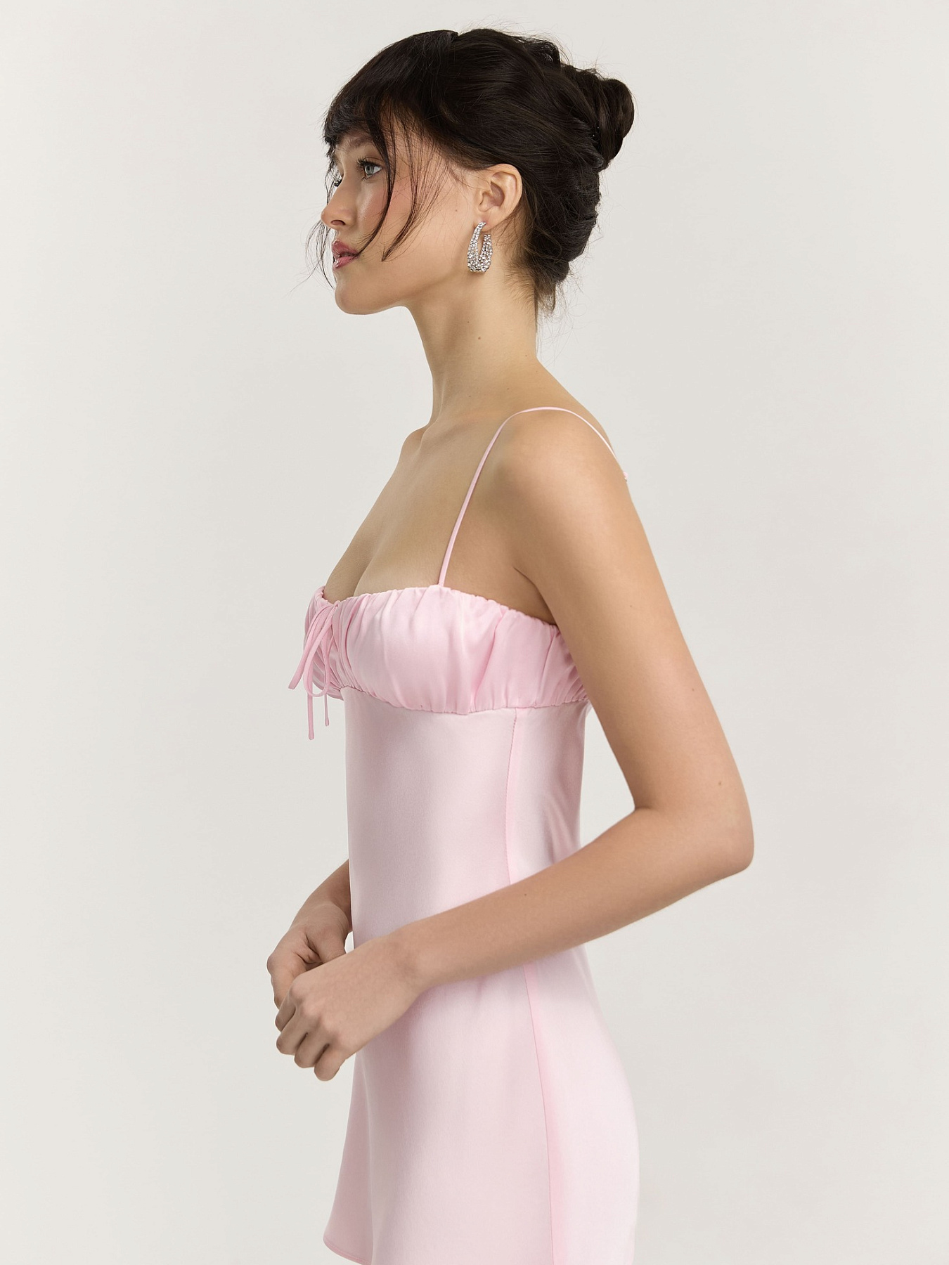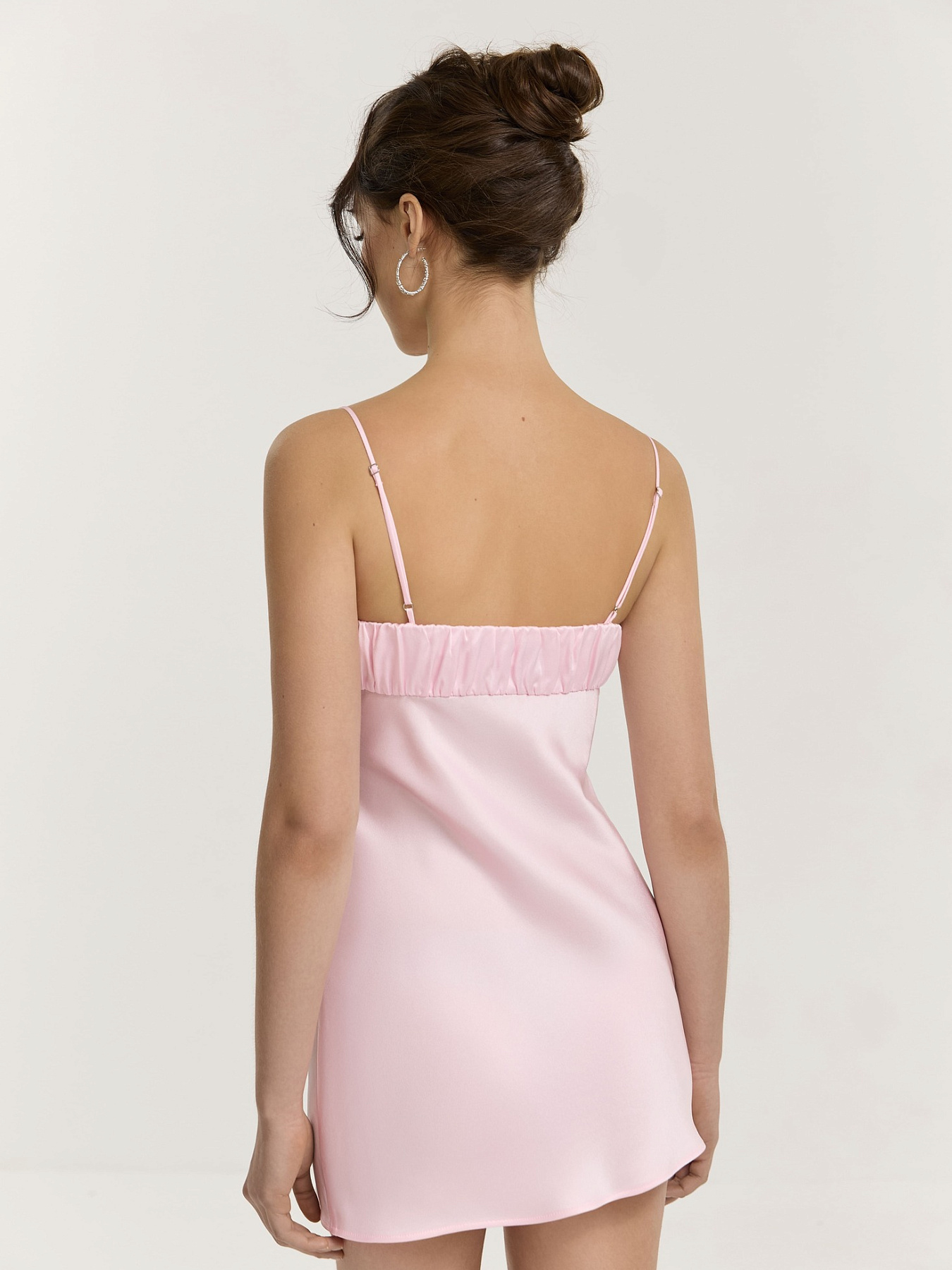 Комбинация из итальянской вискозной кади в нежно-розовом оттенке. Отрезной двойной лиф собран в деликатную сборку, создающую мягкие вертикальные складки и аккуратную посадку.