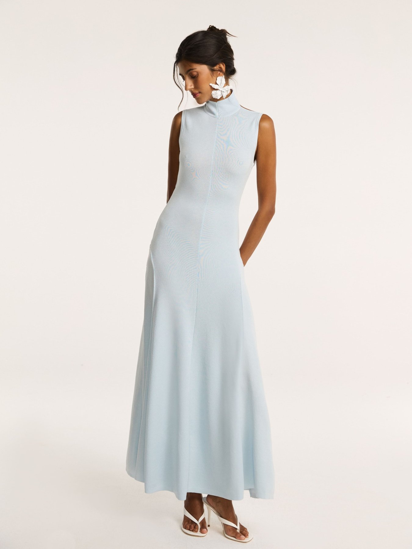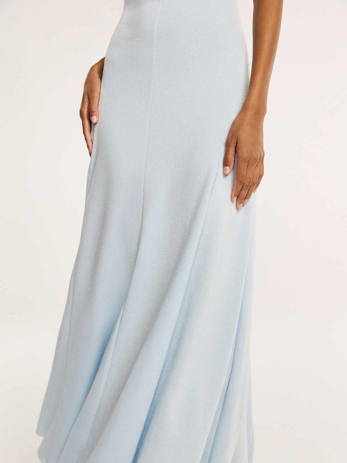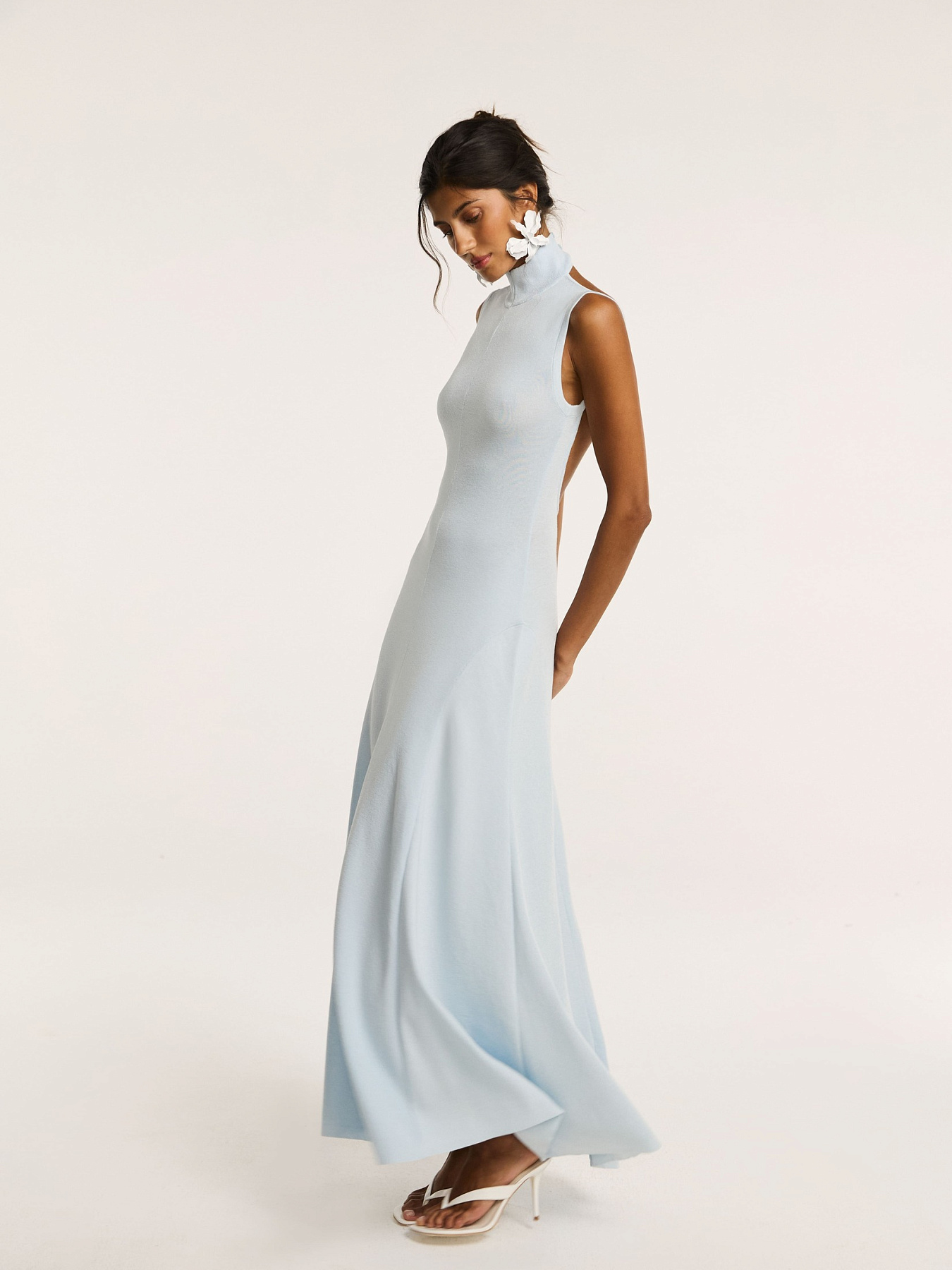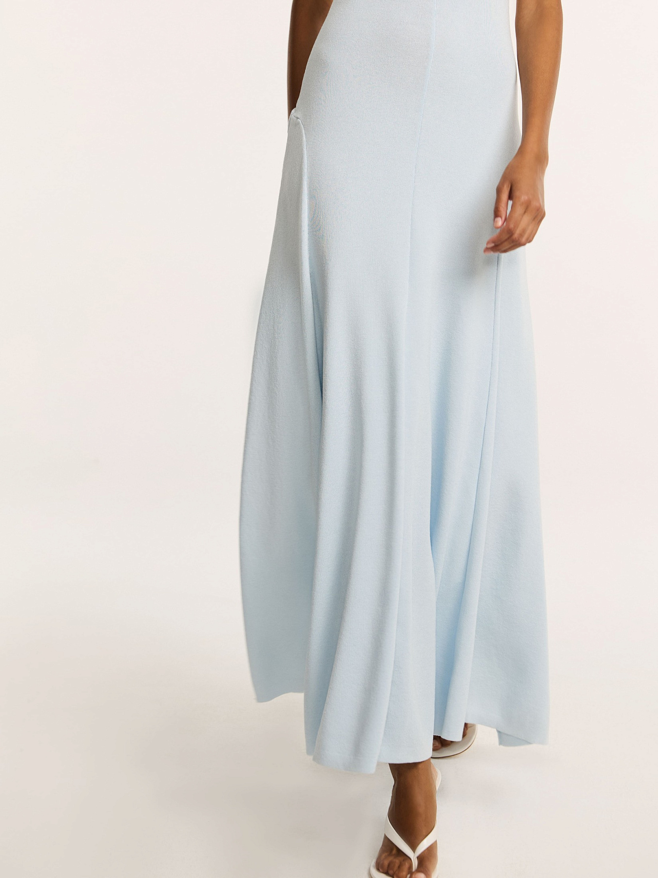 Трикотажное платье макси с открытой спинкой в голубом оттенке — модель, в которой женственность силуэта сочетается с выразительной конструкцией.