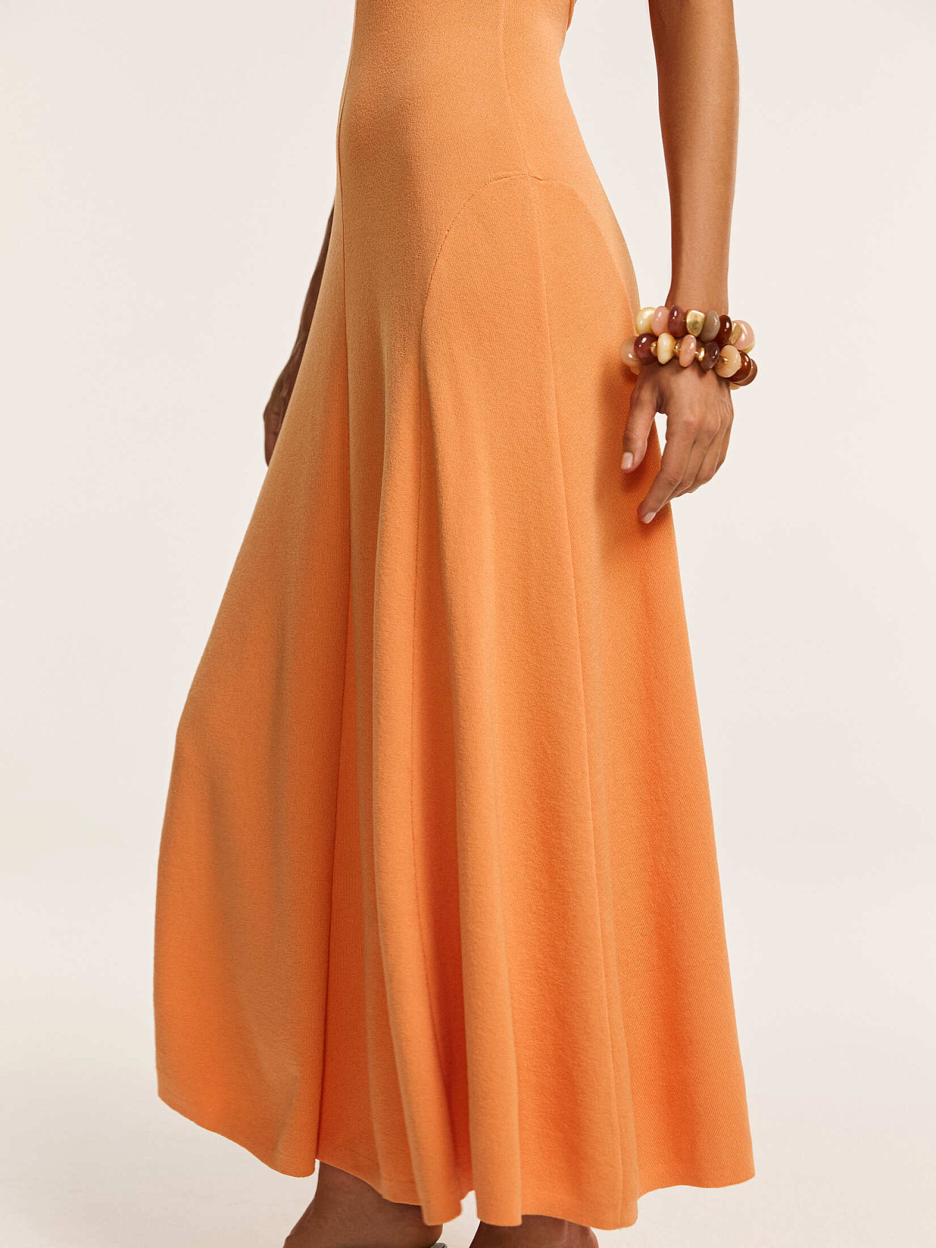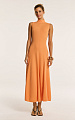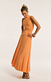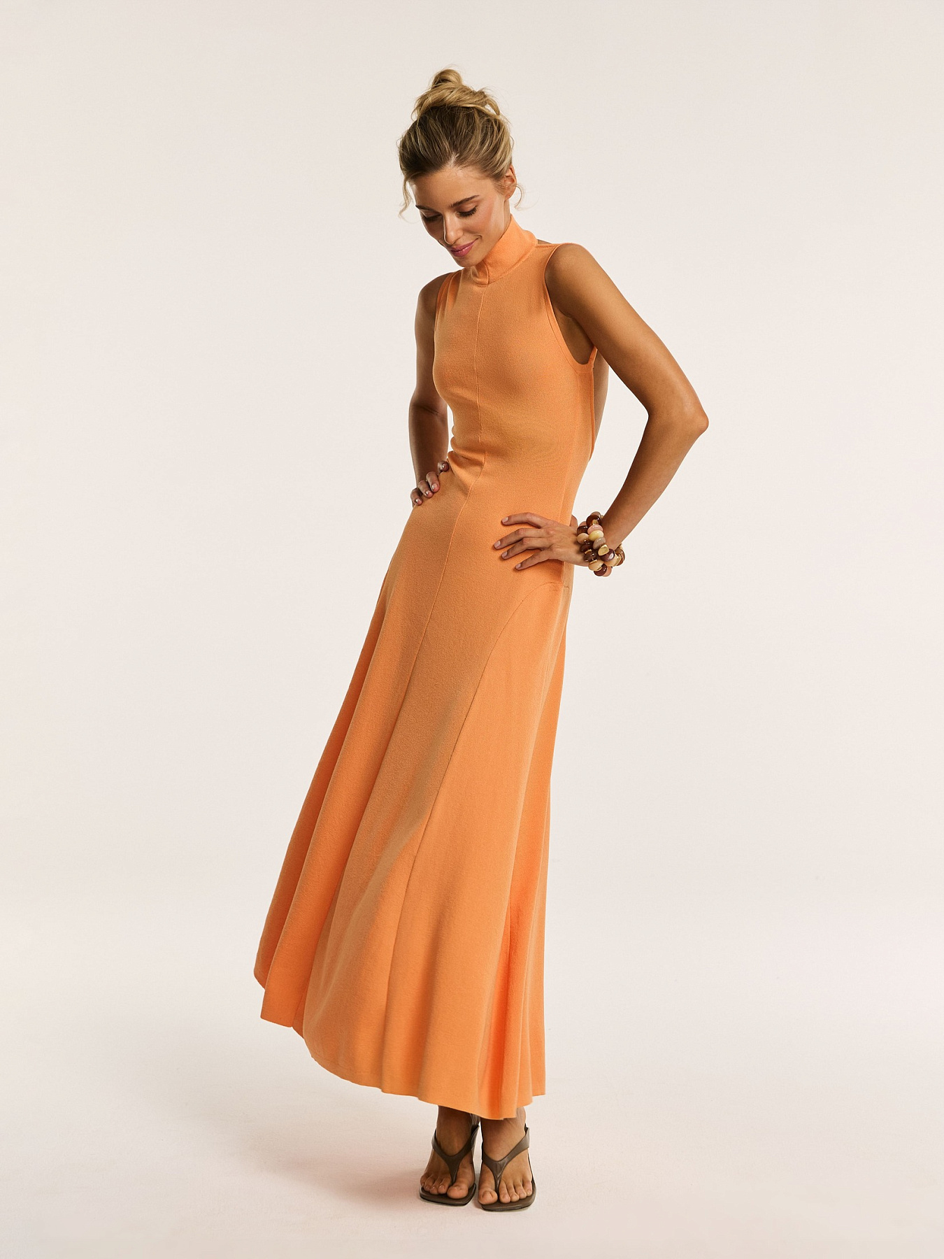 Трикотажное платье макси с открытой спинкой в апельсиновом оттенке — модель, в которой женственность силуэта сочетается с выразительной конструкцией.