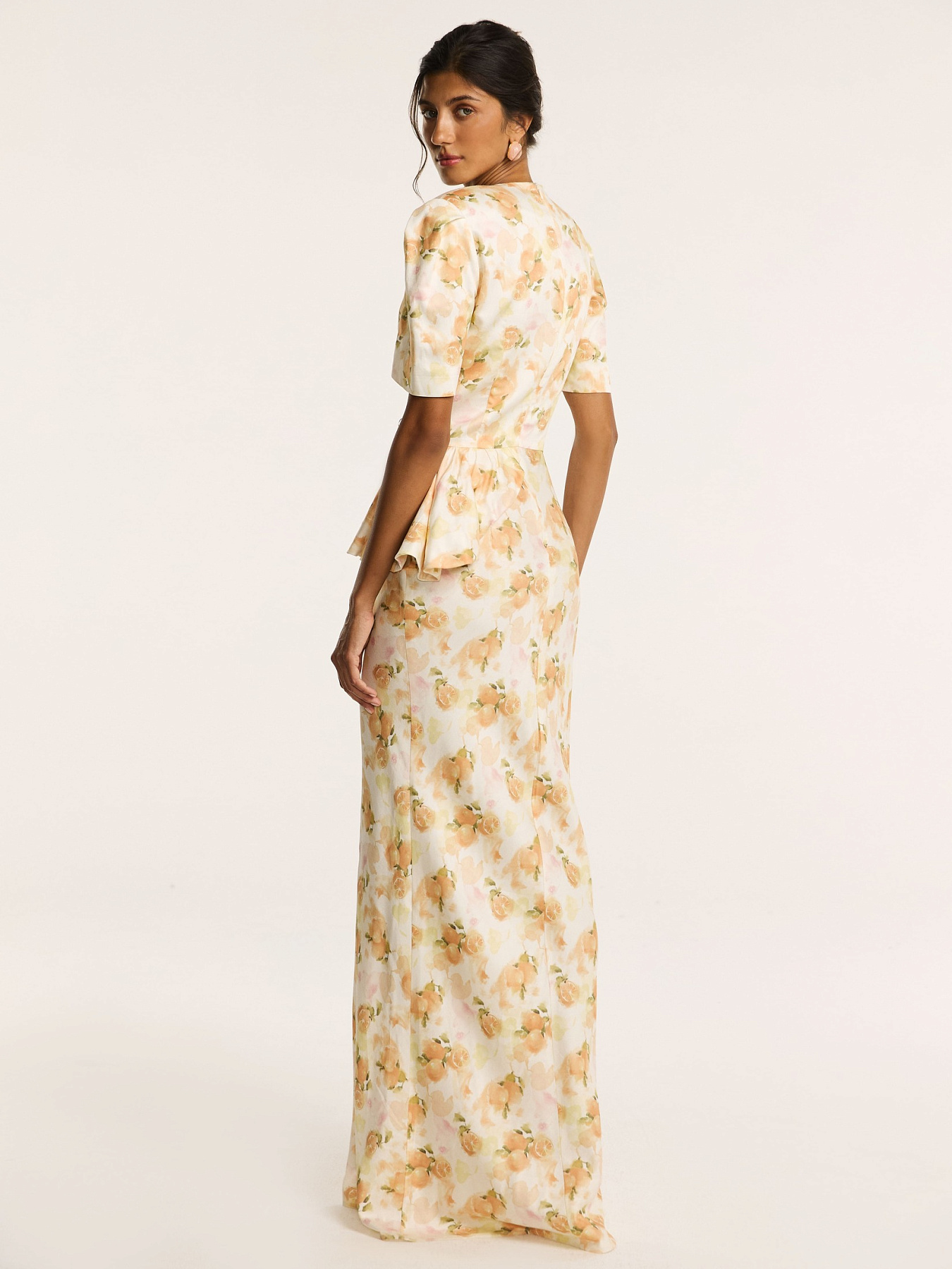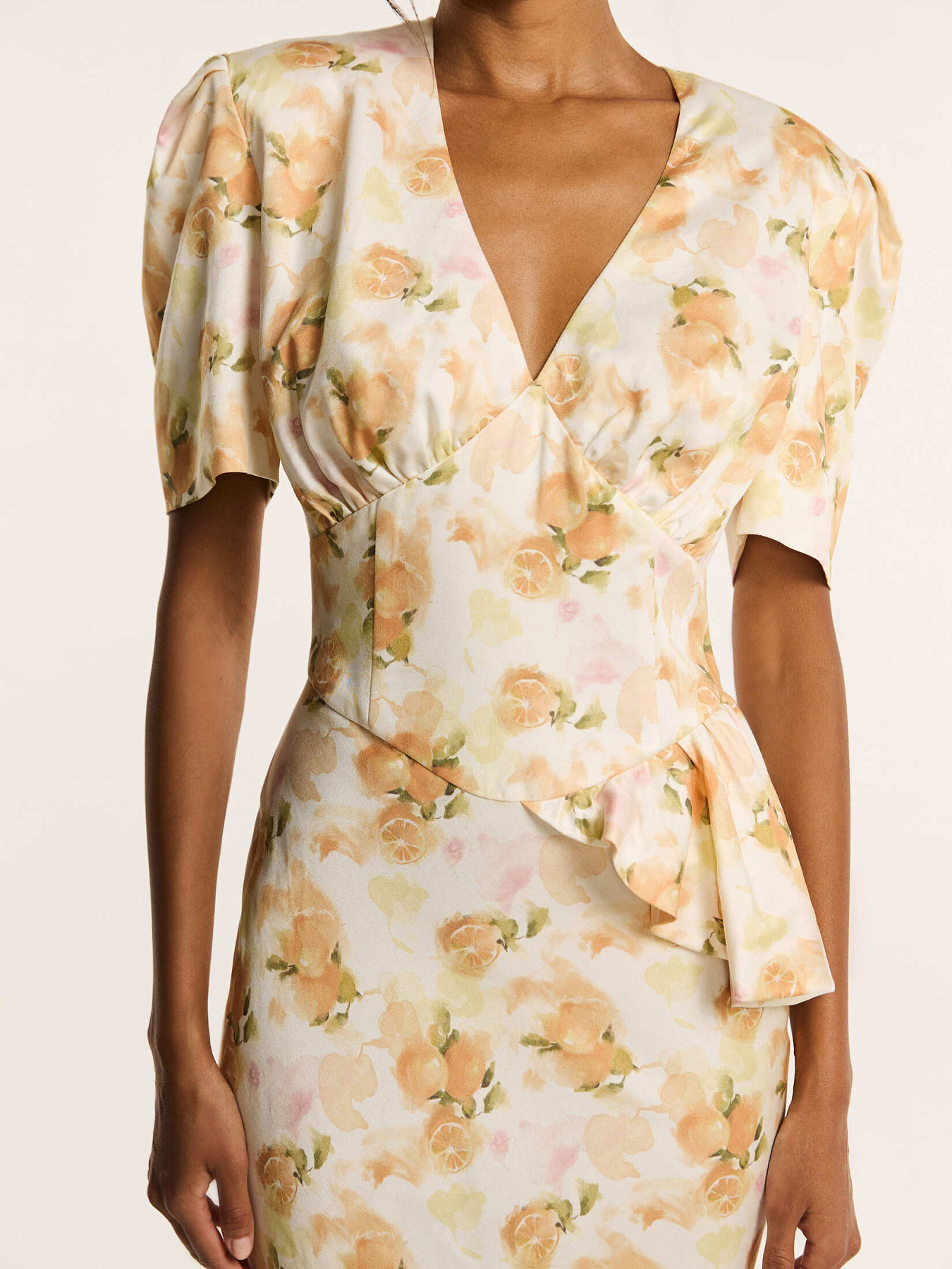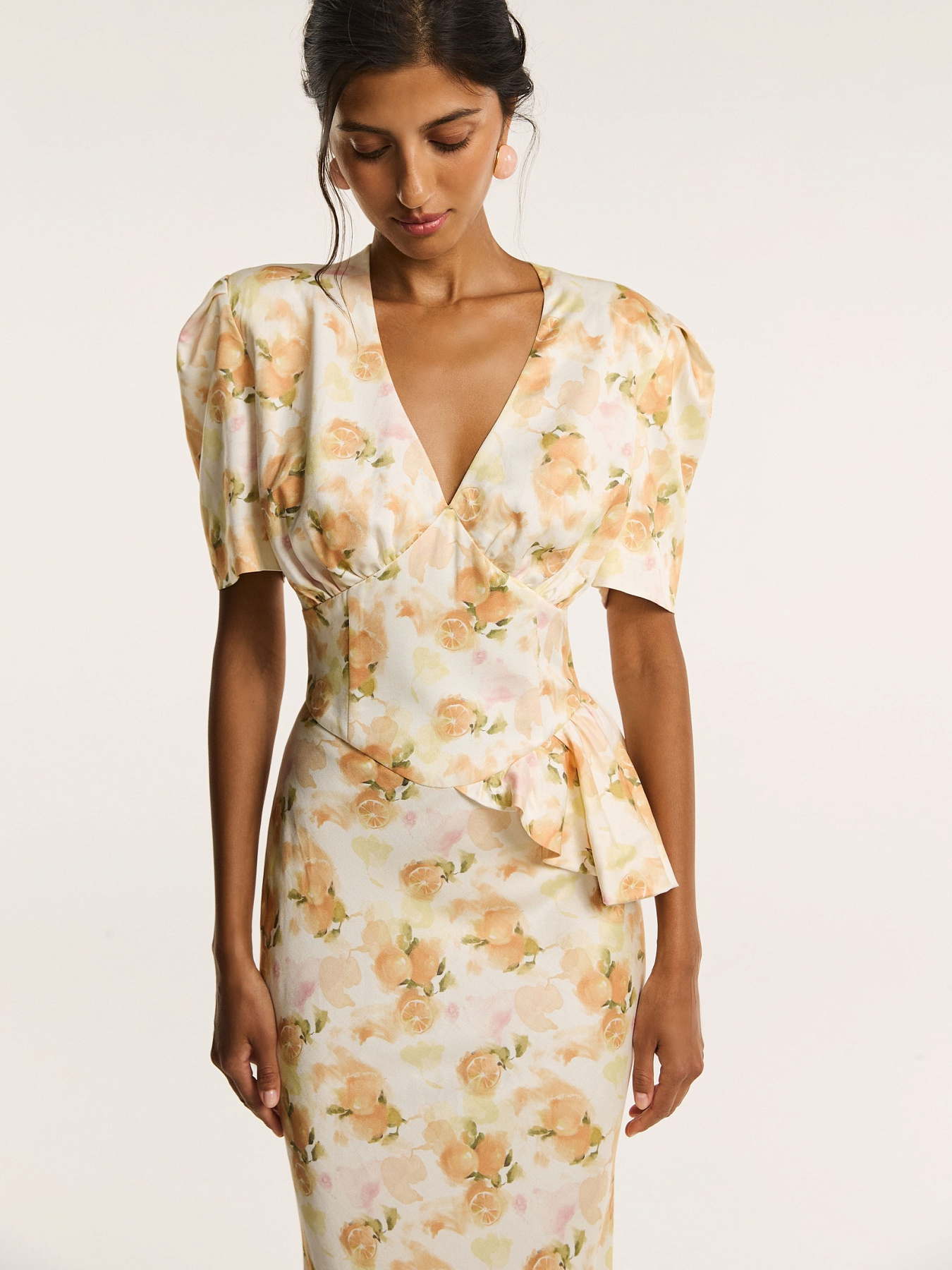 На молочном фоне — итальянские апельсины в припылённых оттенках оранжевого. Принт создан нашим дизайнером и наполнен образом тепла южной Италии. Он напечатан на итальянской фабрике специально для этой коллекции.