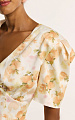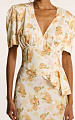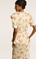 Отрезной лиф под линией груди со сборкой, объемный рукав с глубокими складками по окату придает силуэту выразительность и женственную глубину.