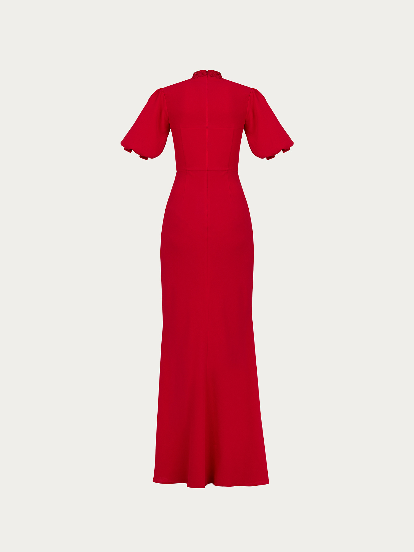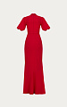 Платье макси из итальянского вискозного крепа в выразительном красном оттенке, с фигурным вырезом на груди и корсетным лифом. Лиф сконструирован по принципу корсажа: он имеет отрезные чашки из бельевого поролона и встроенную монокость, которая формирует скульптурный фигурный контур. Прилегание по переду и спинке достигается за счёт рельефов с регилином, удерживающим чёткую архитектуру лифа.
