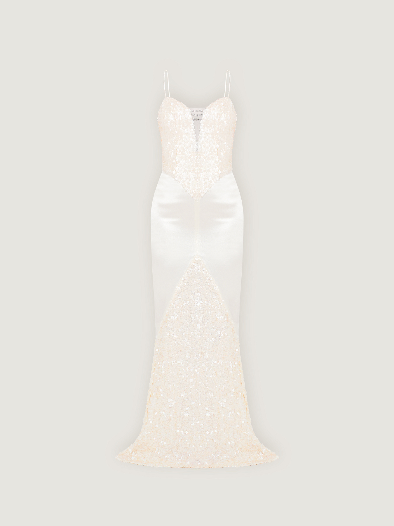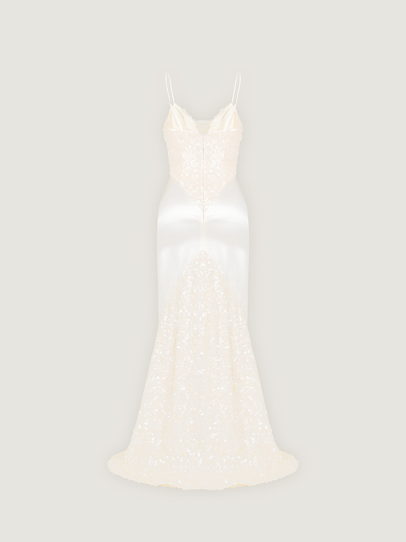 Платье макси на тонких регулируемых бретелях, выполненное из двух тканей-компаньонов: итальянского шелка с вискозой и ткани с плотно нашитыми пайетками сливочного оттенка.