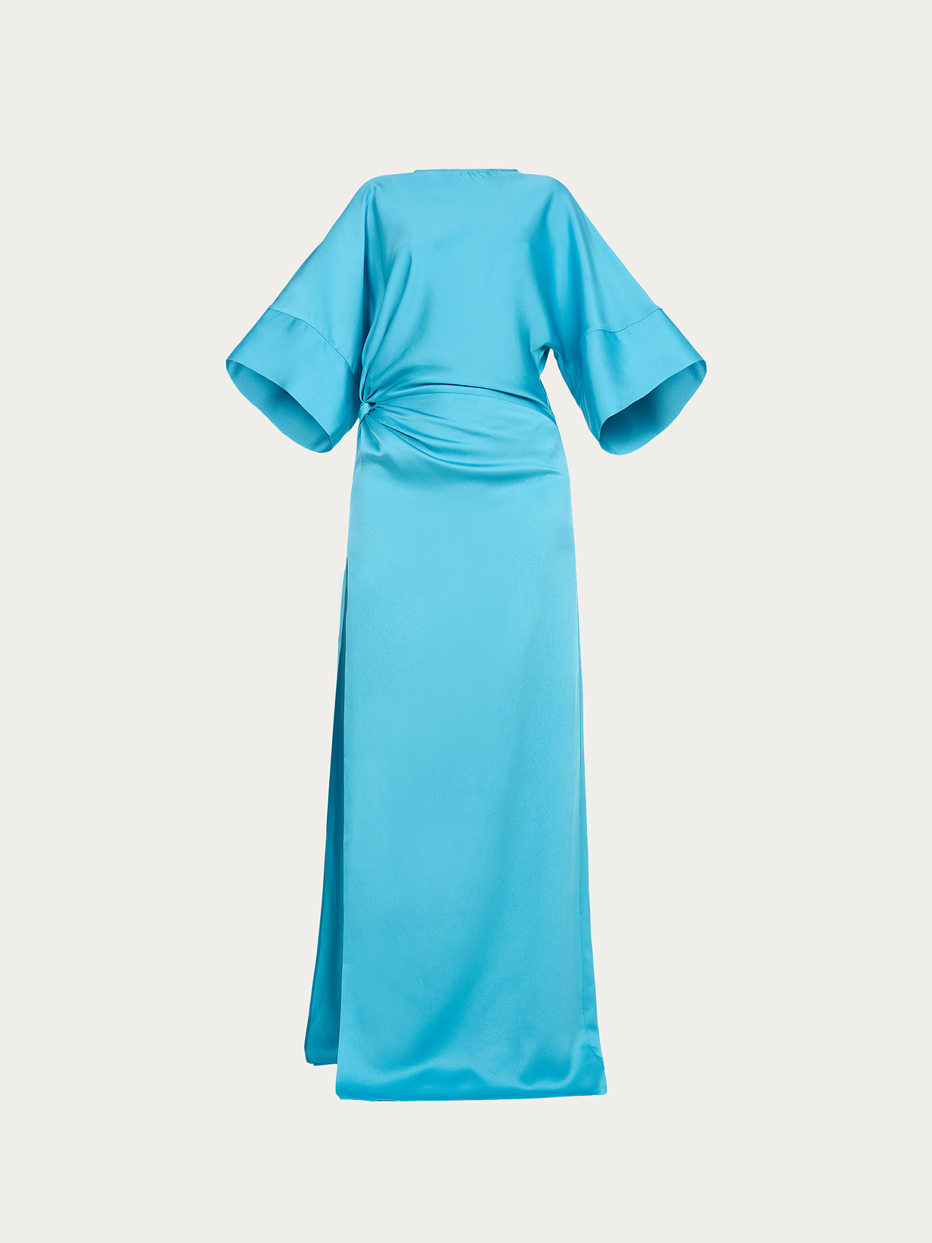 Платье макси из итальянского кади в бирюзовом оттенке. Вырез и цельнокроенный рукав с широкой манжетой создают чистый, собранный верх. По линии талии платье собрано в узел сбоку — этот прием формирует полуприлегающий силуэт, а драпировка мягко ложится в складки и подчеркивает линию бедра.