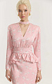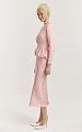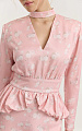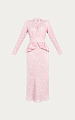 Платье собрано на широком отрезном поясе, от которого начинается объемная баска-баллон. Юбка скроена по косой, благодаря чему ткань пластично ложится по фигуре.