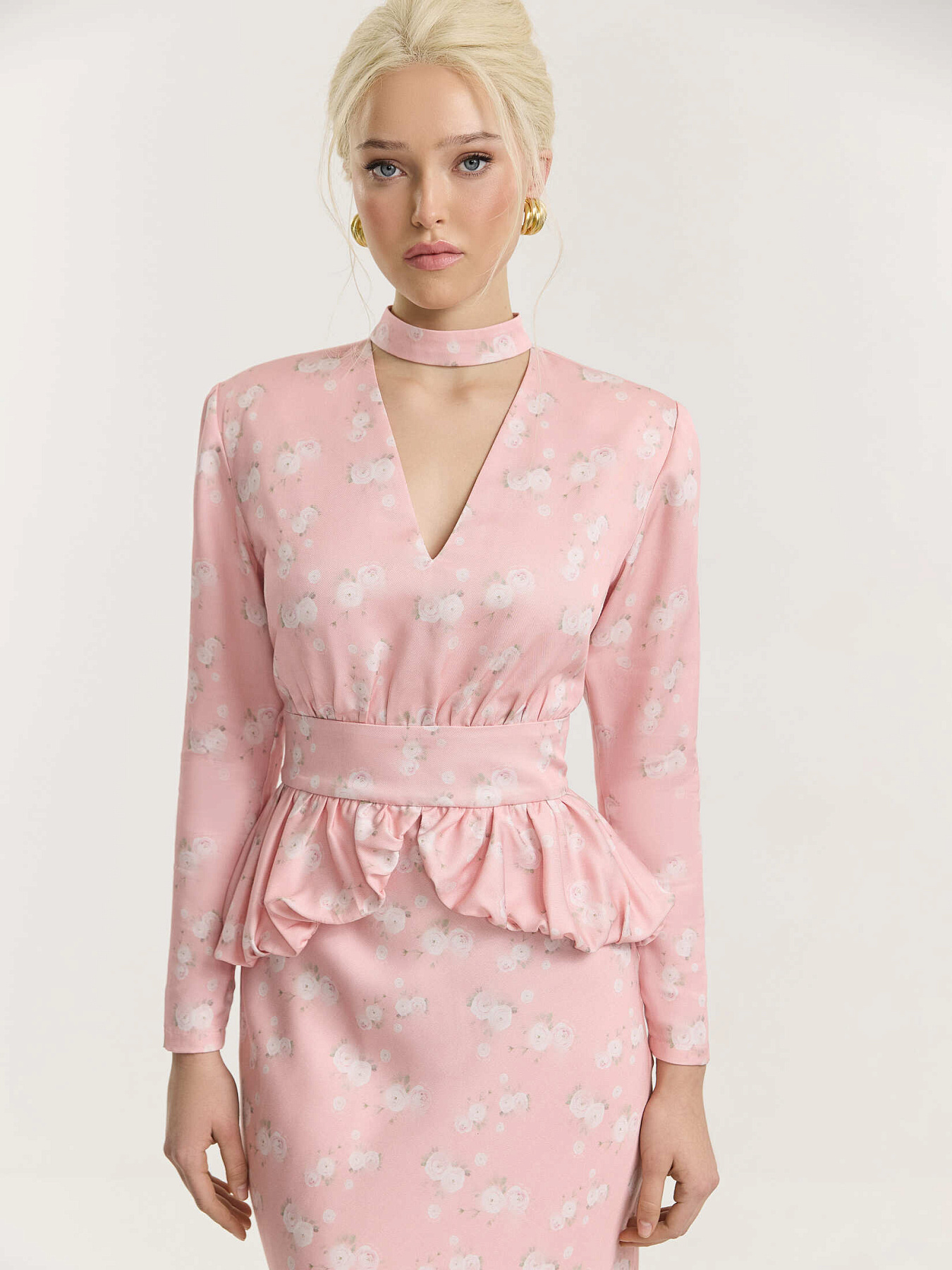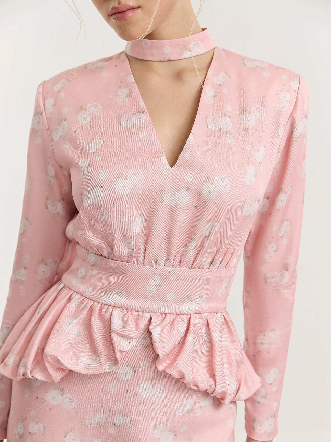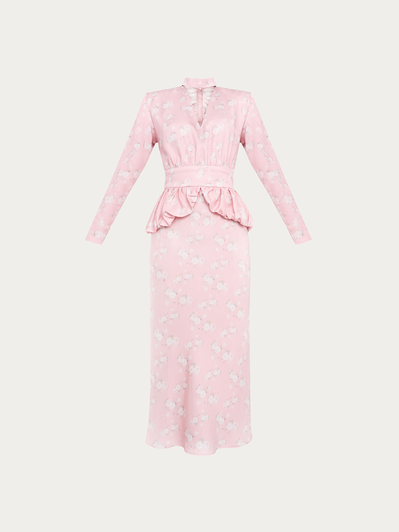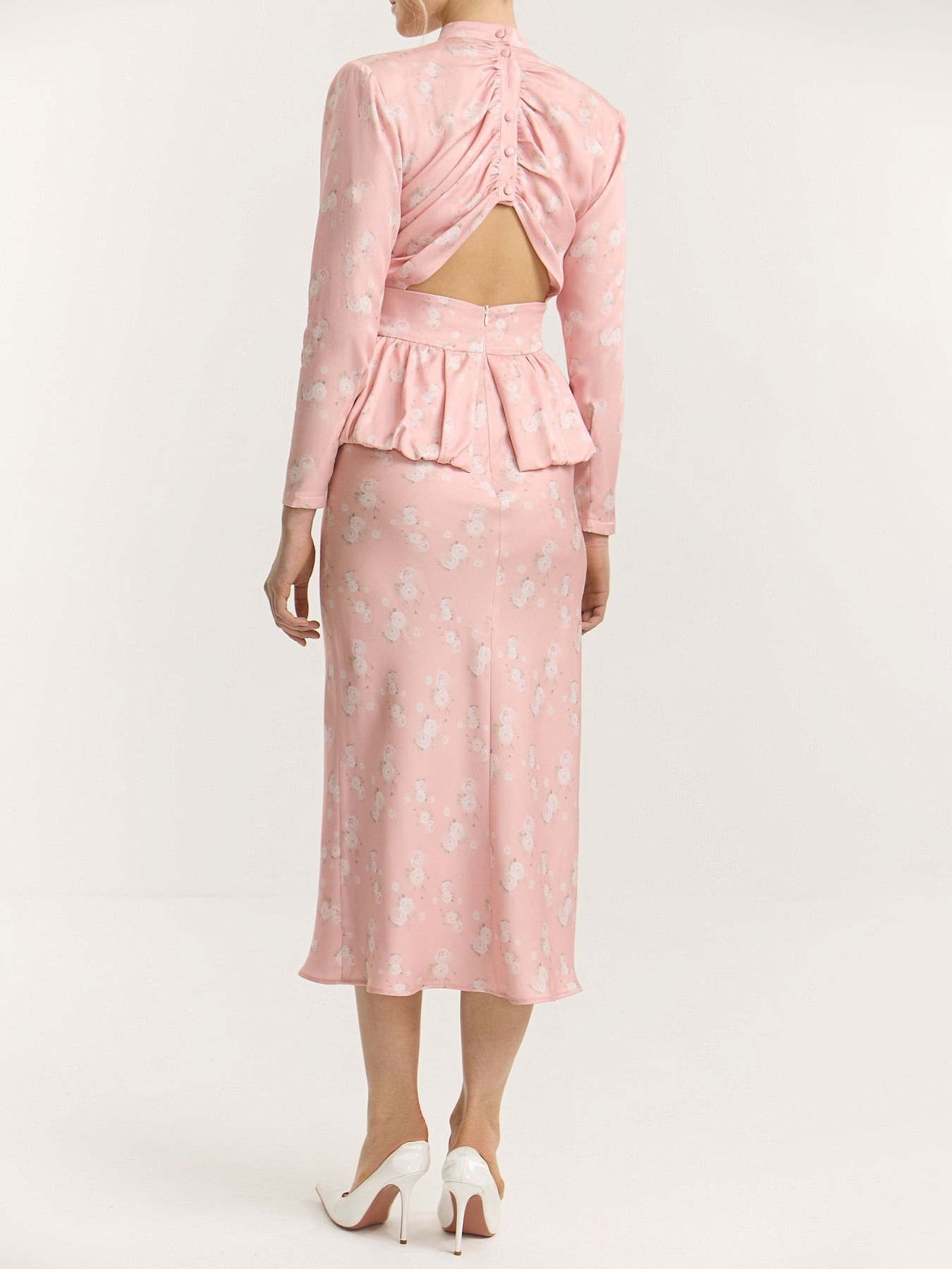 Платье миди из итальянской принтованной итальянской вискозы в нежно-розовом оттенке. На фоне — молочные ранункулюсы, хаотично рассыпанные по полотну. Принт создан специально для этой коллекции нашим графическим дизайнером.