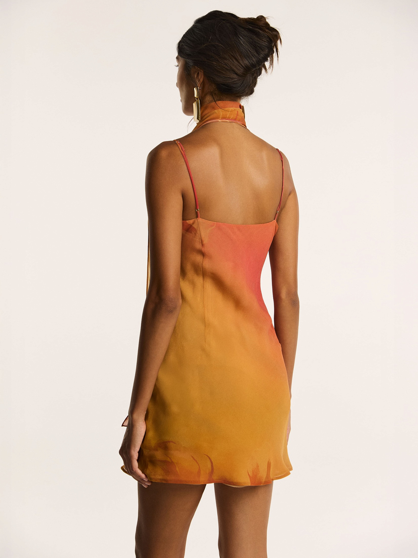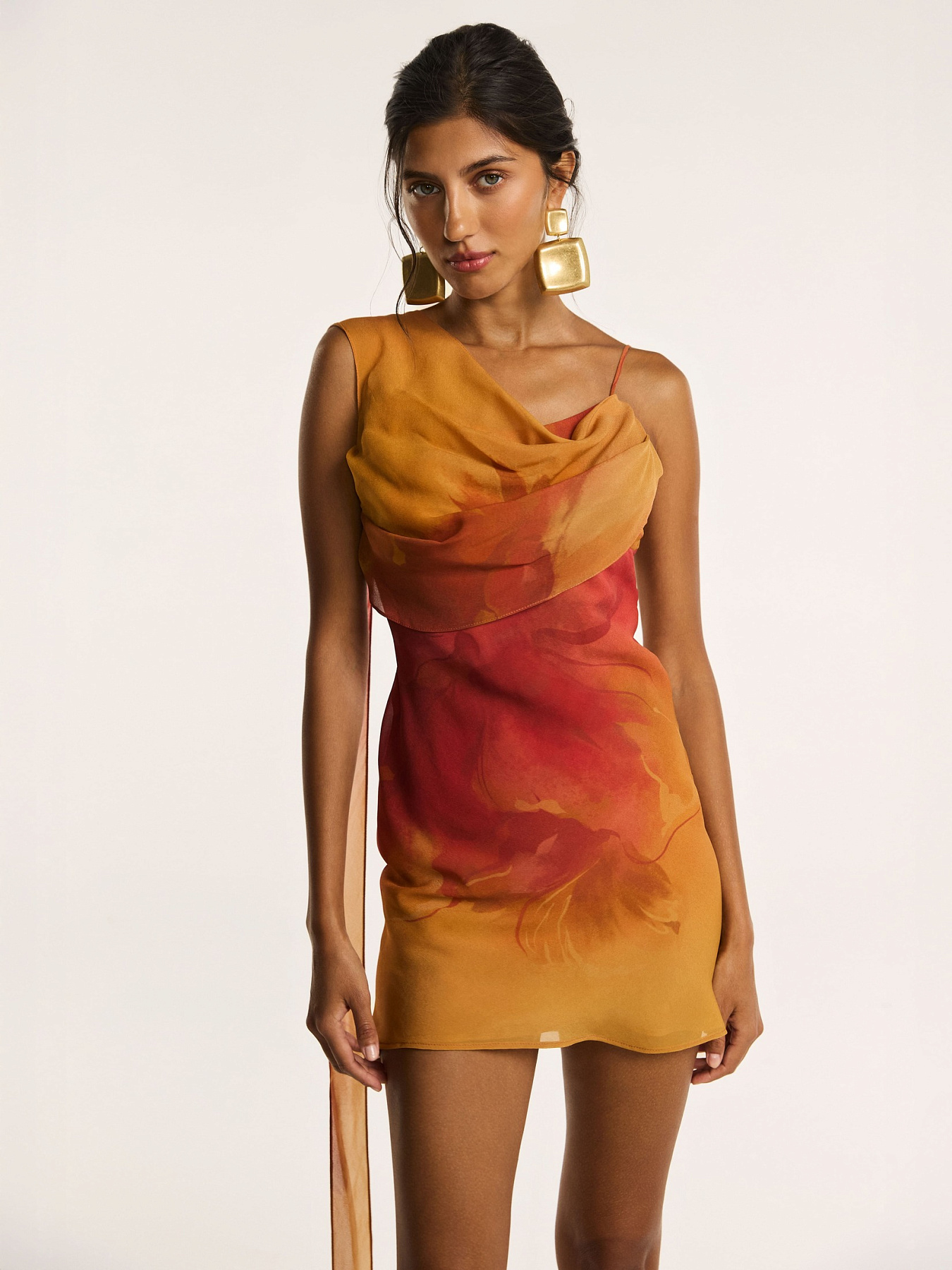 Платье мини из принтованного вискозного шифона — модель, в которой принт задаёт всё настроение образа.