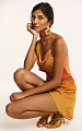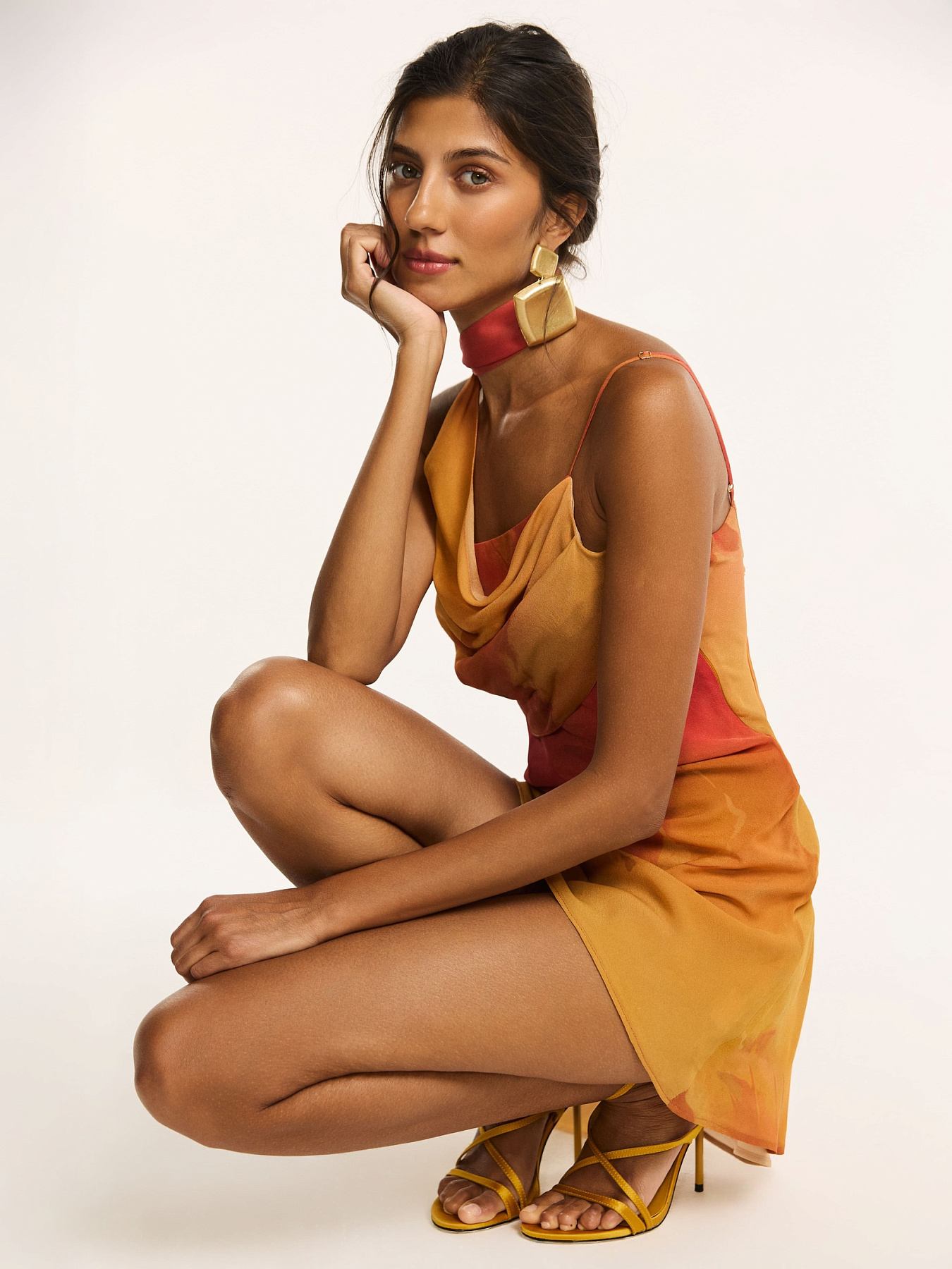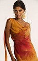На оранжево-жёлтом фоне с градиентным окрашиванием — пышные распустившиеся пионы в красно-оранжевых оттенках. Принт создан нашим дизайнером — живой, насыщенный рисунок, который красиво раскрывается в движении. Он напечатан на итальянской фабрике специально для этой коллекции.