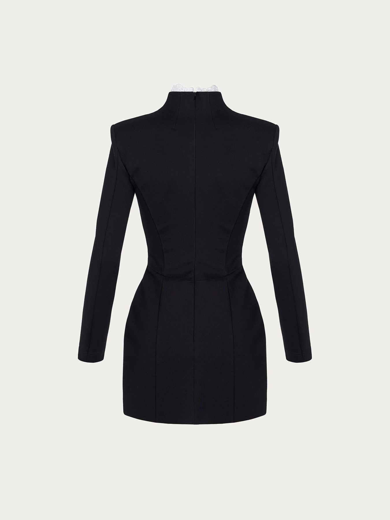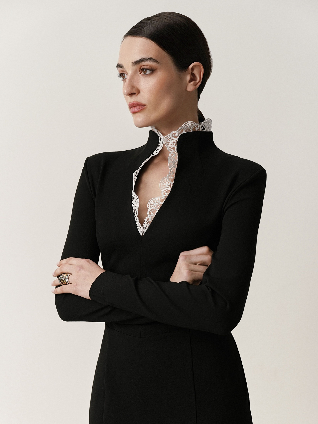 Вырез на уровне груди дополнен узкой полоской белого хлопкового кружева, создающей деликатный контраст. Цельнокроеный воротник-стойка и акцентированные плечи с подплечниками подчеркивают архитектуру образа. Отрезная линия талии формирует пропорции, удлиненные облегающие рукава завершают силуэт.
