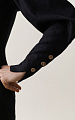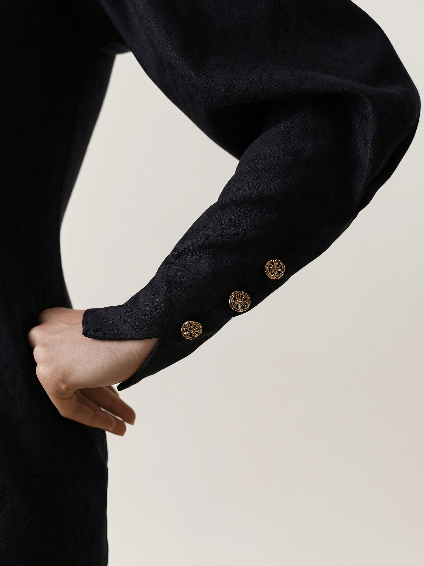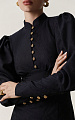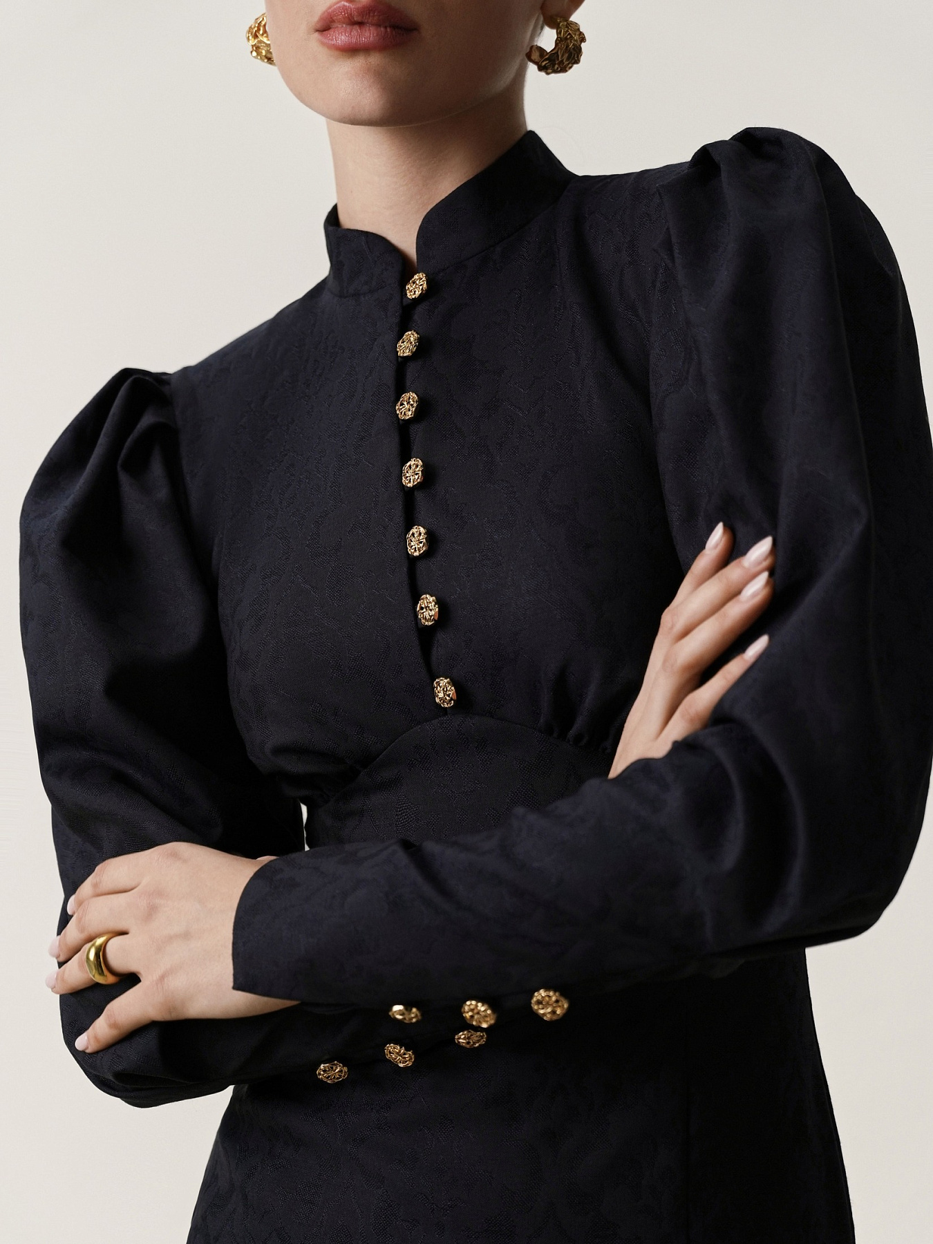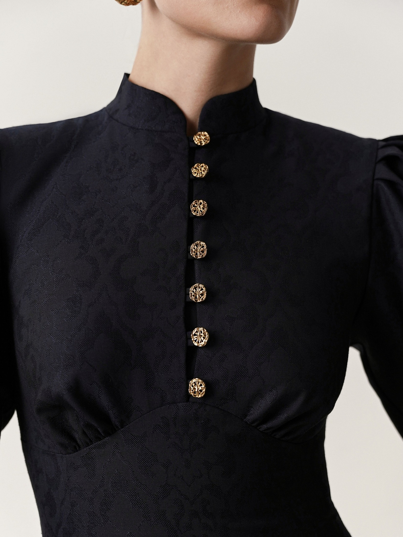 Верхняя часть платья отрезная и слегка присборена под грудью. Объемный рукав вдохновлен женским костюмом начала XIX века: складки по окату создают форму, которая мягко сужается к запястью, где повторяется застежка на пуговицы и петли. Прилегающий крой выстроен за счет вертикальных рельефных швов.