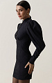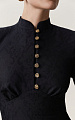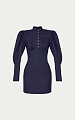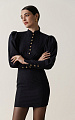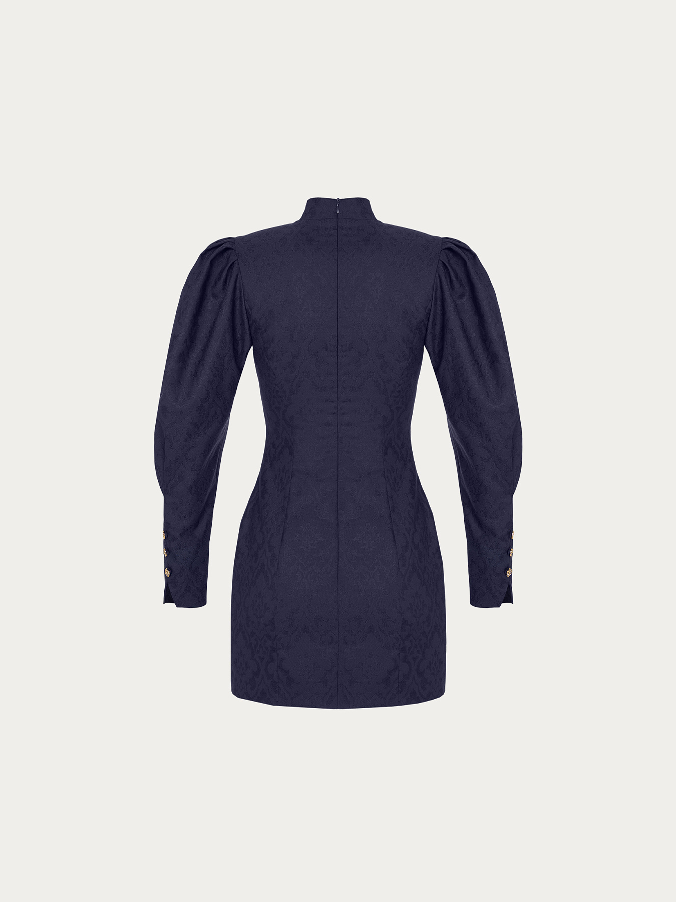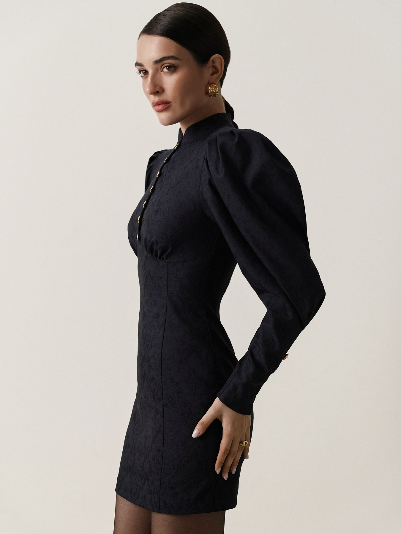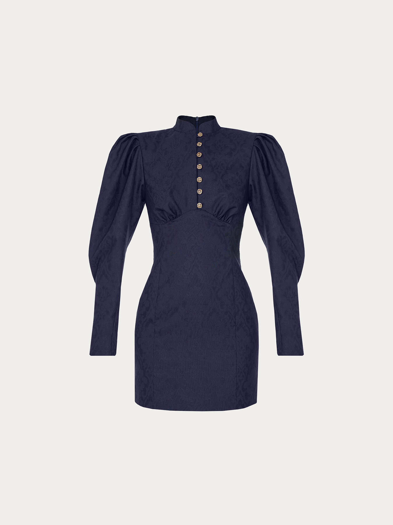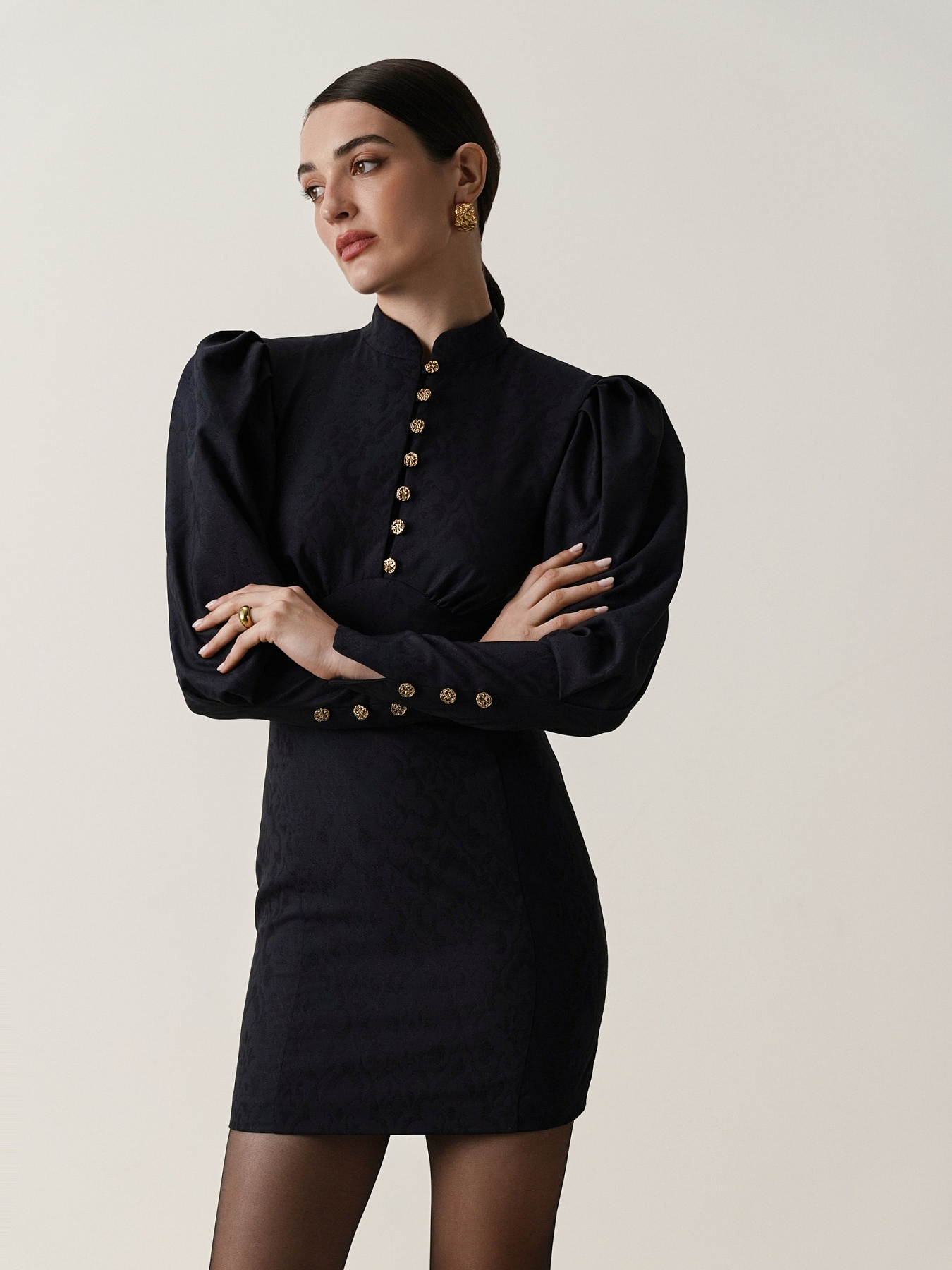 Платье мини из итальянской жаккардовой шерсти. Тонкий орнамент на ткани отсылает к теме коллекции, соединяя традицию и современность. Воротник-стойка и выведенная линия плеча с подплечниками формируют четкий, собранный силуэт.