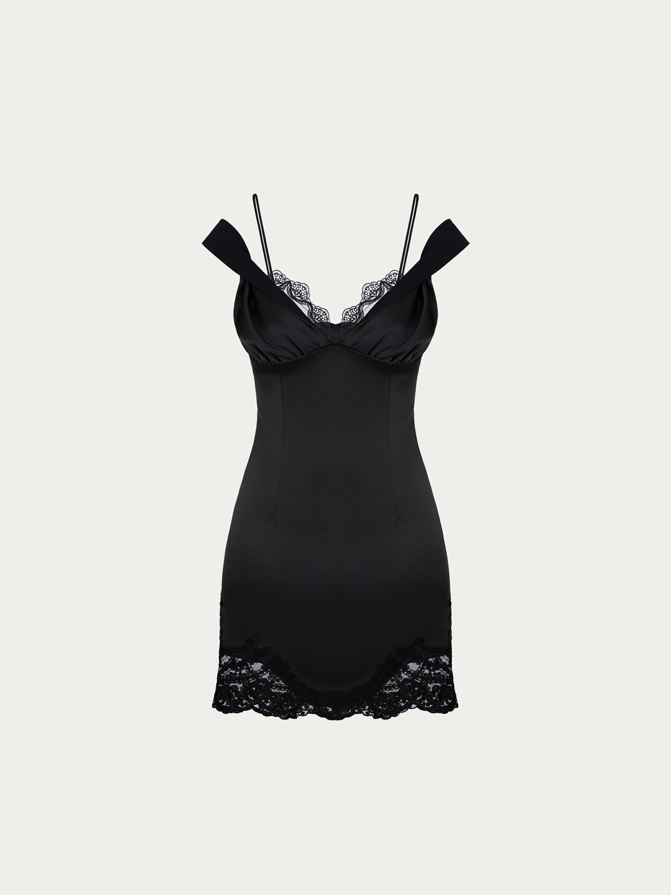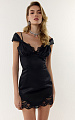 Платье корсетного силуэта мини из итальянской ткани дюшес в глубоком черном оттенке. Лиф выполнен с отрезными чашками, верхний край которых украшен деликатным итальянским кружевом.