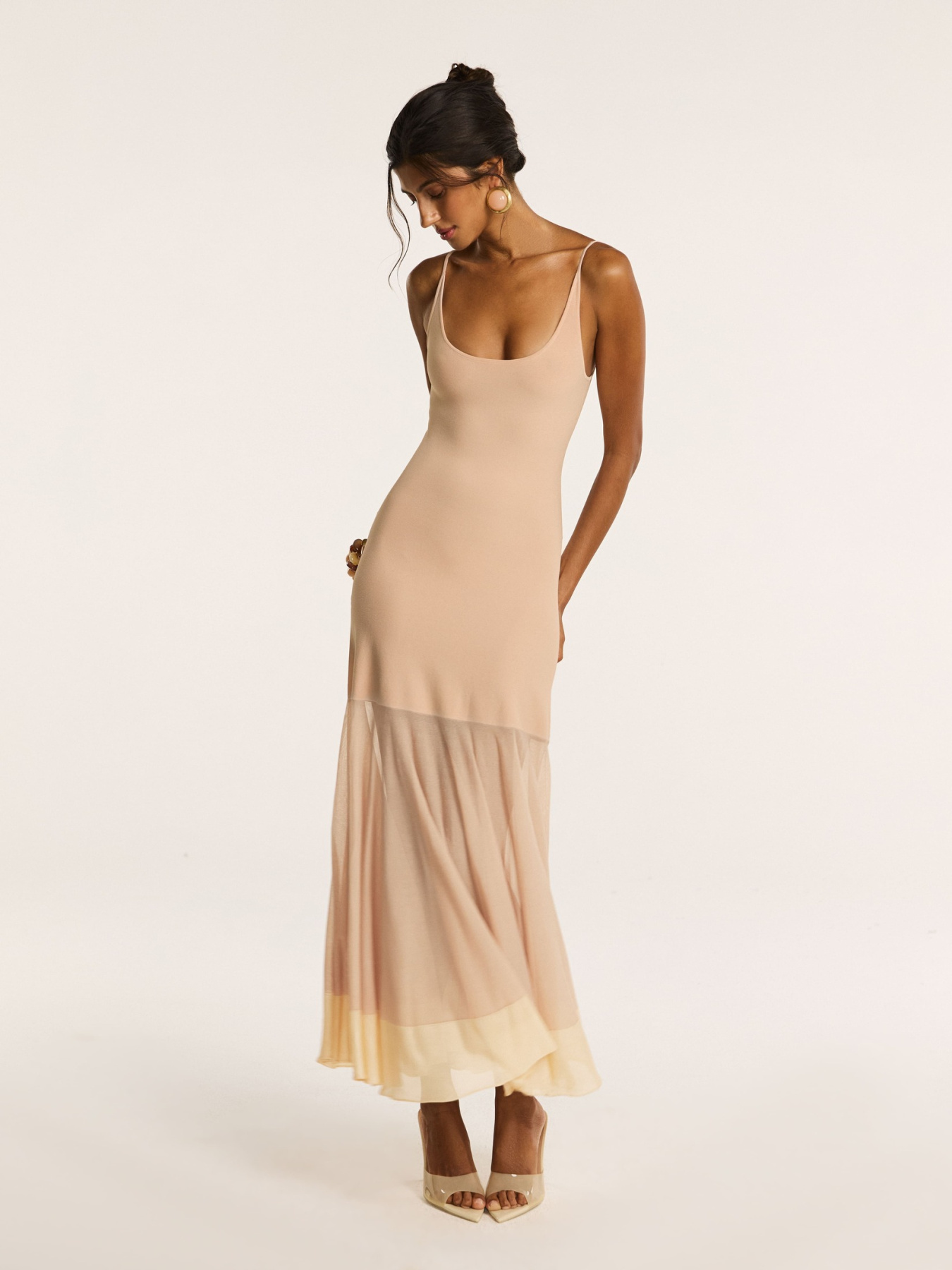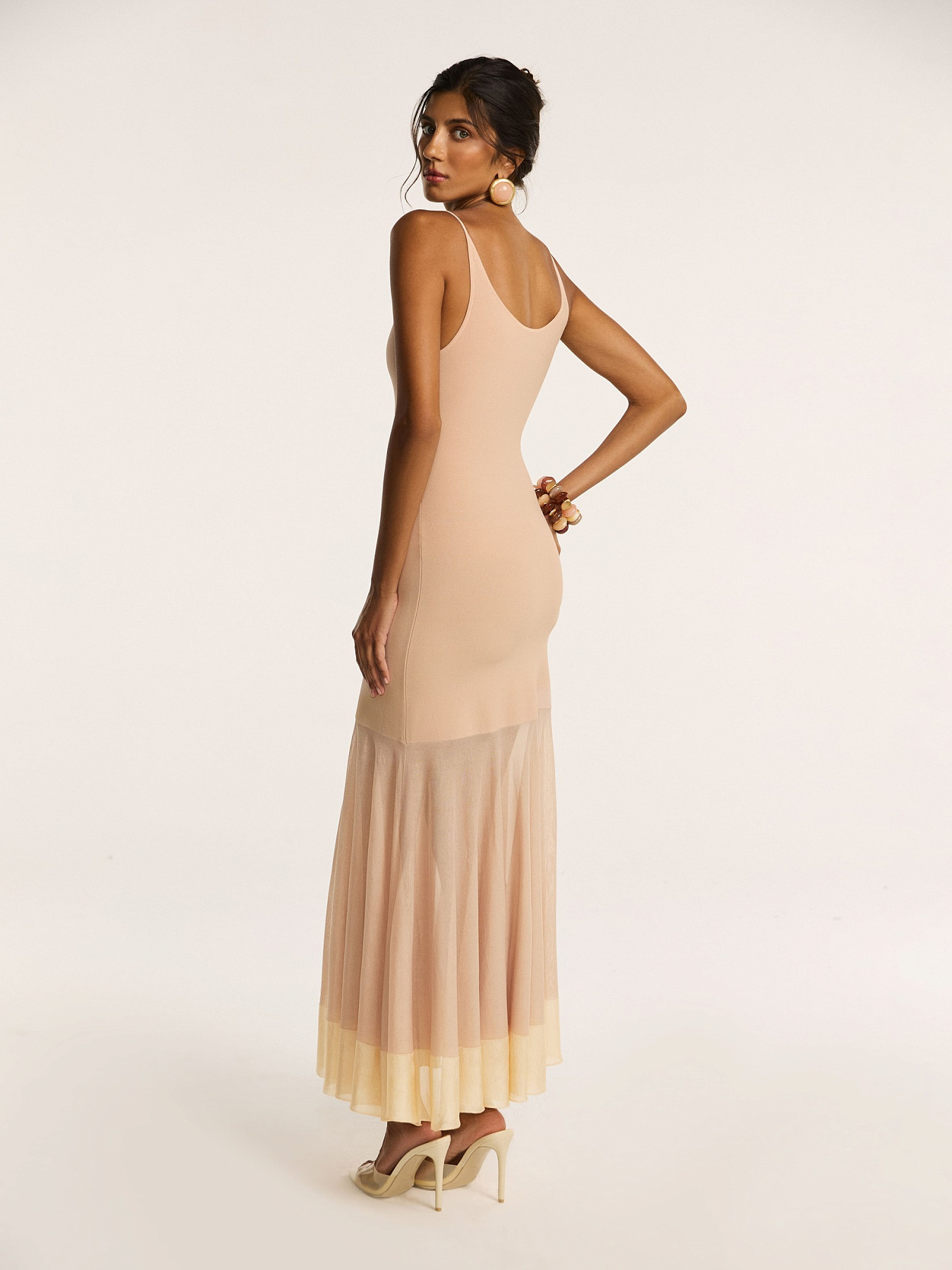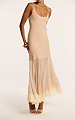 Платье макси на тонких бретелях в бежевом оттенке — модель, в которой три итальянские пряжи создают единый, многослойный силуэт.