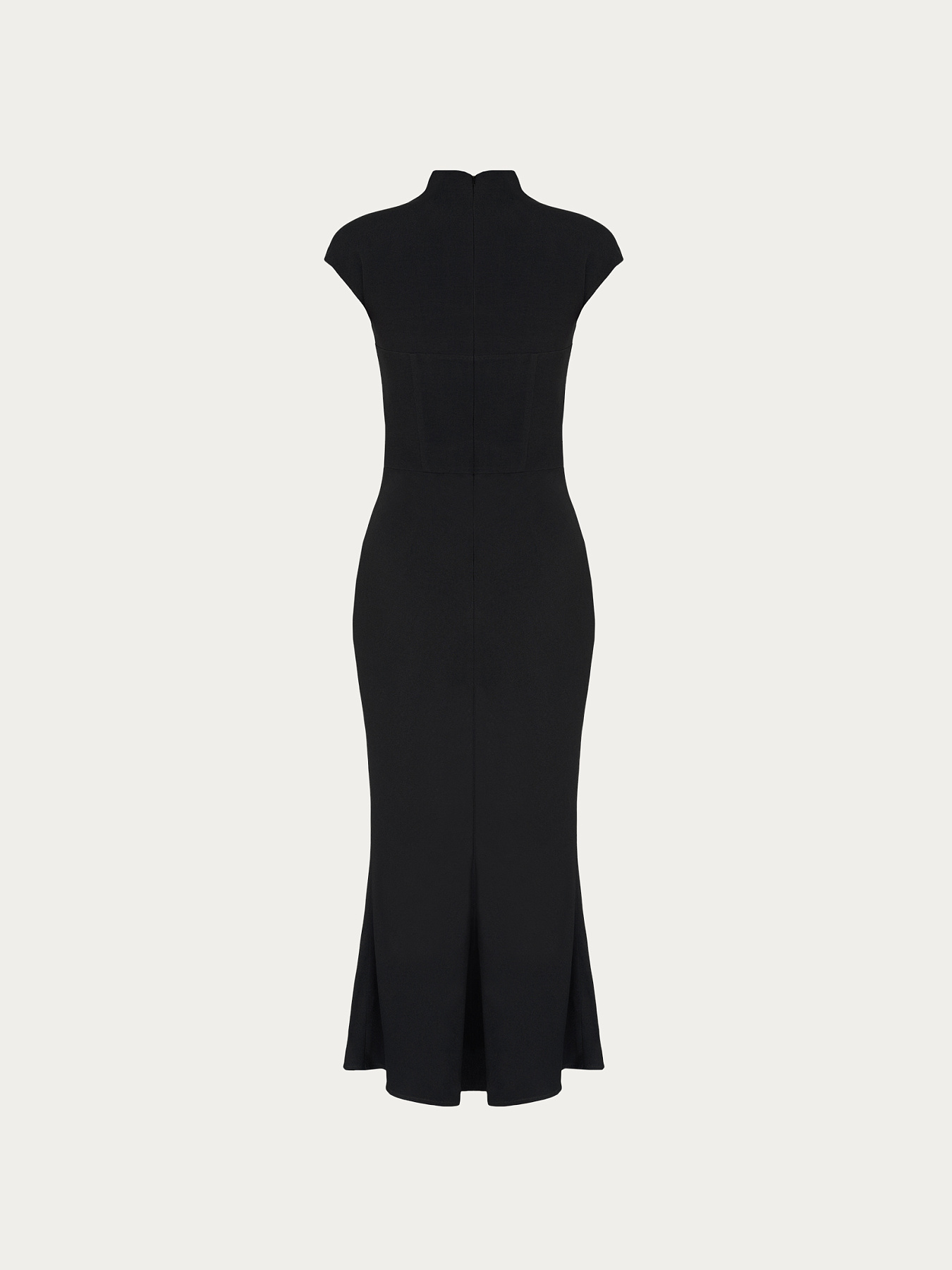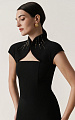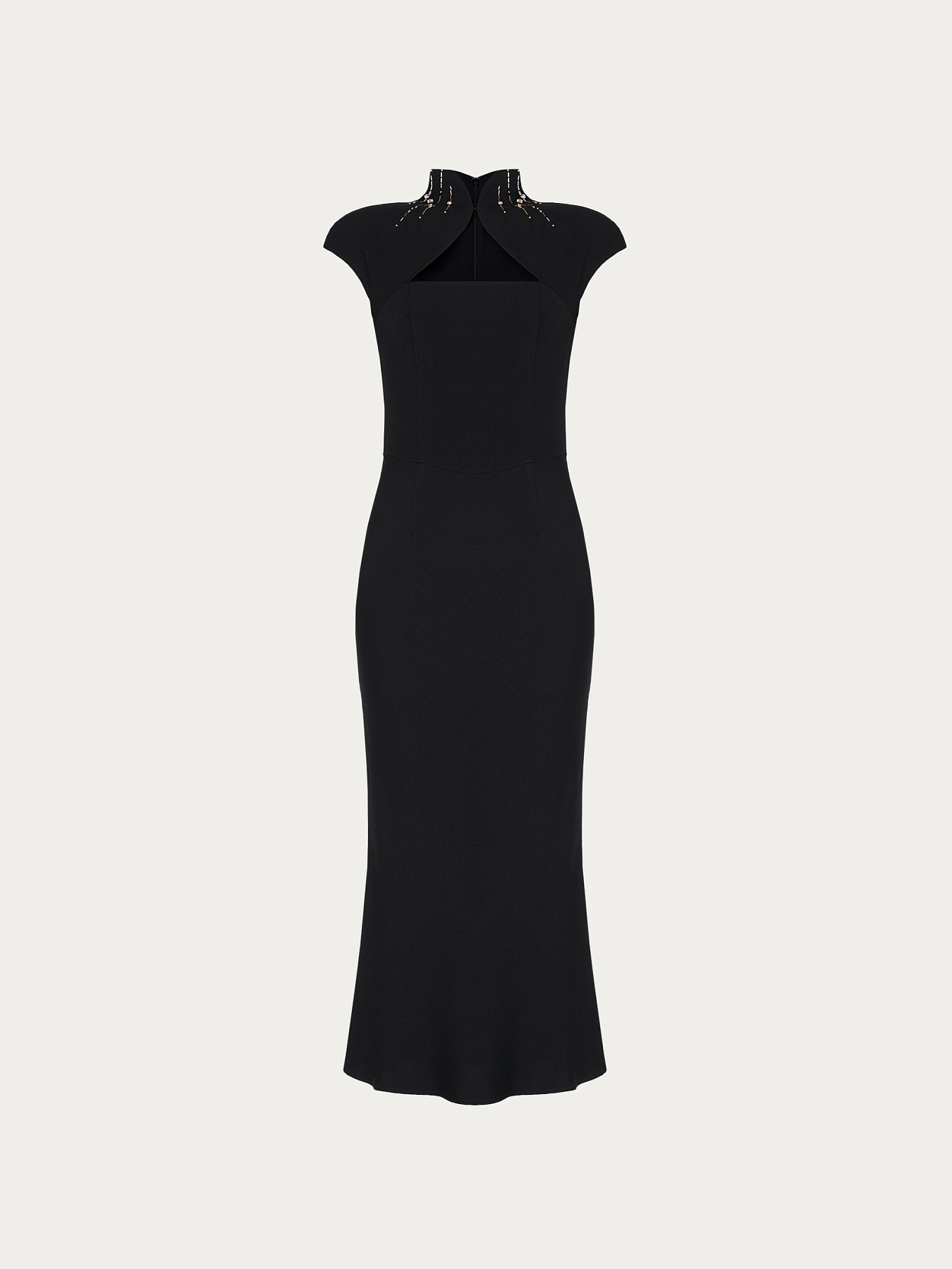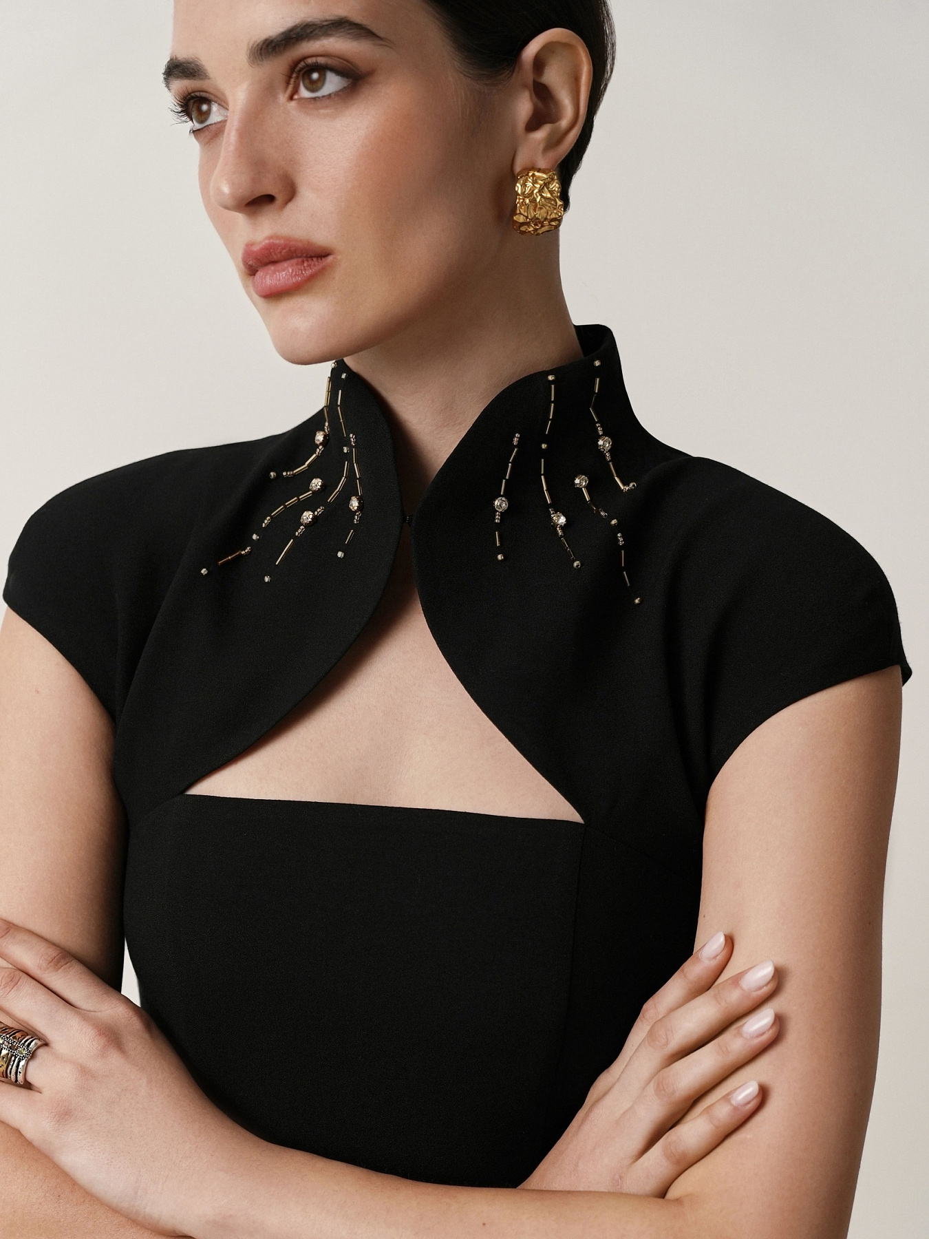 Платье миди из итальянской вискозы в креповом переплетении. Фигурная верхняя часть напоминает болеро с цельнокроеной стойкой и застежкой встык на черный металлический крючок. От верхнего среза расходится ручная вышивка из бисера и камней в золотистом оттенке — рисунок создан индивидуально под каждое изделие и выполнен вручную нашими мастерами.