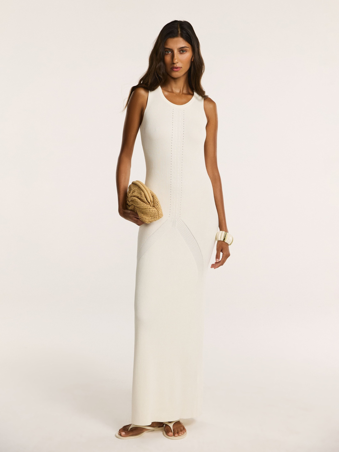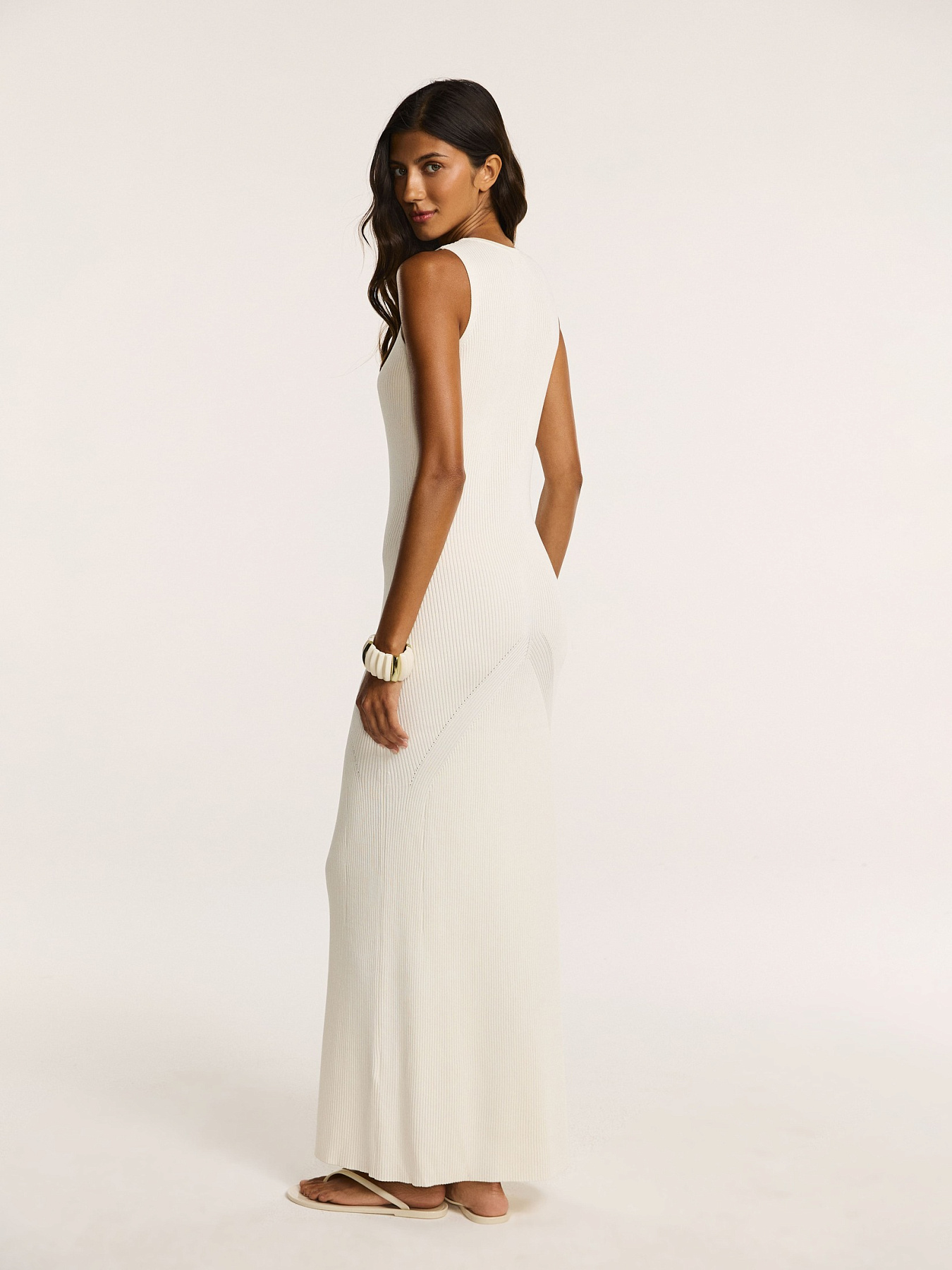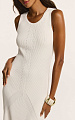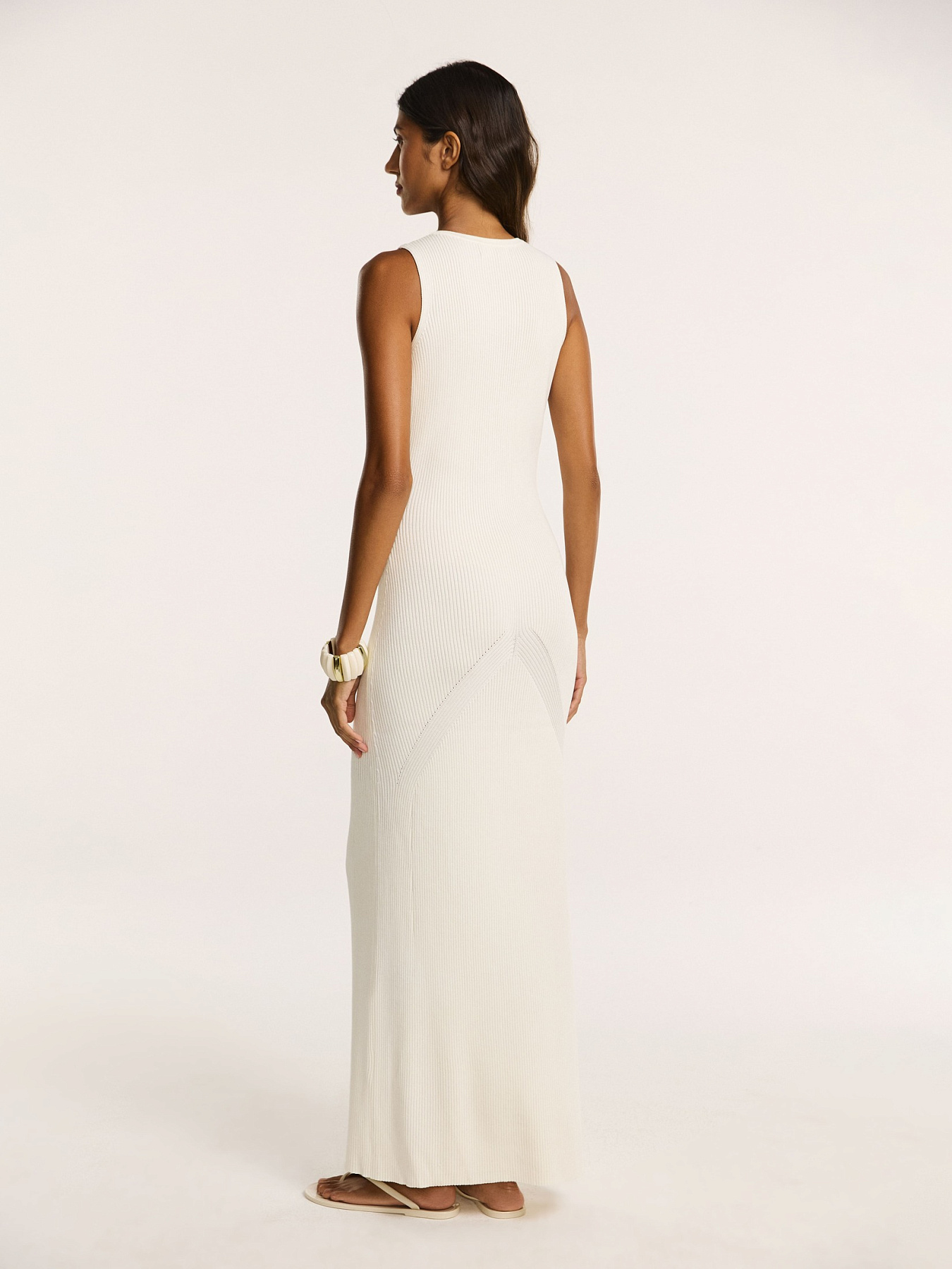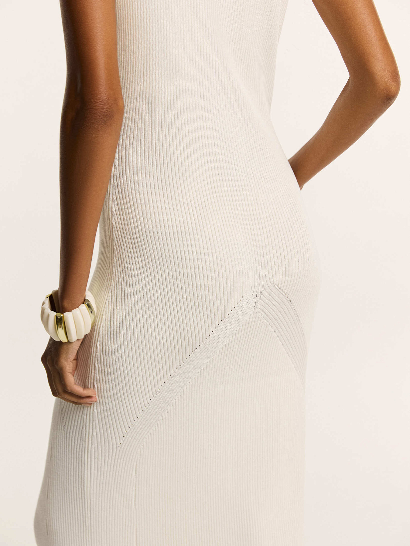Платье из легкого трикотажа на основе вискозы с добавлением нейлона — пряжа сохраняет форму, при этом мягко обнимает фигуру и подчеркивает силуэт.