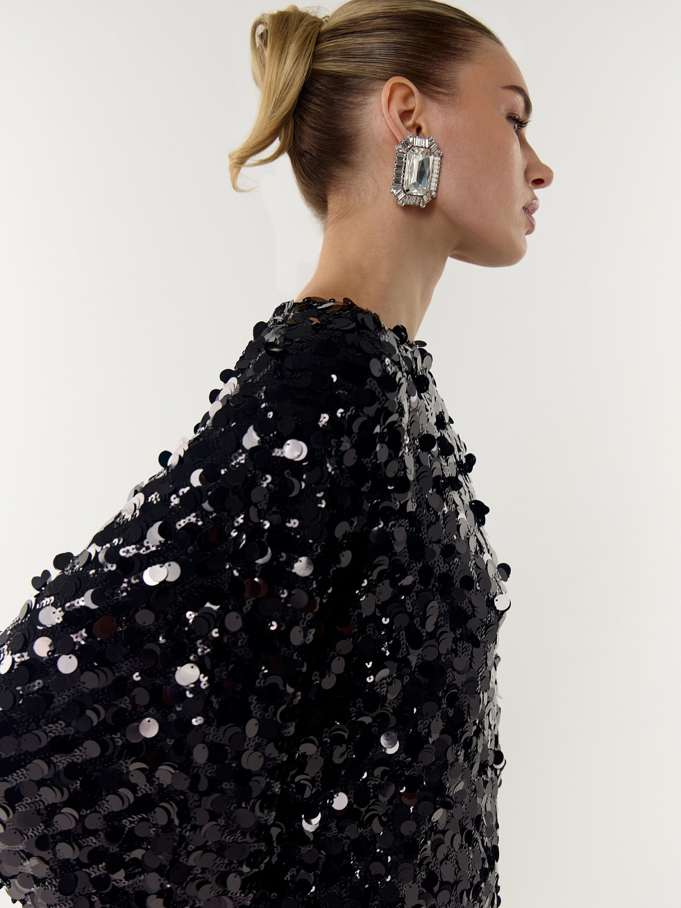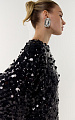 Платье из тонкого тюля, полностью расшитого пайетками разного размера, ловит свет при каждом движении. Глубокий вырез-качель сзади эффектно открывает спину, а тонкая бретель фиксирует платье, обеспечивая комфортную посадку.