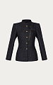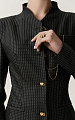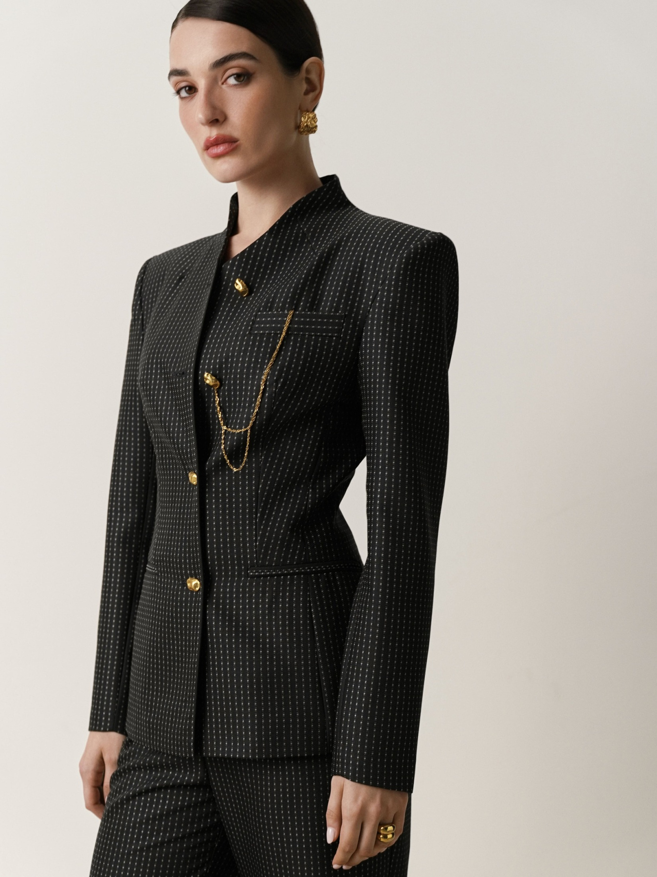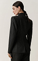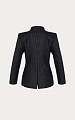 Жакет приталенного силуэта из итальянской шерсти в черном цвете с мелким белым орнаментом, образующим вертикальные полосы. Средняя длина модели подчеркивает талию, создавая графичный и собранный силуэт. Аккуратно выведенная линия плеча формируется за счет подплечников, цельнокроеный воротник-стойка завершает образ.