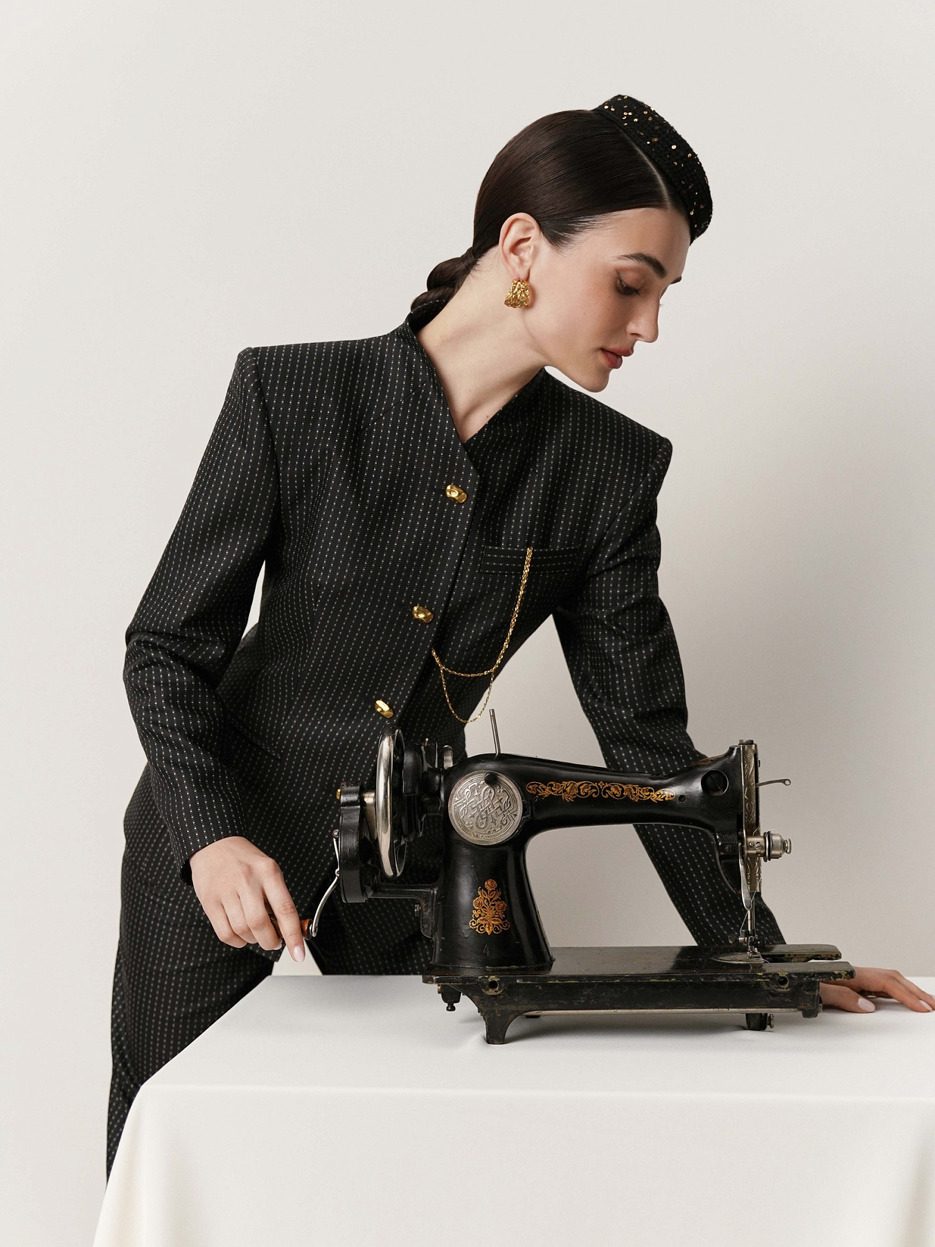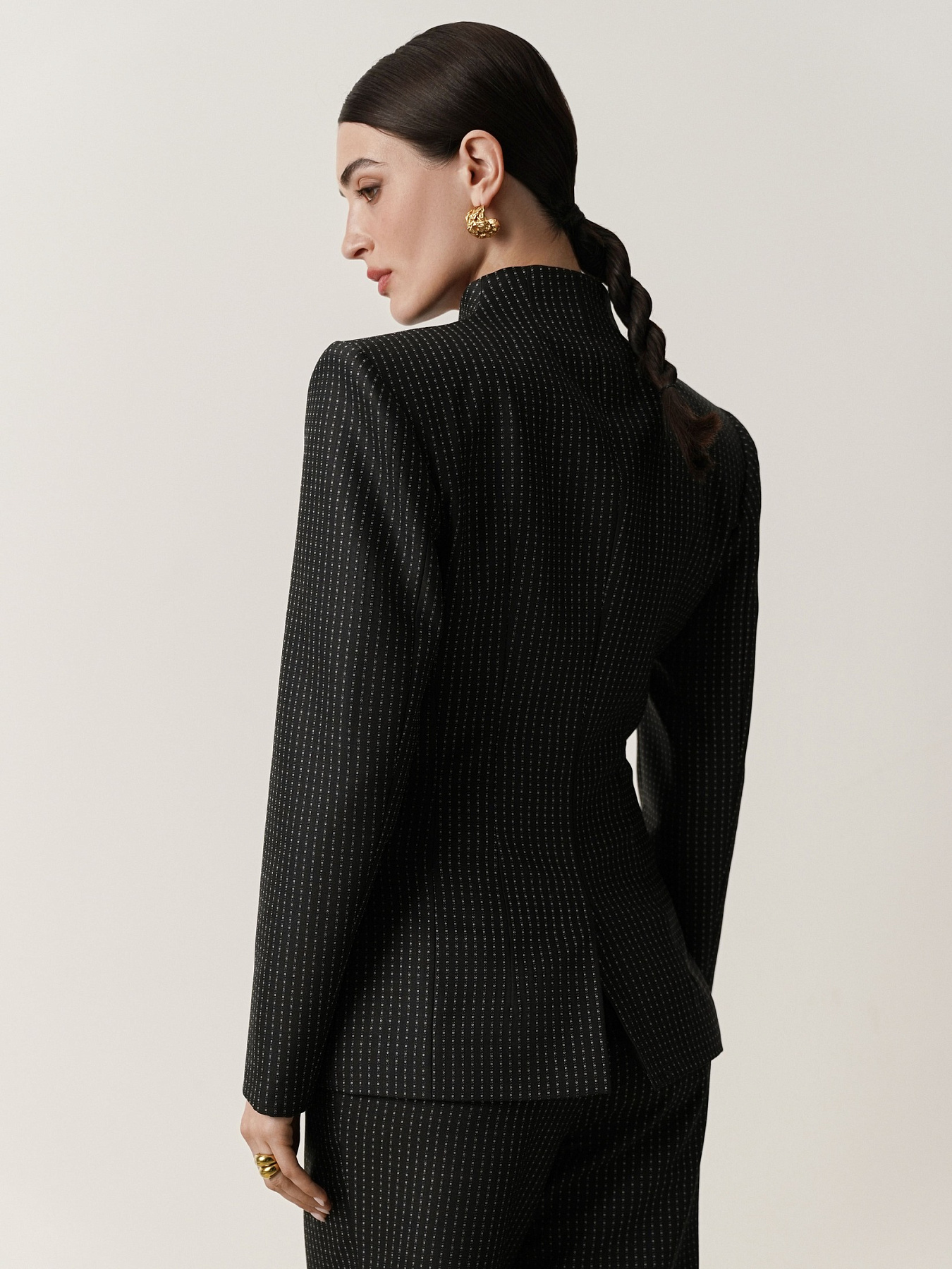 Жакет приталенного силуэта из итальянской шерсти в черном цвете с мелким белым орнаментом, образующим вертикальные полосы. Средняя длина модели подчеркивает талию, создавая графичный и собранный силуэт. Аккуратно выведенная линия плеча формируется за счет подплечников, цельнокроеный воротник-стойка завершает образ.