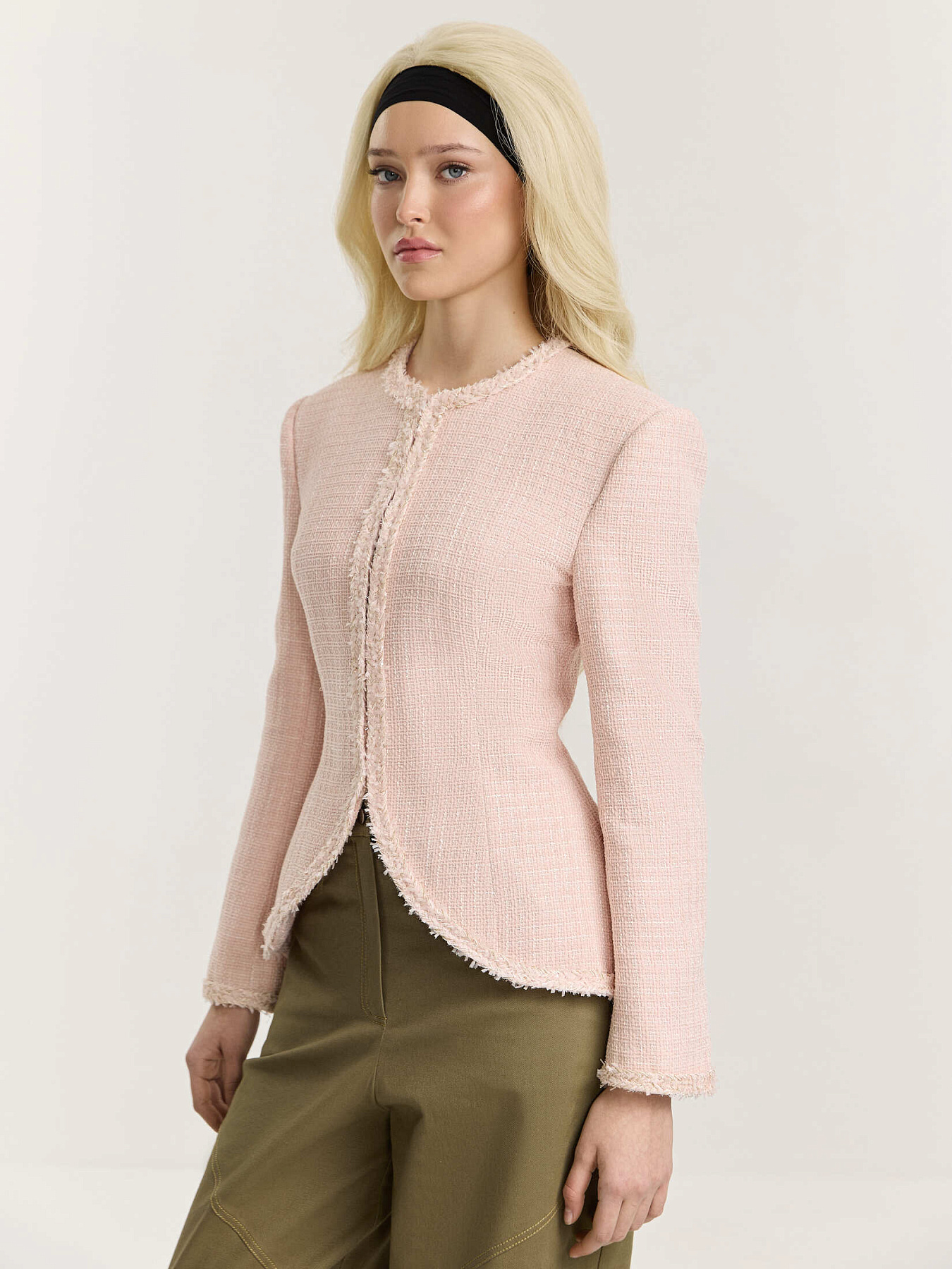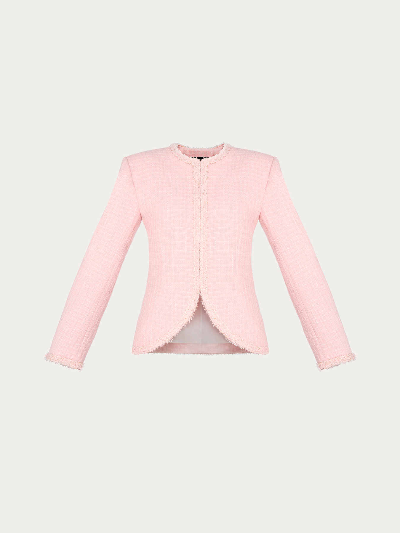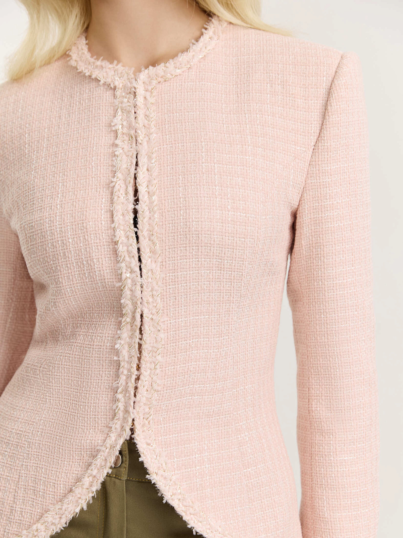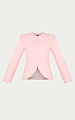 Жакет приталенного силуэта из итальянского твида. Фактурное переплетение нитей в розовой и белой гамме создает мягкую глубину и живую поверхность ткани.