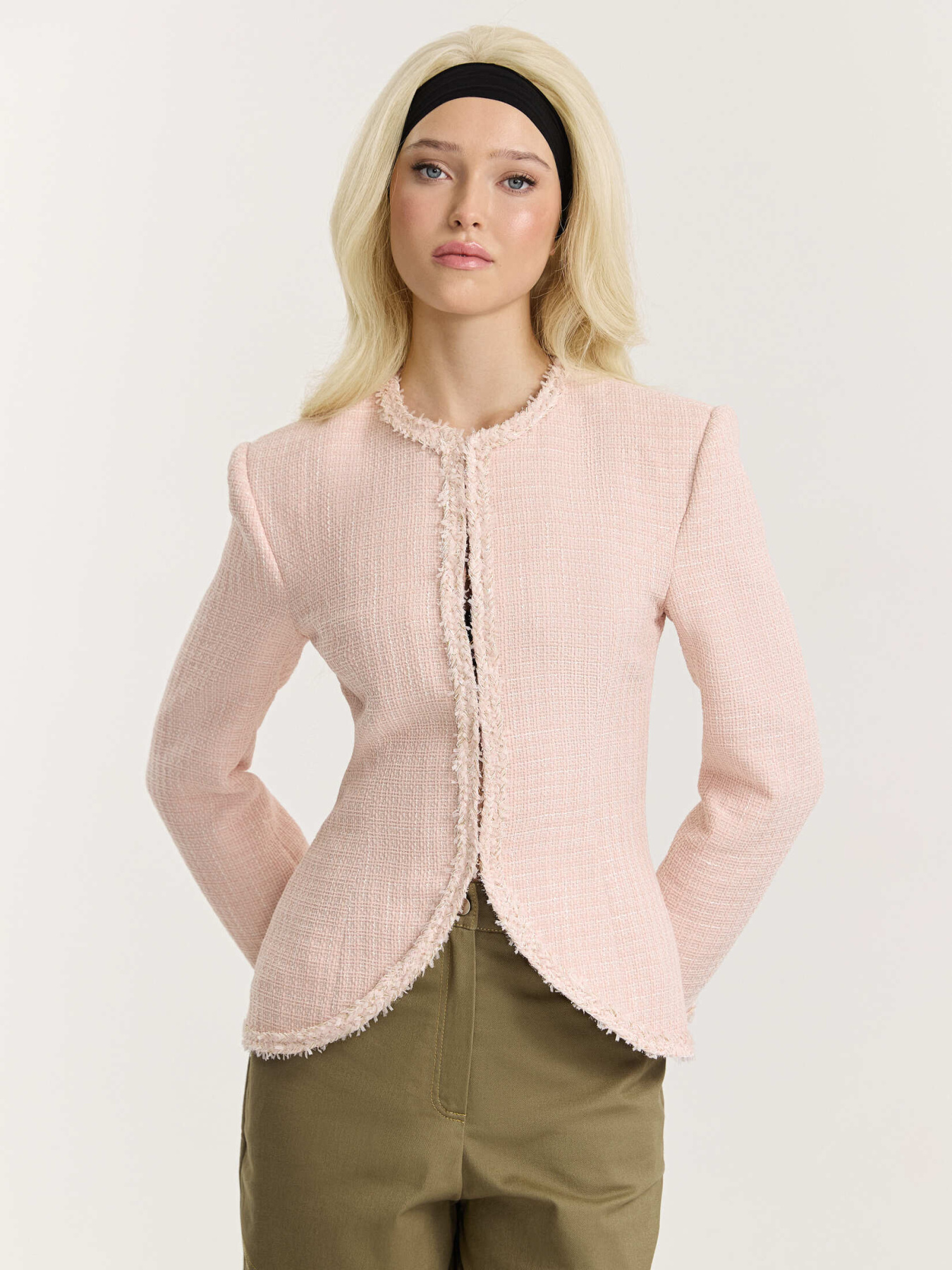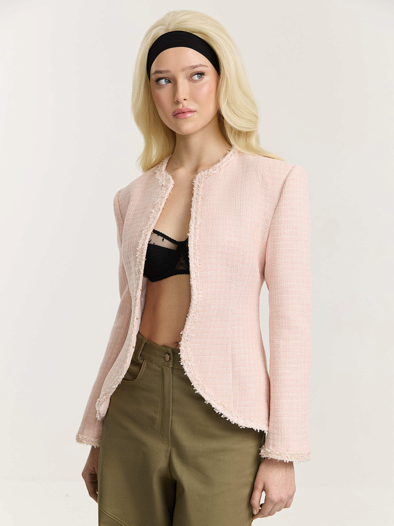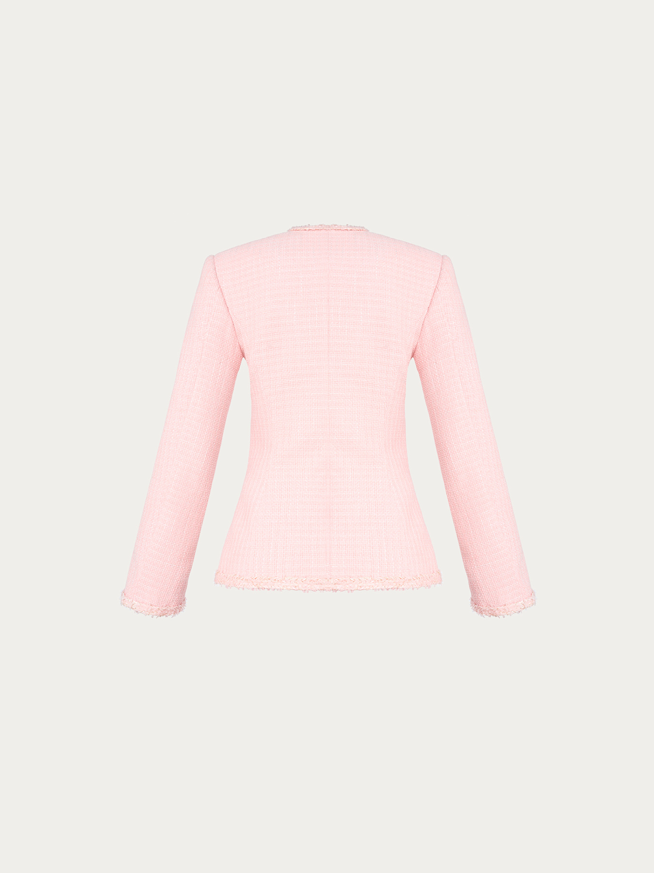 Жакет приталенного силуэта из итальянского твида. Фактурное переплетение нитей в розовой и белой гамме создает мягкую глубину и живую поверхность ткани.