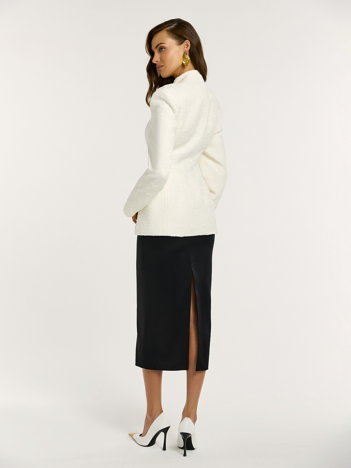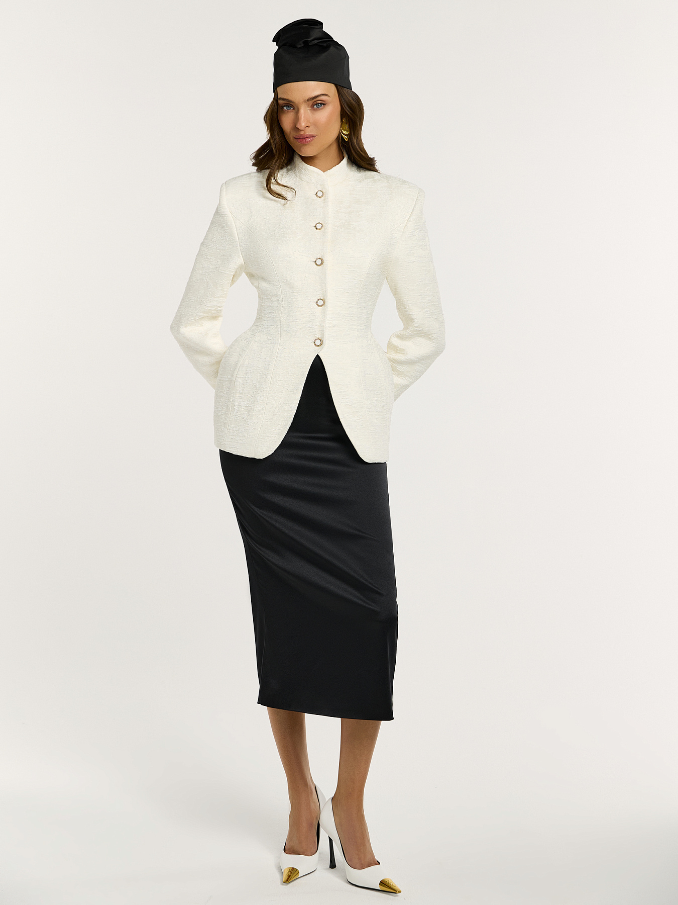 Изделие выполнено из фактурной итальянской жаккардовой ткани: материал обладает деликатным рельефом, красиво играет на свету и формирует четкую, скульптурную линию.