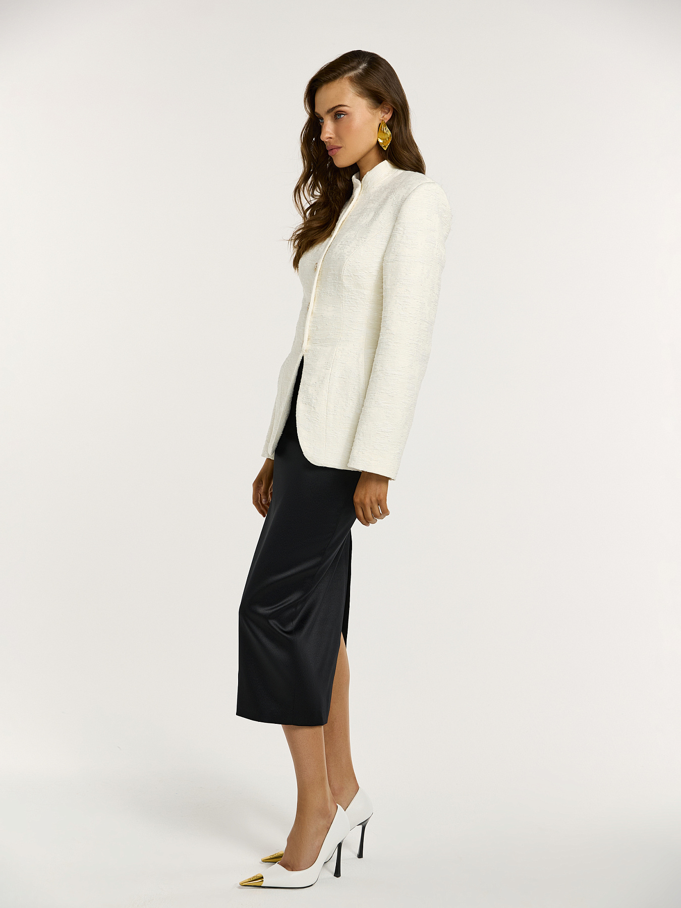Жакет в молочном оттенке с металлическими пуговицами — изысканная модель с выразительной архитектурой силуэта и акцентом на фактуру.