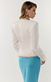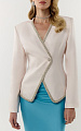 Двубортная застежка на запах оформлена металлической пуговицей с жемчужным центром и тонкой оправой из страз. Фигурные борта образуют выразительный V-образный вырез по линии горловины и нижнему краю изделия, подчеркивая утонченность силуэта.