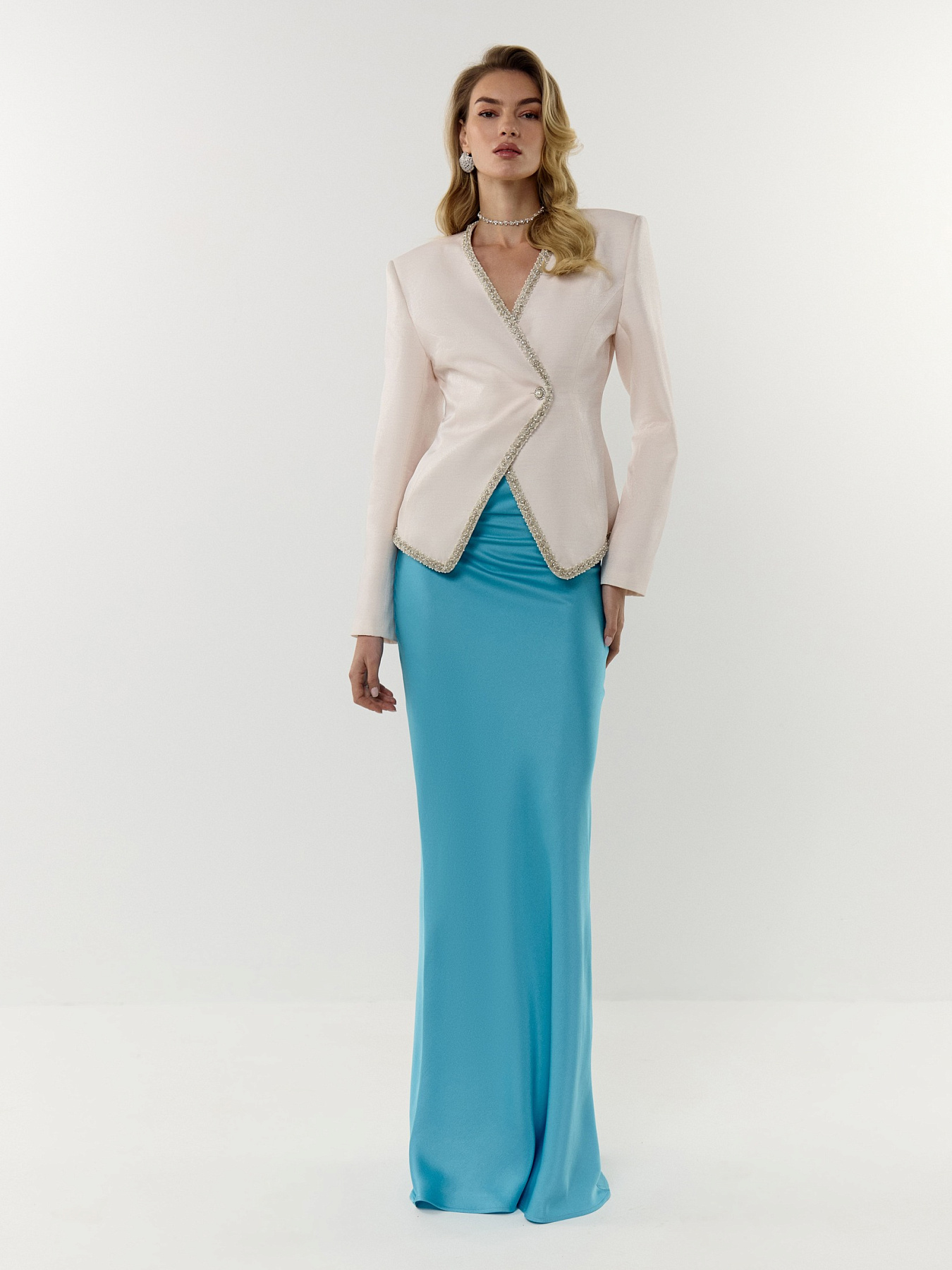 Жакет приталенного силуэта из итальянского костюмного шелка в спокойном жемчужном оттенке с мягким перламутровым отливом.