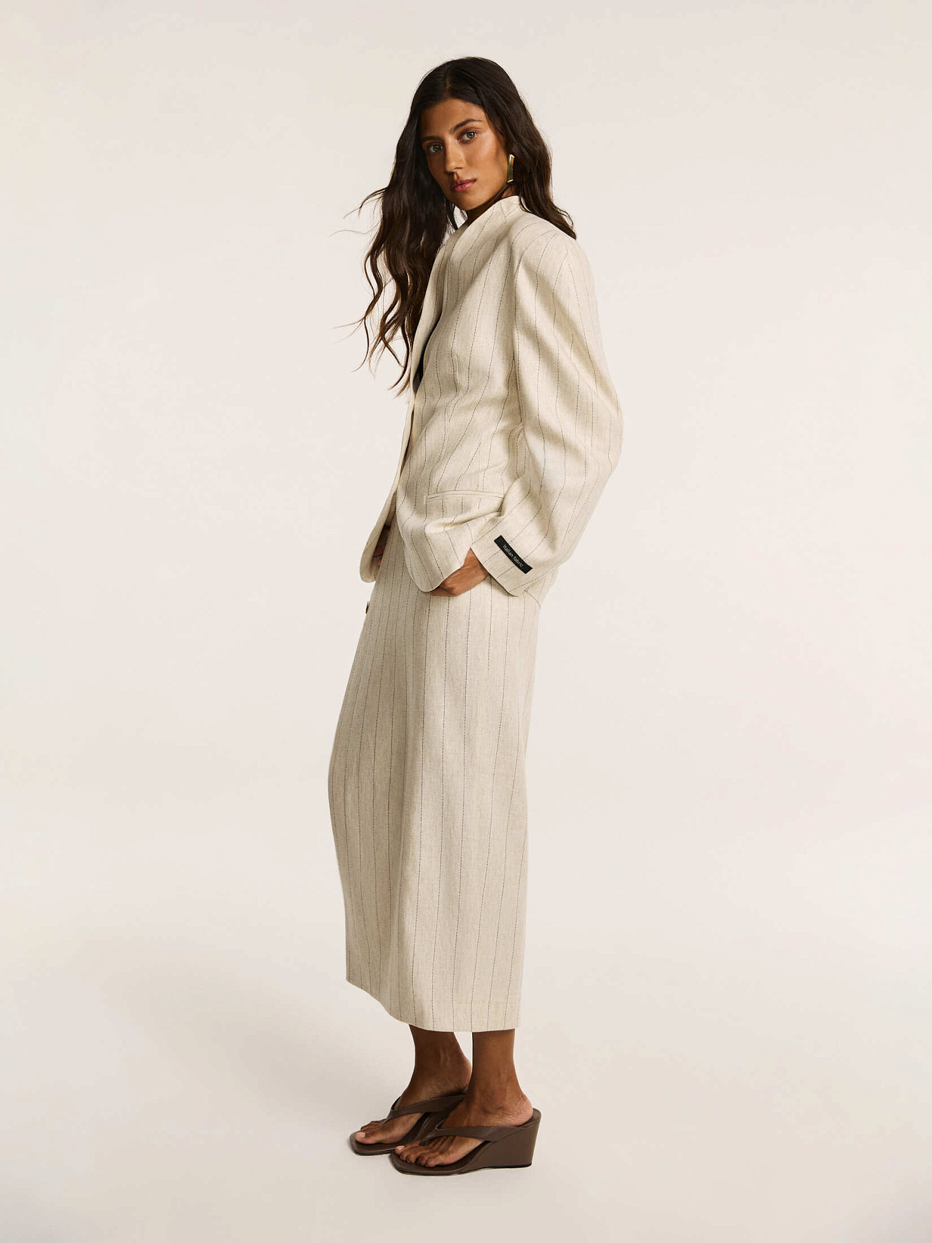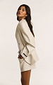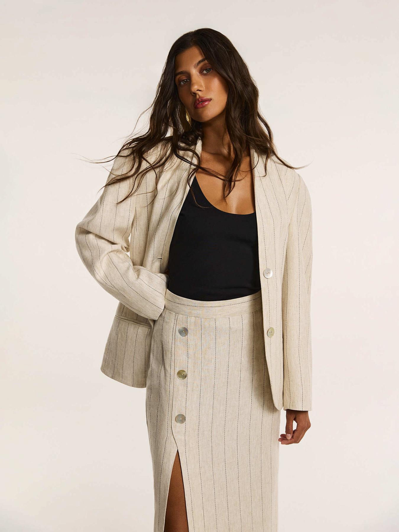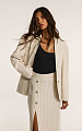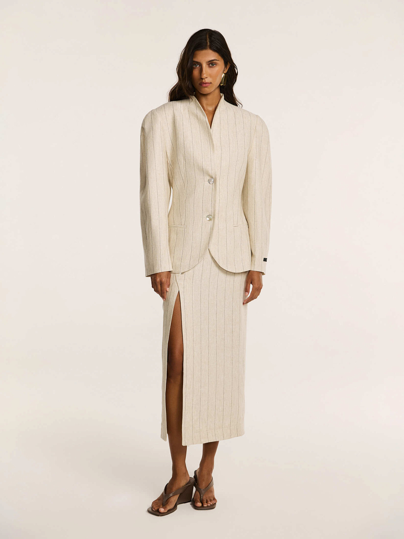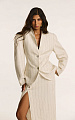Жакет приталенного силуэта в благородном бежевом оттенке в полоску — летний костюм в его лучшем прочтении.