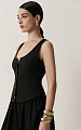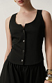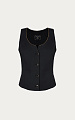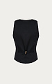 Жилет приталенного силуэта из итальянской костюмной шерсти. Глубокий округлый вырез горловины оформлен тесьмой из золотистого бисера, создающей мягкое сияние и деликатный акцент.