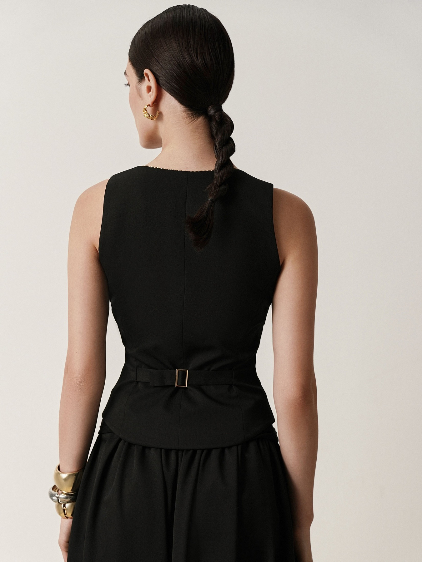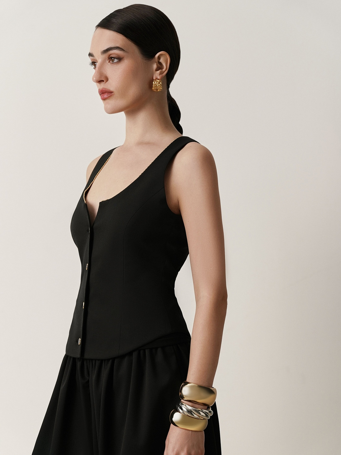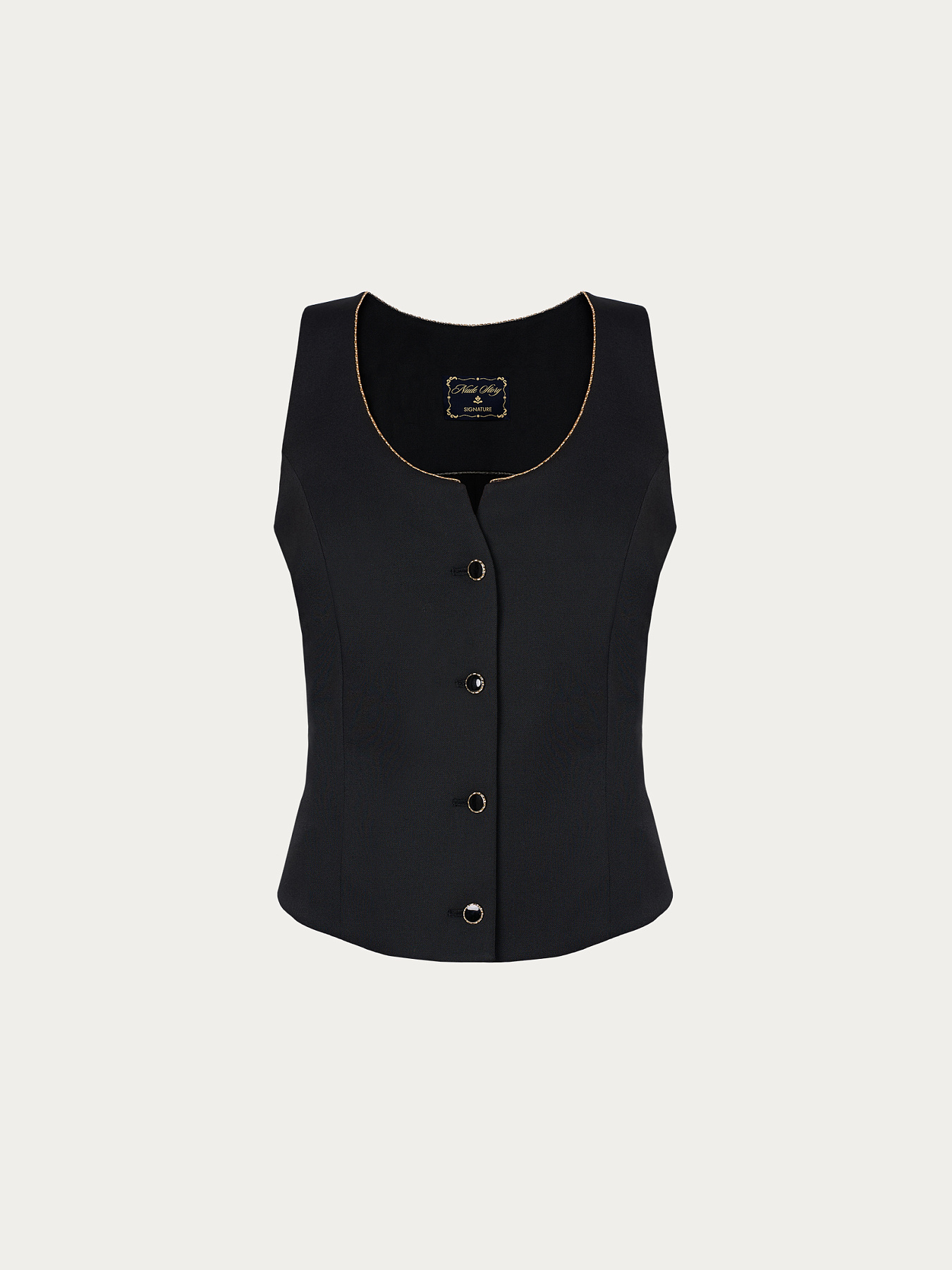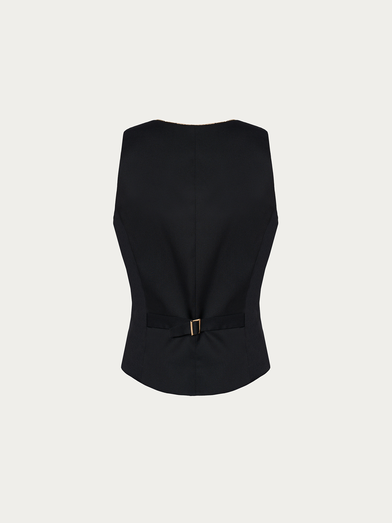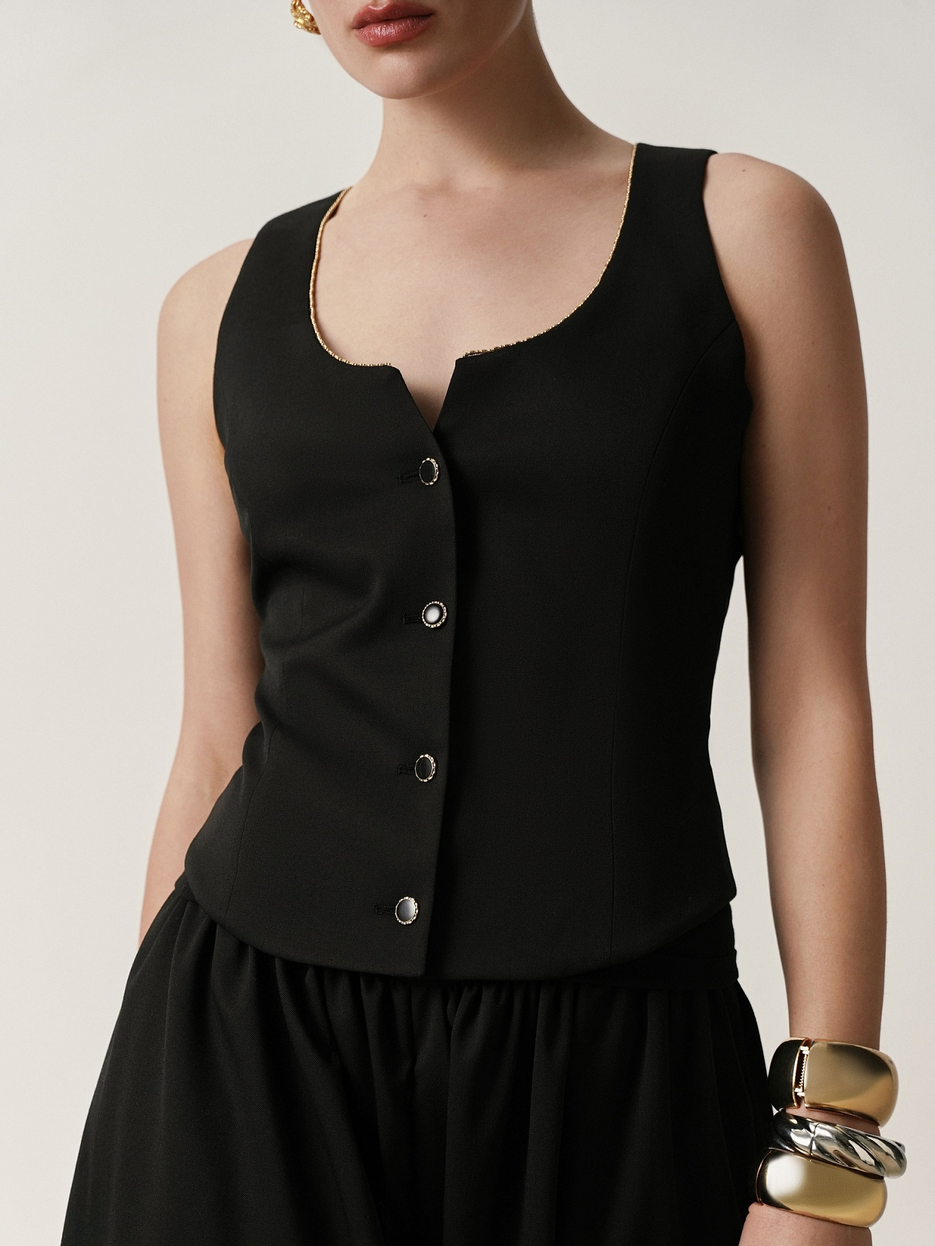 Жилет приталенного силуэта из итальянской костюмной шерсти. Глубокий округлый вырез горловины оформлен тесьмой из золотистого бисера, создающей мягкое сияние и деликатный акцент.