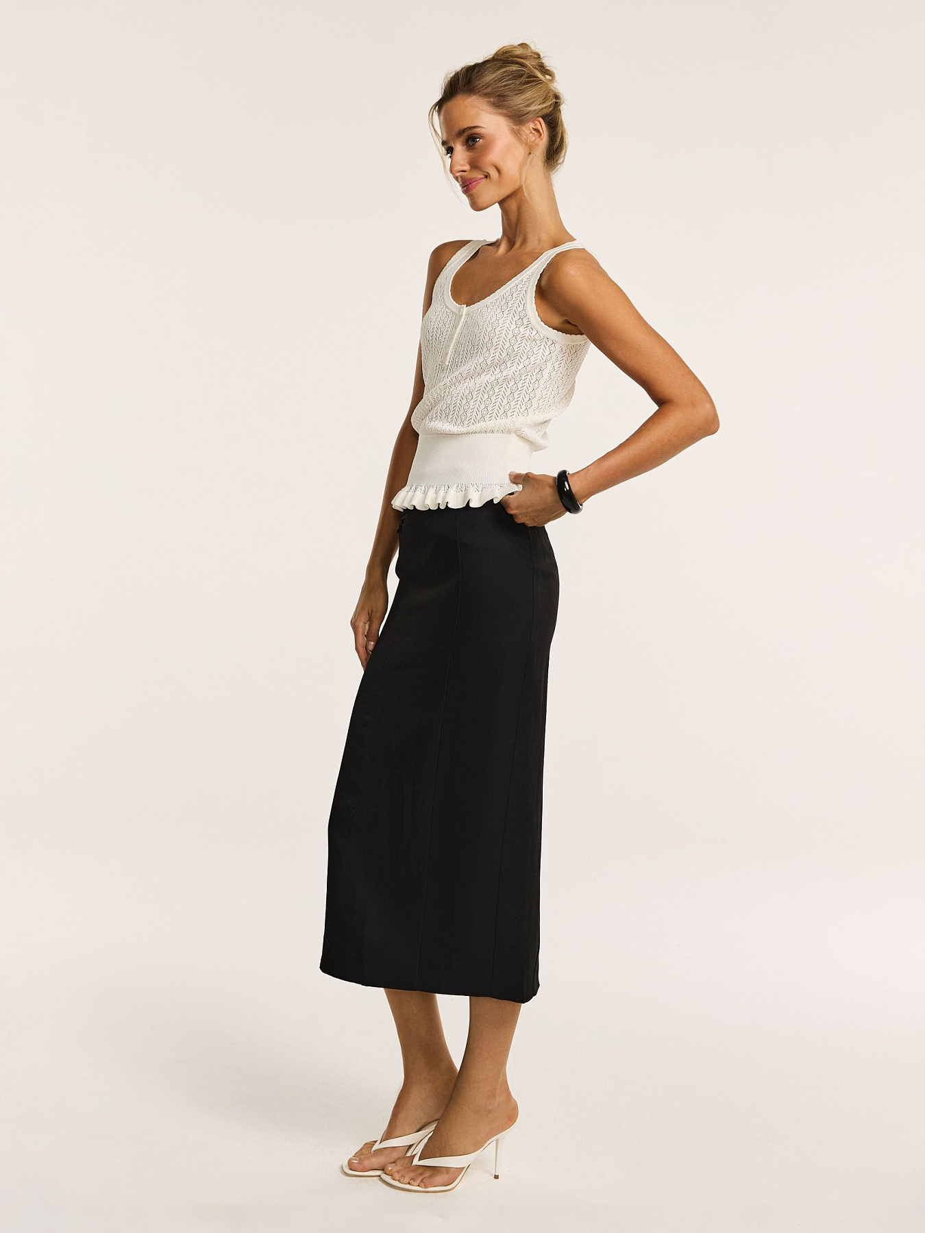 Широкая резинка на талии формирует приталенный силуэт, а трикотажная оборка по низу придаёт образу мягкость и лёгкость.