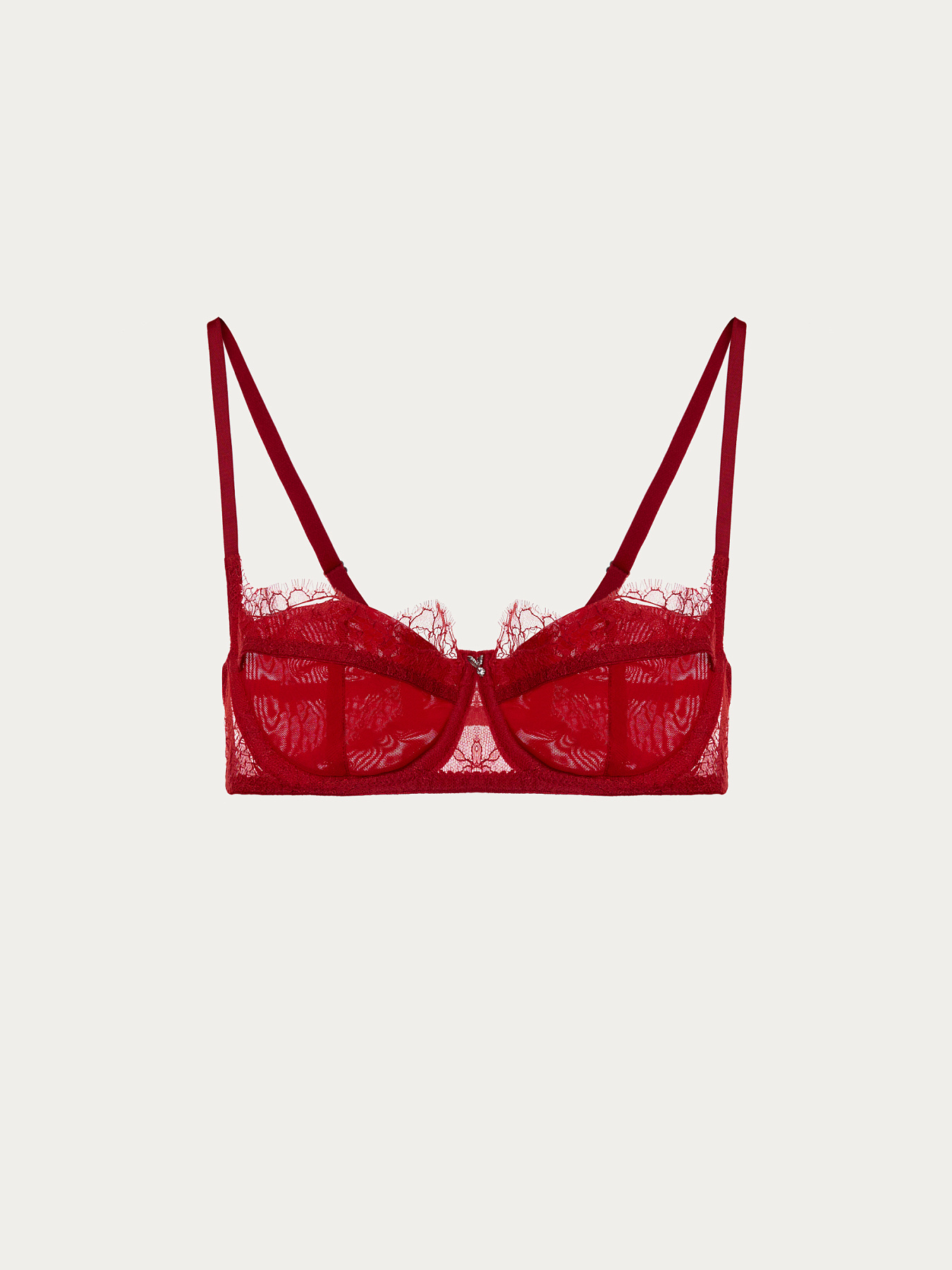 Бюстгальтер балконет в насыщенном красном оттенке, выполненный на мягкой бельевой сетке. Сверху проходит итальянское кружево — оно плотно ложится на груди по основе и не отходит при носке, сохраняя чистый, аккуратный силуэт.