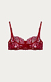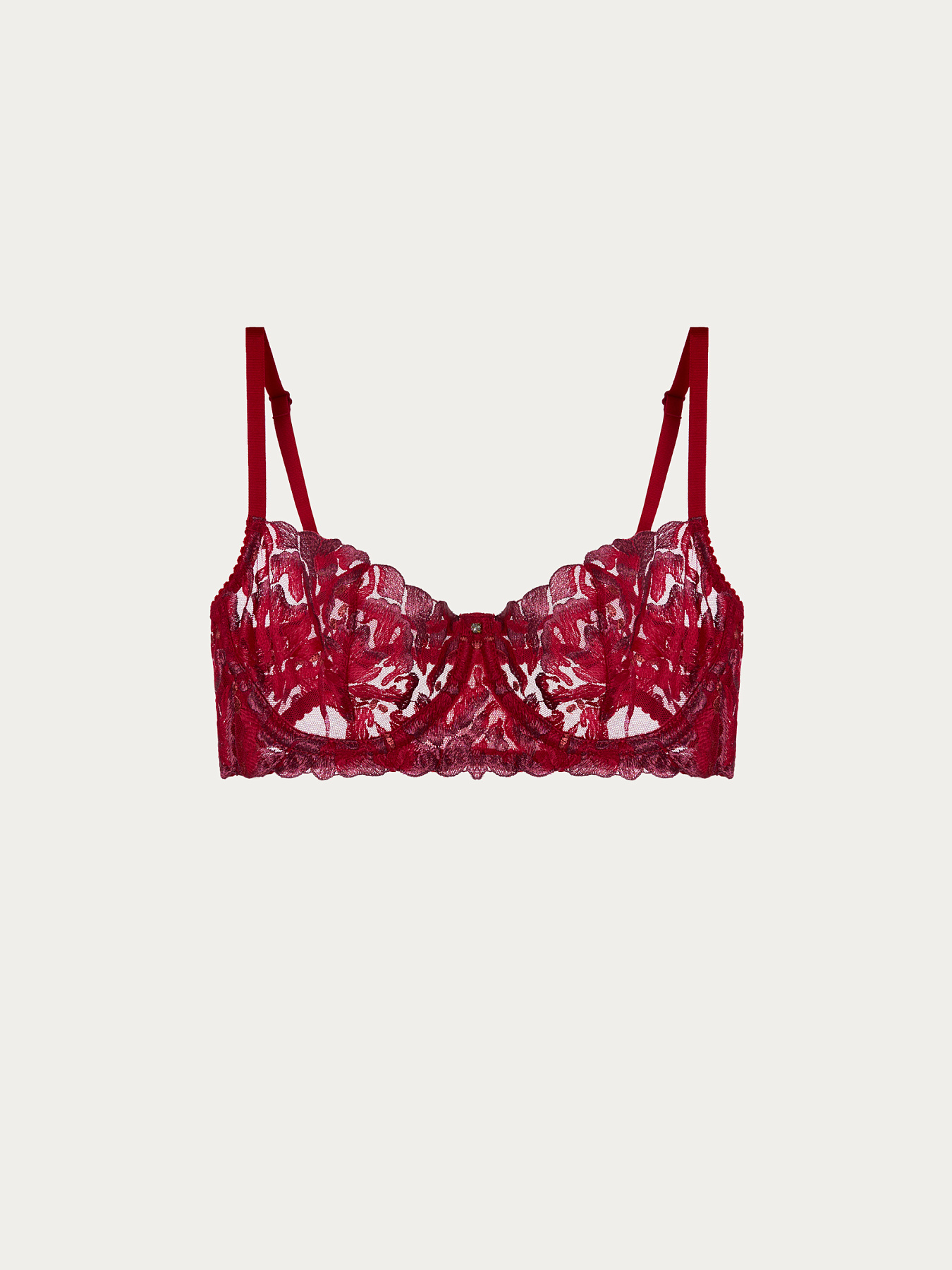 Бюстгальтер балконет на косточках с мягкими чашками из плотного итальянского кружева. В рисунке — изящное сочетание нескольких оттенков красного, в котором благодаря люрексовой нити по белью появляется мягкий мерцающий блеск, что делает изделие особенно насыщенным и утончённым.