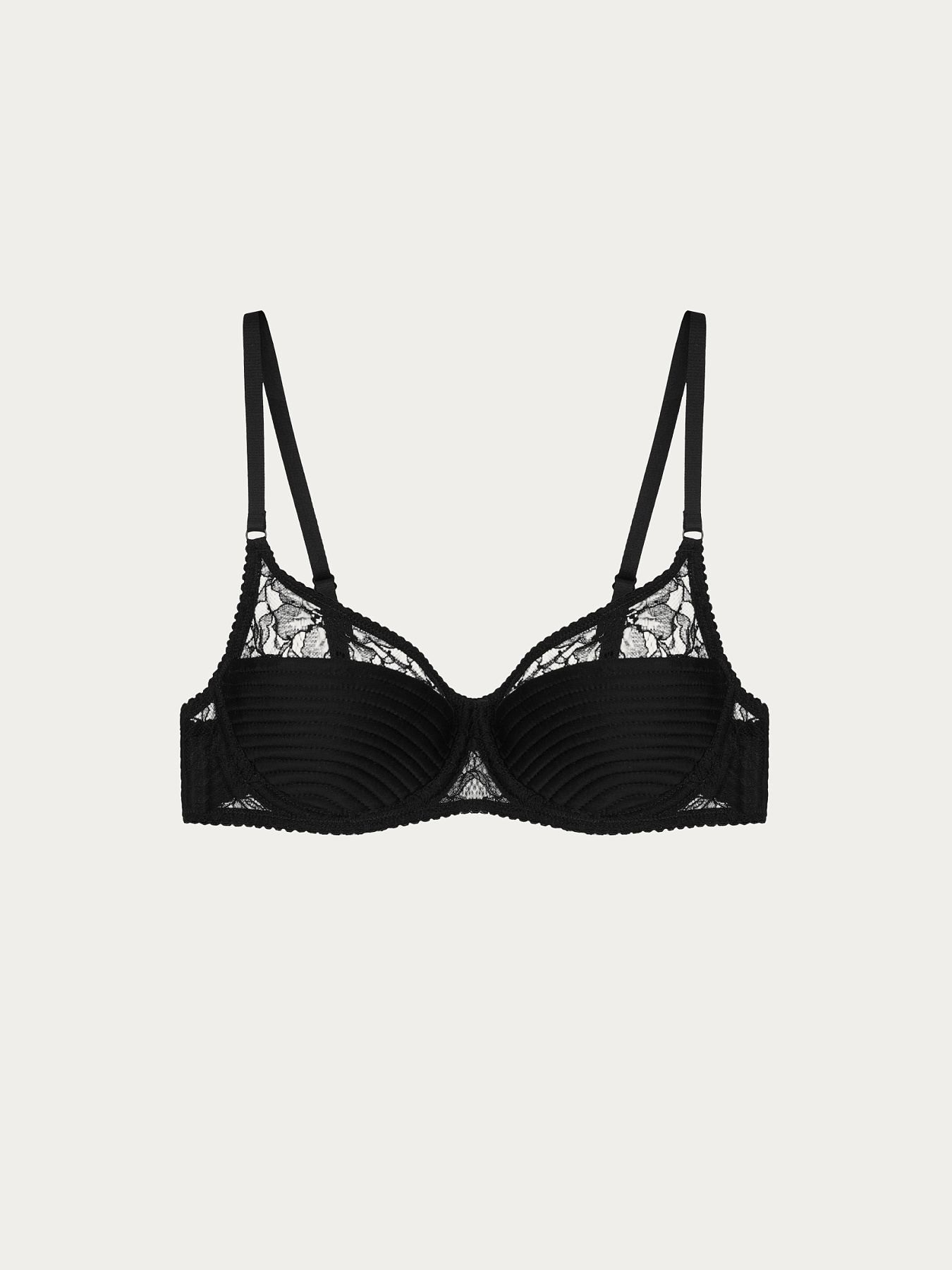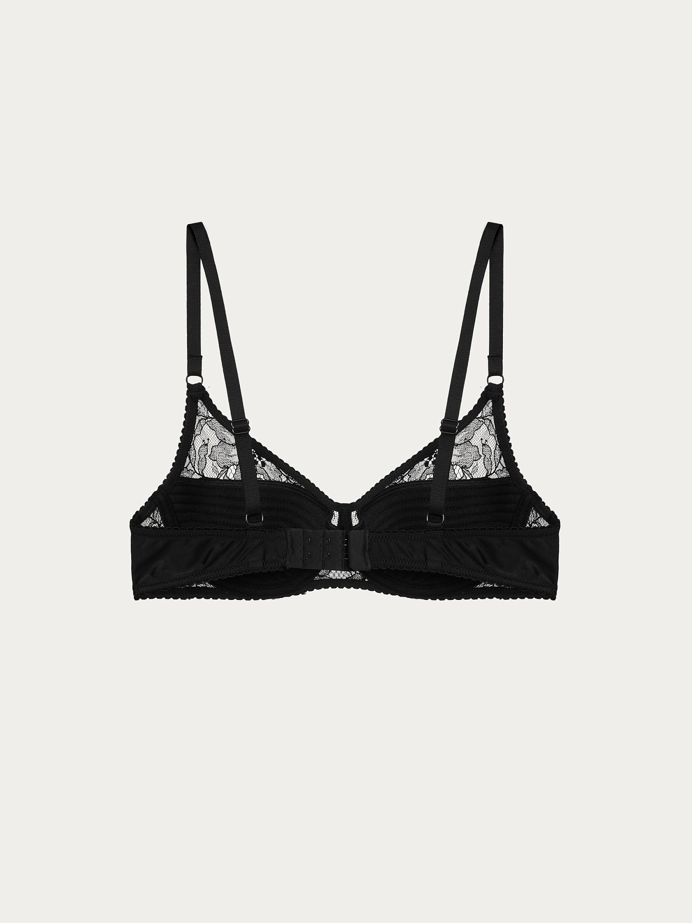 Бюстгальтер ручной работы черного цвета из нежного итальянского кружева с плотными чашками и глубоким вырезом.