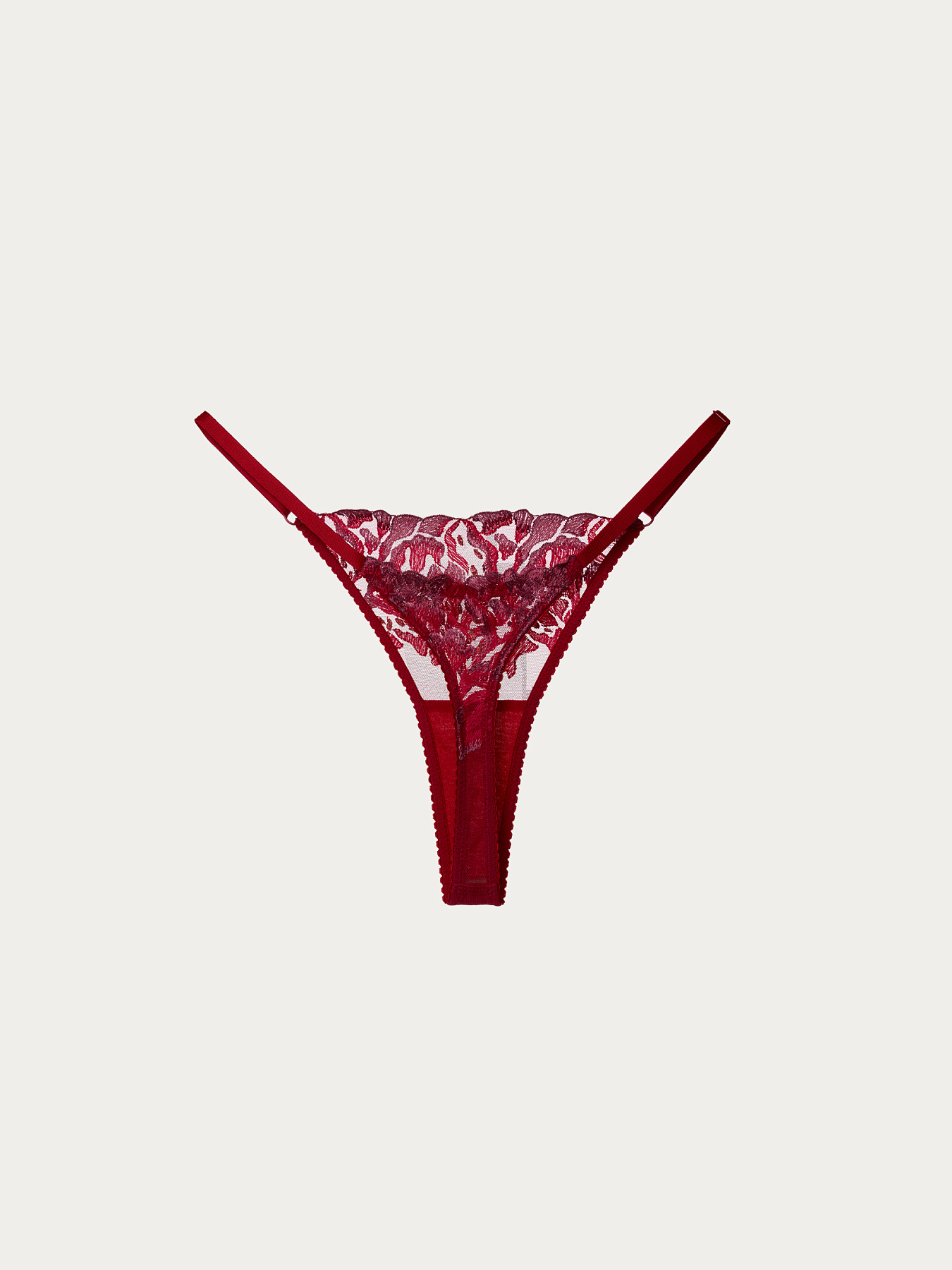 Стринги из итальянского кружева с регулируемыми боковыми элементами — посадку можно настроить под себя, сохраняя комфорт и аккуратную линию по бедру. Кружево выполнено с люрексовой нитью, благодаря чему изделие мягко мерцает и выглядит особенно изысканно. Модель дополнена хлопковой ластовицей, что делает её мягкой и удобной для повседневного ношения.