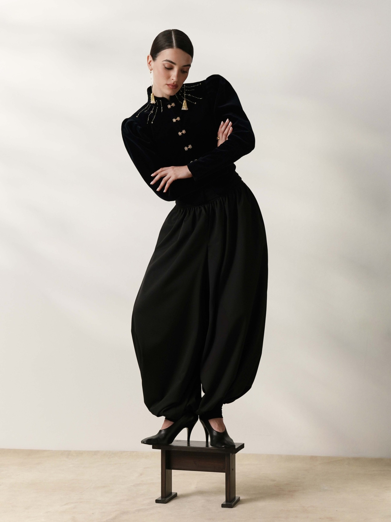 Эта форма отсылает к широко распространённой традиционной татарской поясной одежде — свободным штанам с широким шагом, отличавшимся удобством и пластичностью кроя. Акцент сделан на узких частях фигуры — талии и щиколотках, оформленных манжетами и отрезным поясом из трикотажной ткани-компаньона.