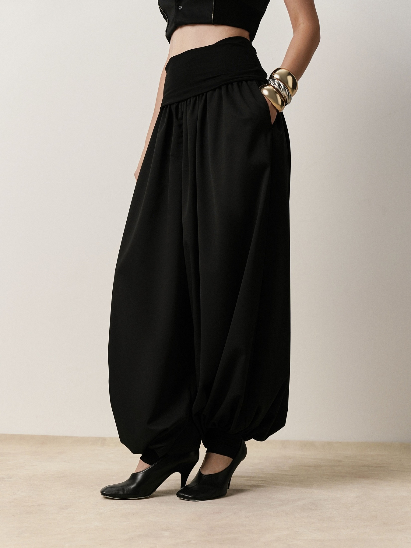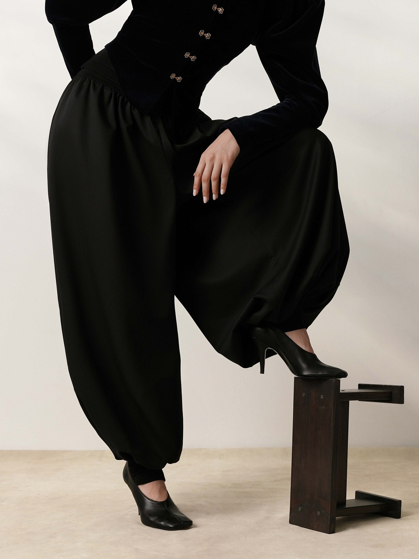 Брюки объемного кроя из итальянской костюмной шерсти. Благодаря сборке по верхнему и нижнему срезам создается характерный объем, при этом силуэт остается легким и пропорциональным.