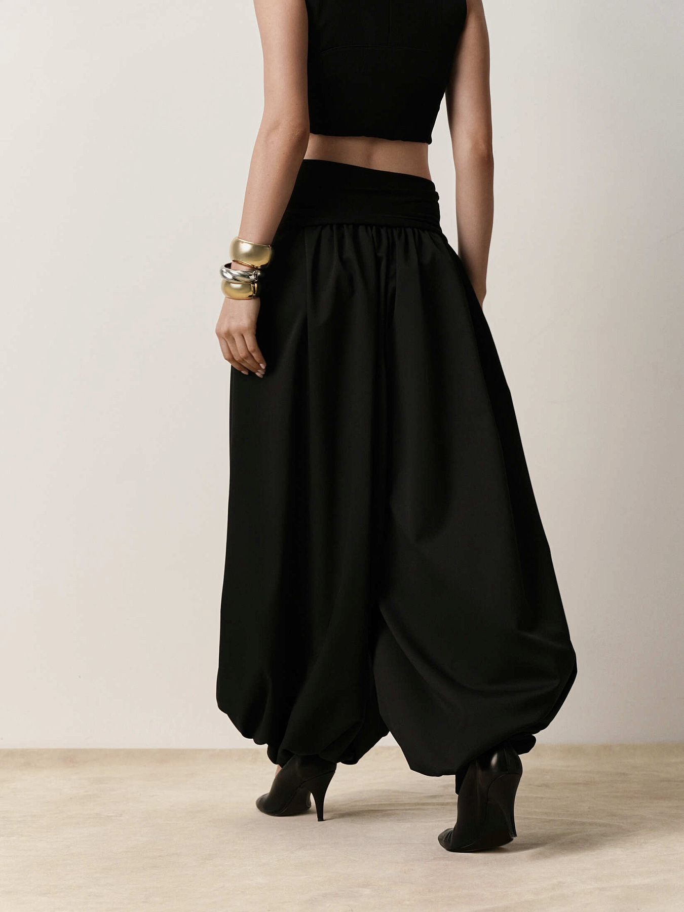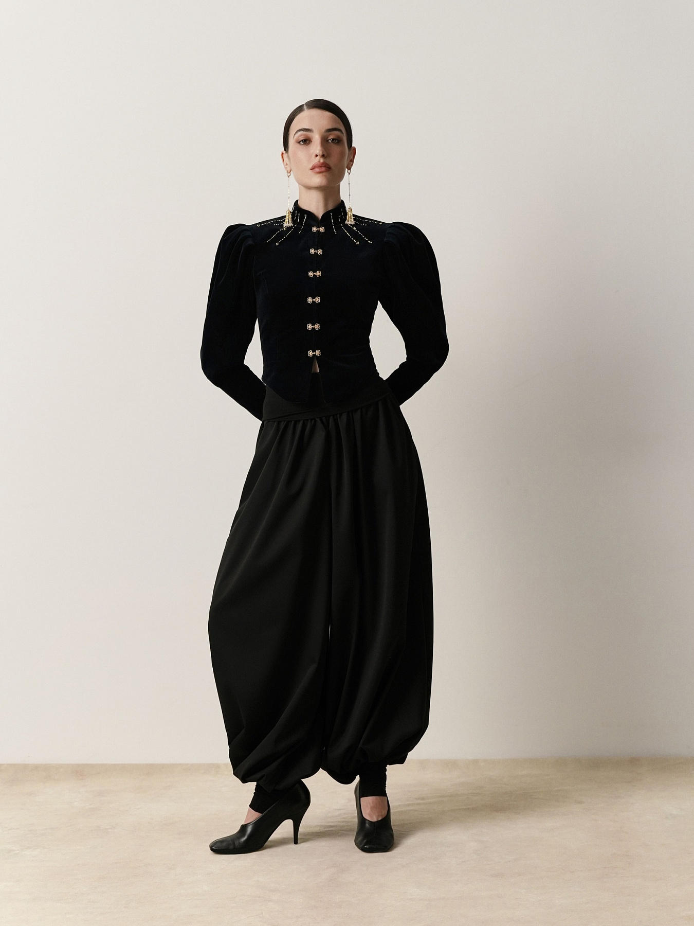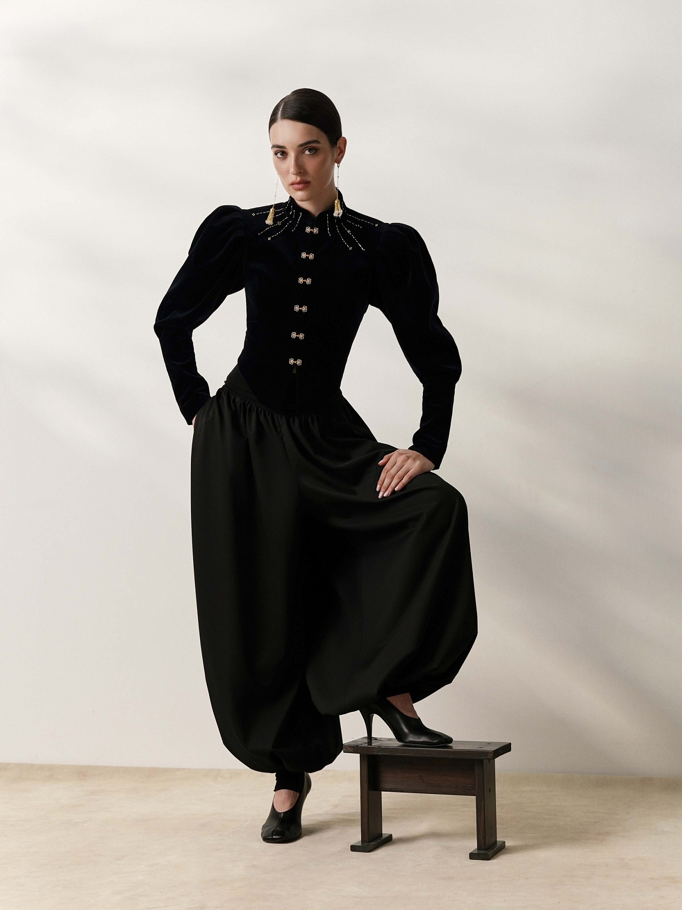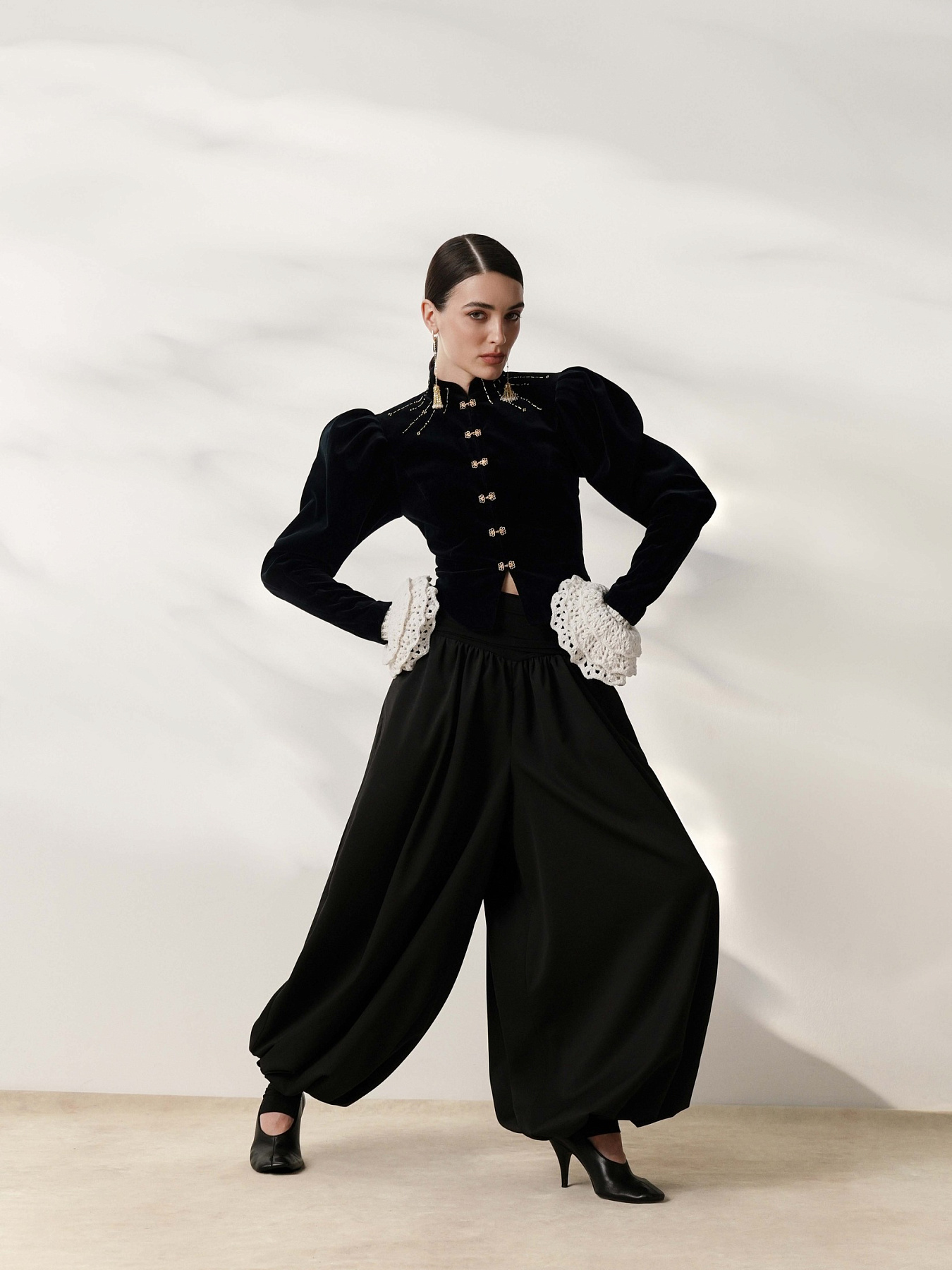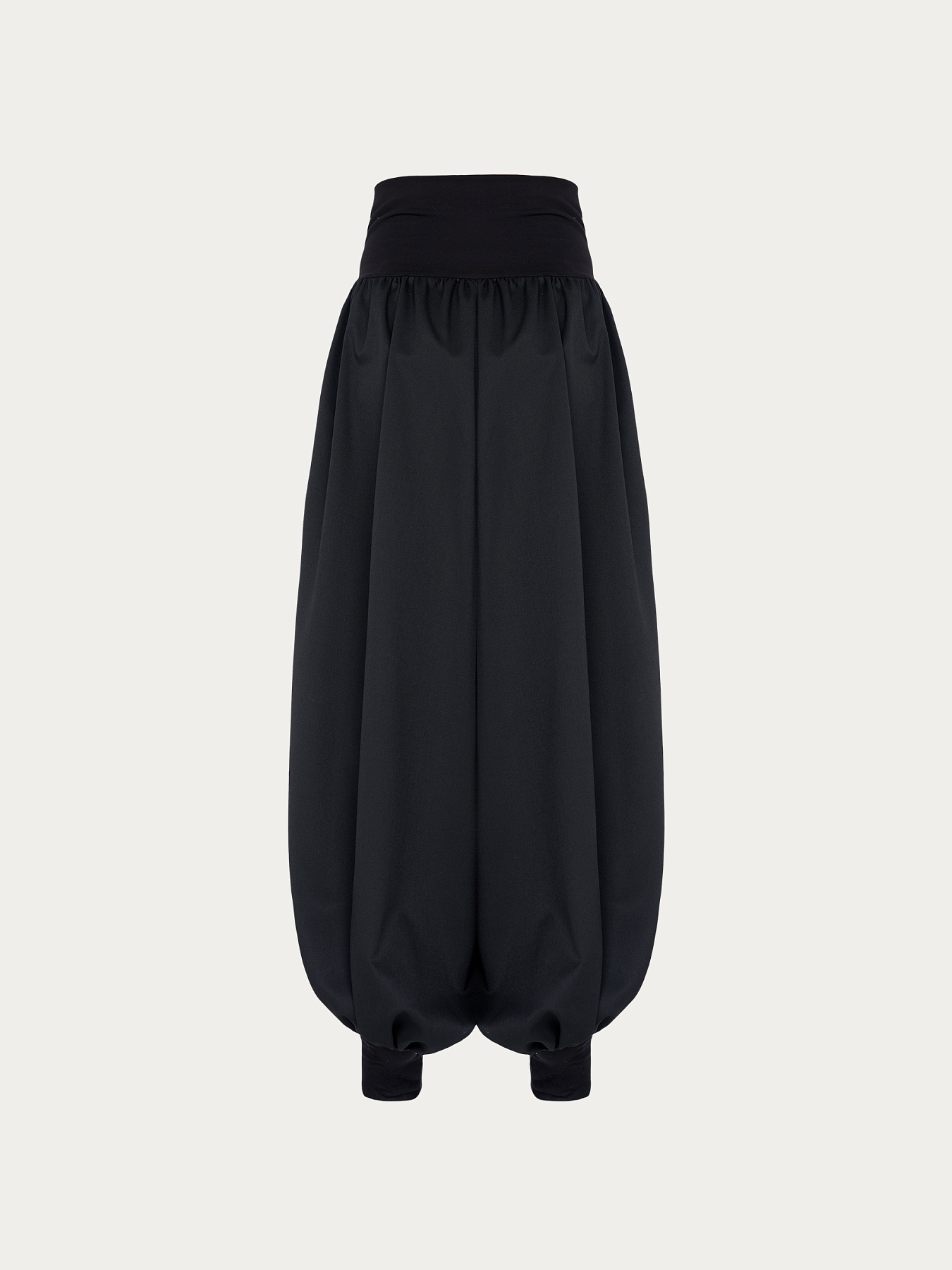 Эта форма отсылает к широко распространённой традиционной татарской поясной одежде — свободным штанам с широким шагом, отличавшимся удобством и пластичностью кроя. Акцент сделан на узких частях фигуры — талии и щиколотках, оформленных манжетами и отрезным поясом из трикотажной ткани-компаньона.