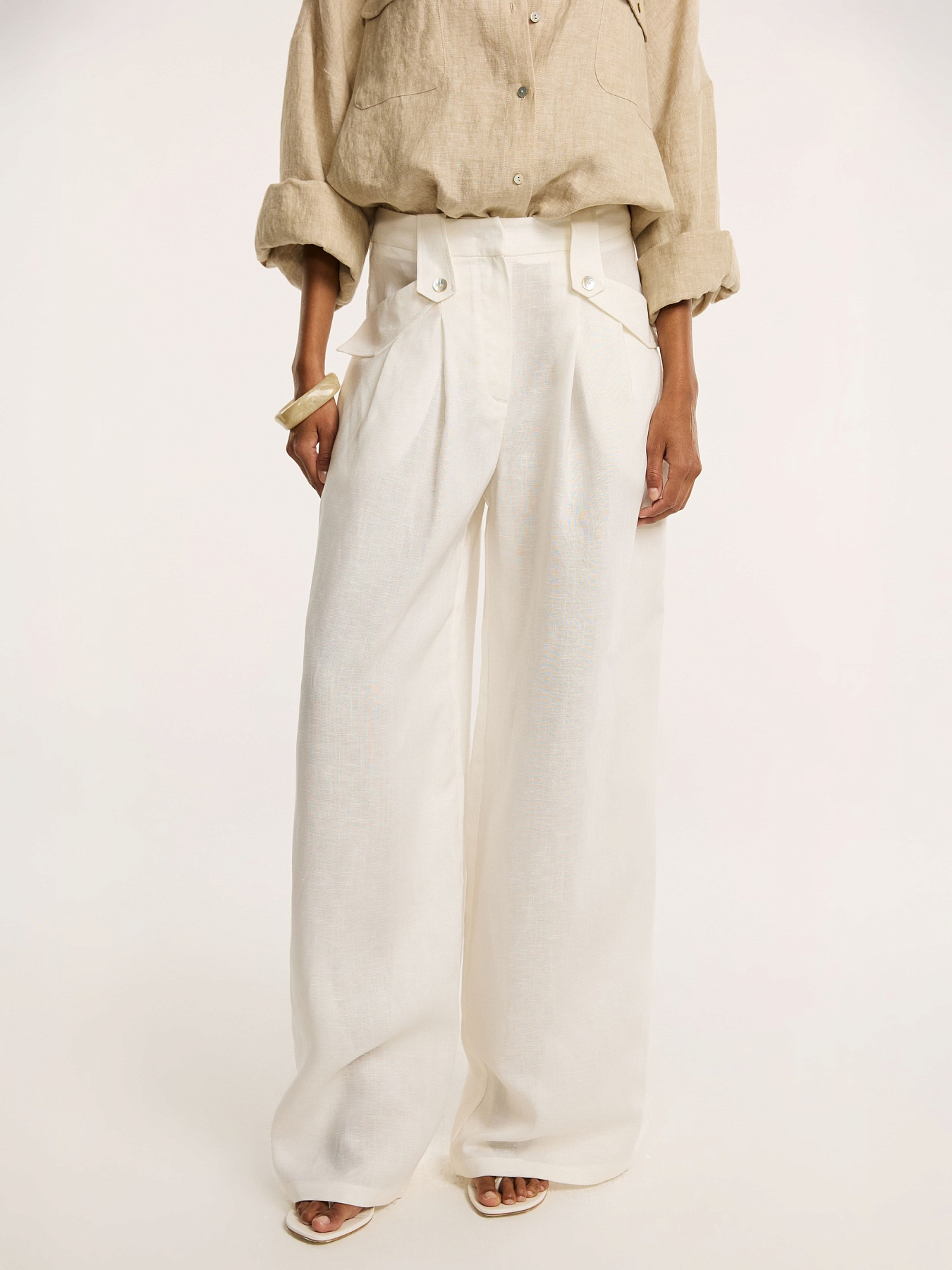 Брюки объёмного прямого кроя в молочном оттенке — лаконичная модель, в которой всё решает силуэт.